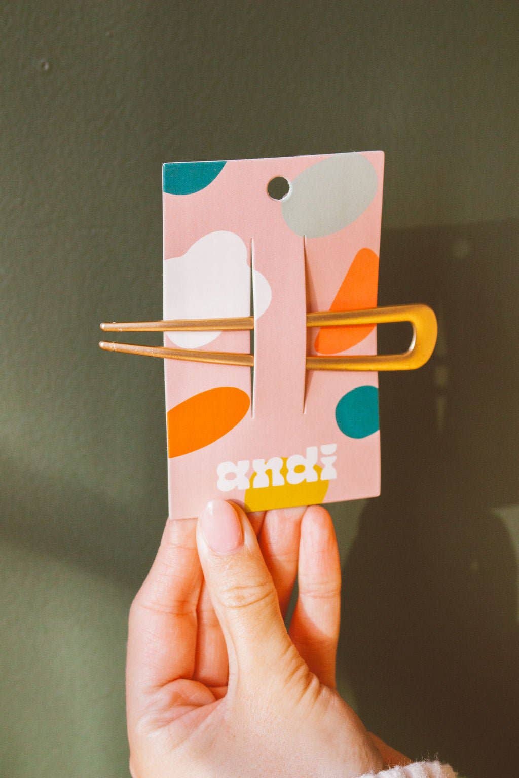 Hair Pins are the next claw clip! They are such a simple and beautiful tool that easily holds your hair in so many different ways. Andi’s hair pins match any vibe, any outfit, and any occasion. This pin is a beautiful U-shape, in a matte, gold metal. It will look stunning in your hair, and will be so comfortable, you'll forget it's even there. measuring 4.5 inches long .75 wide