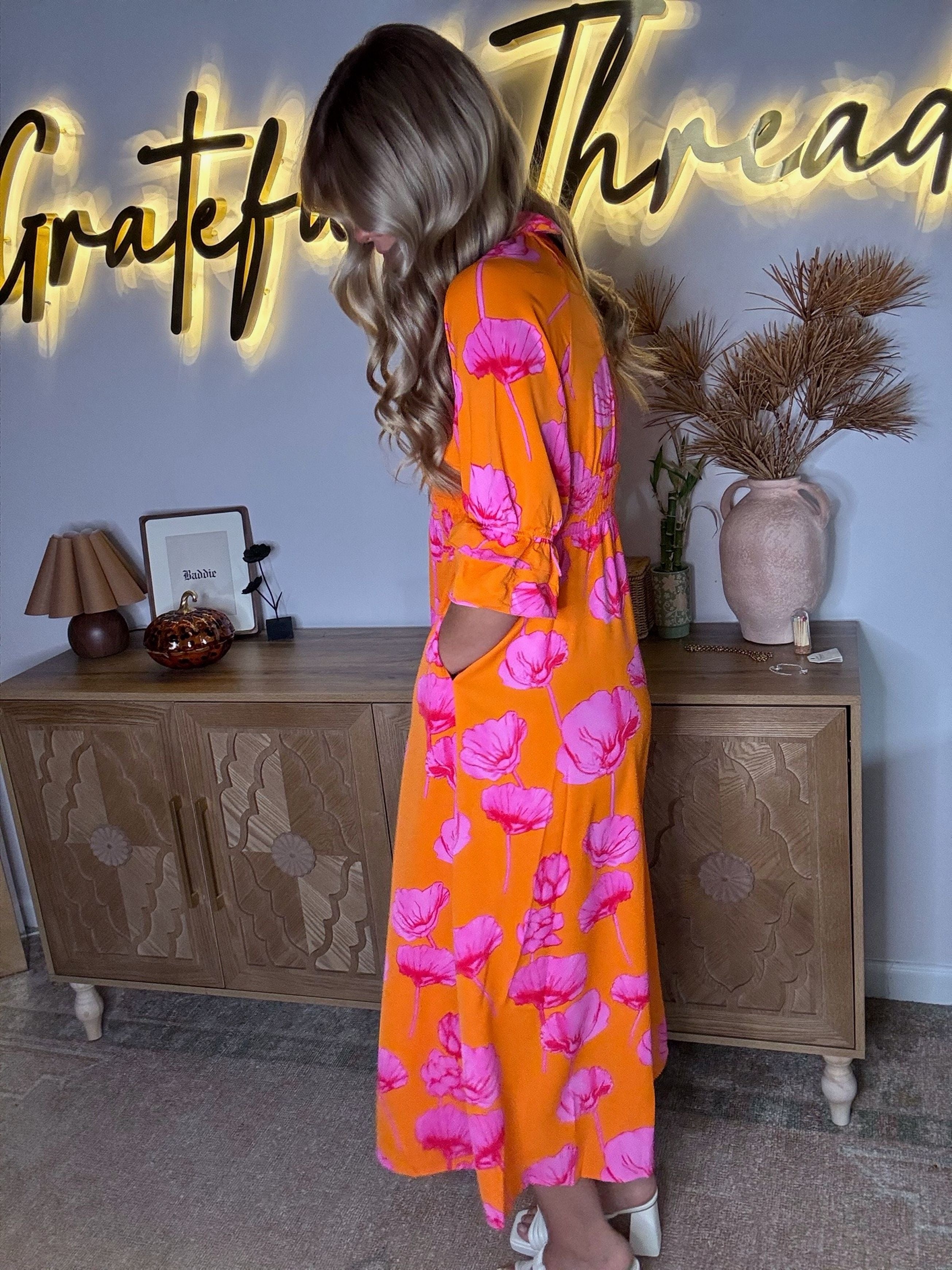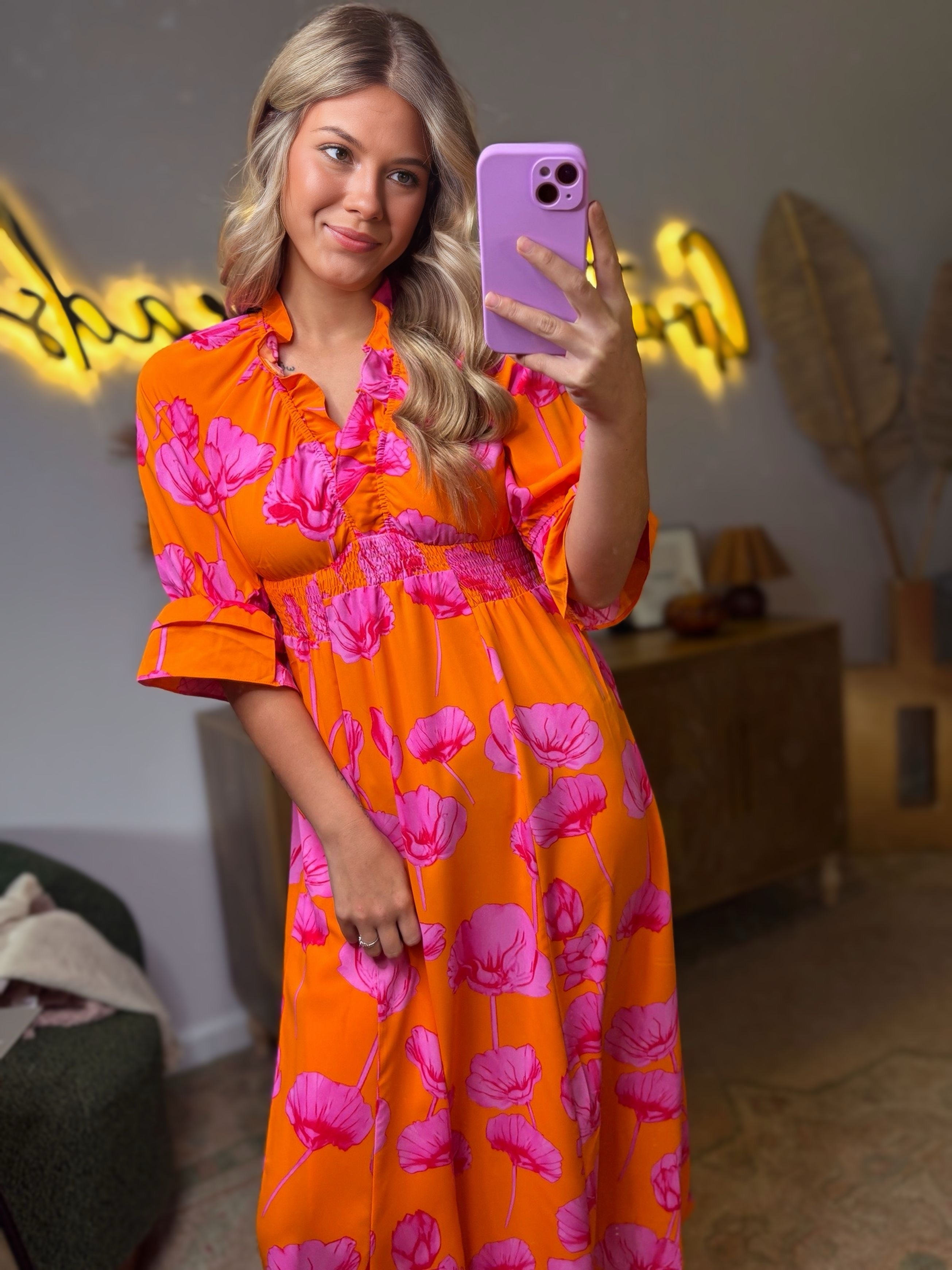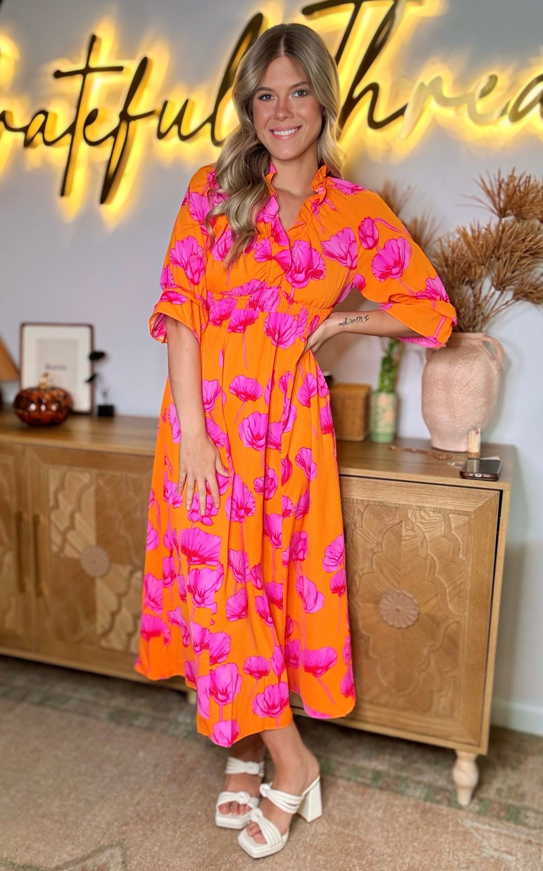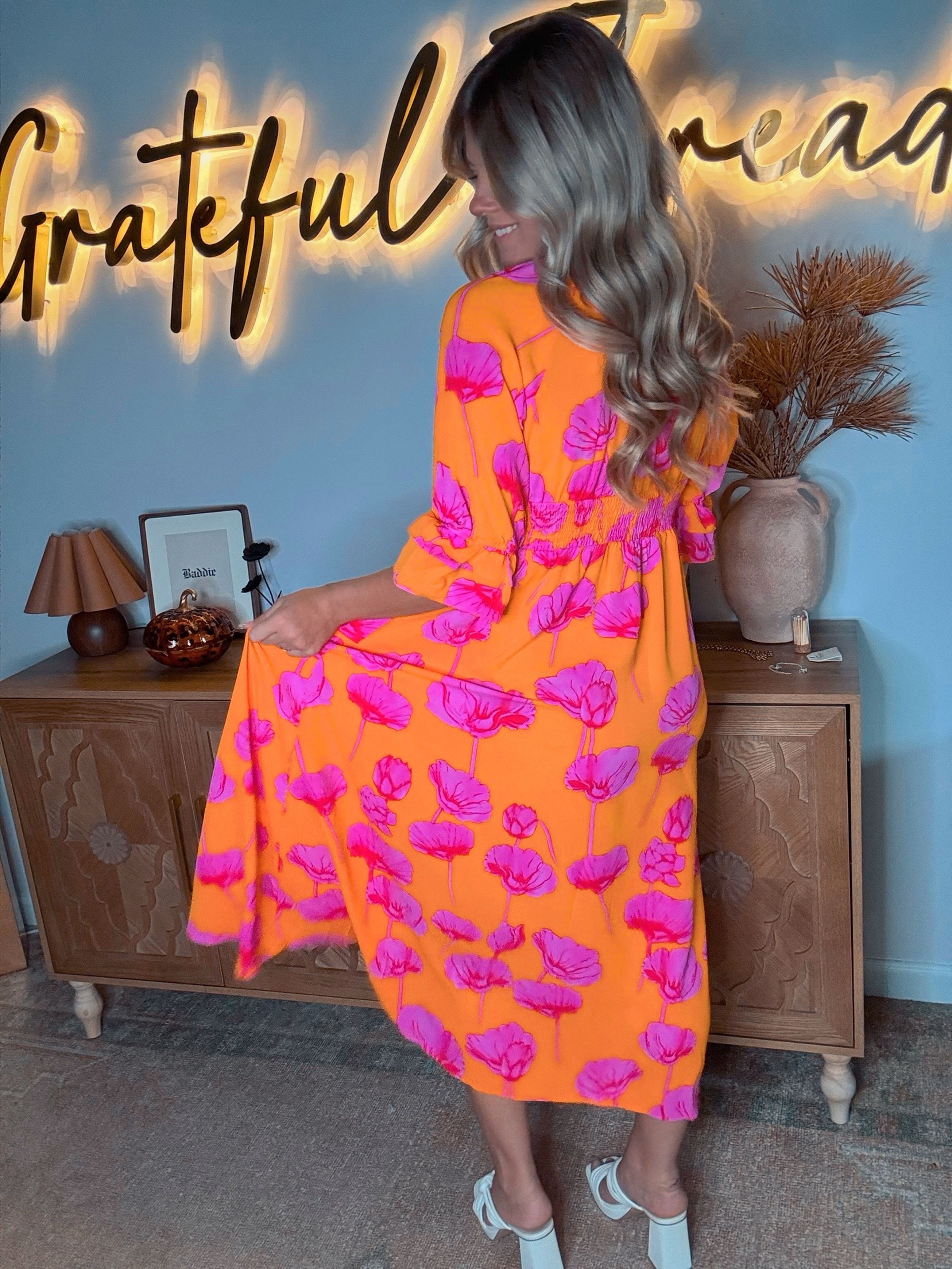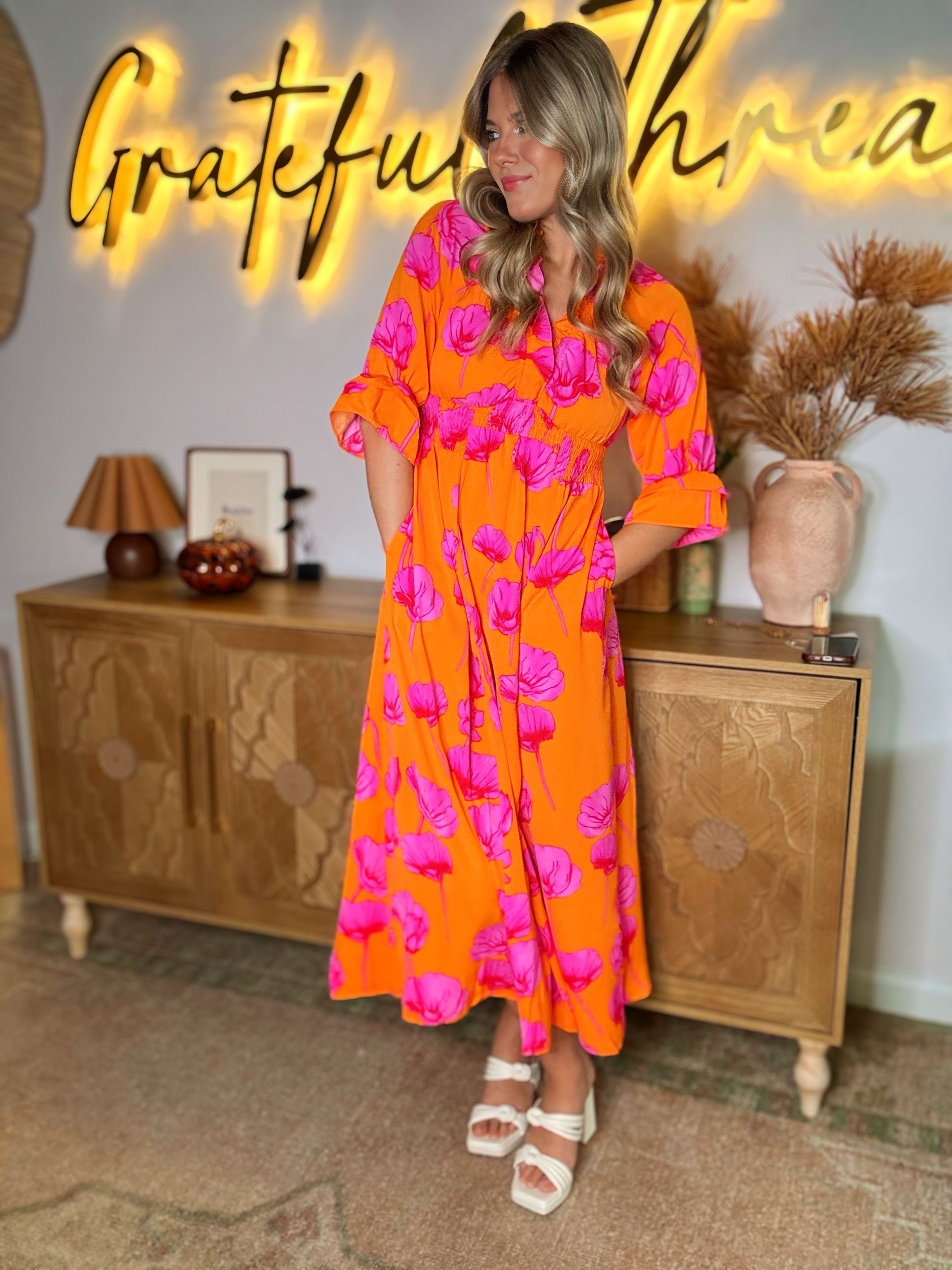 Orange Floral Print Frilly Smocked V Neck 3/4 Sleeve Long Dress