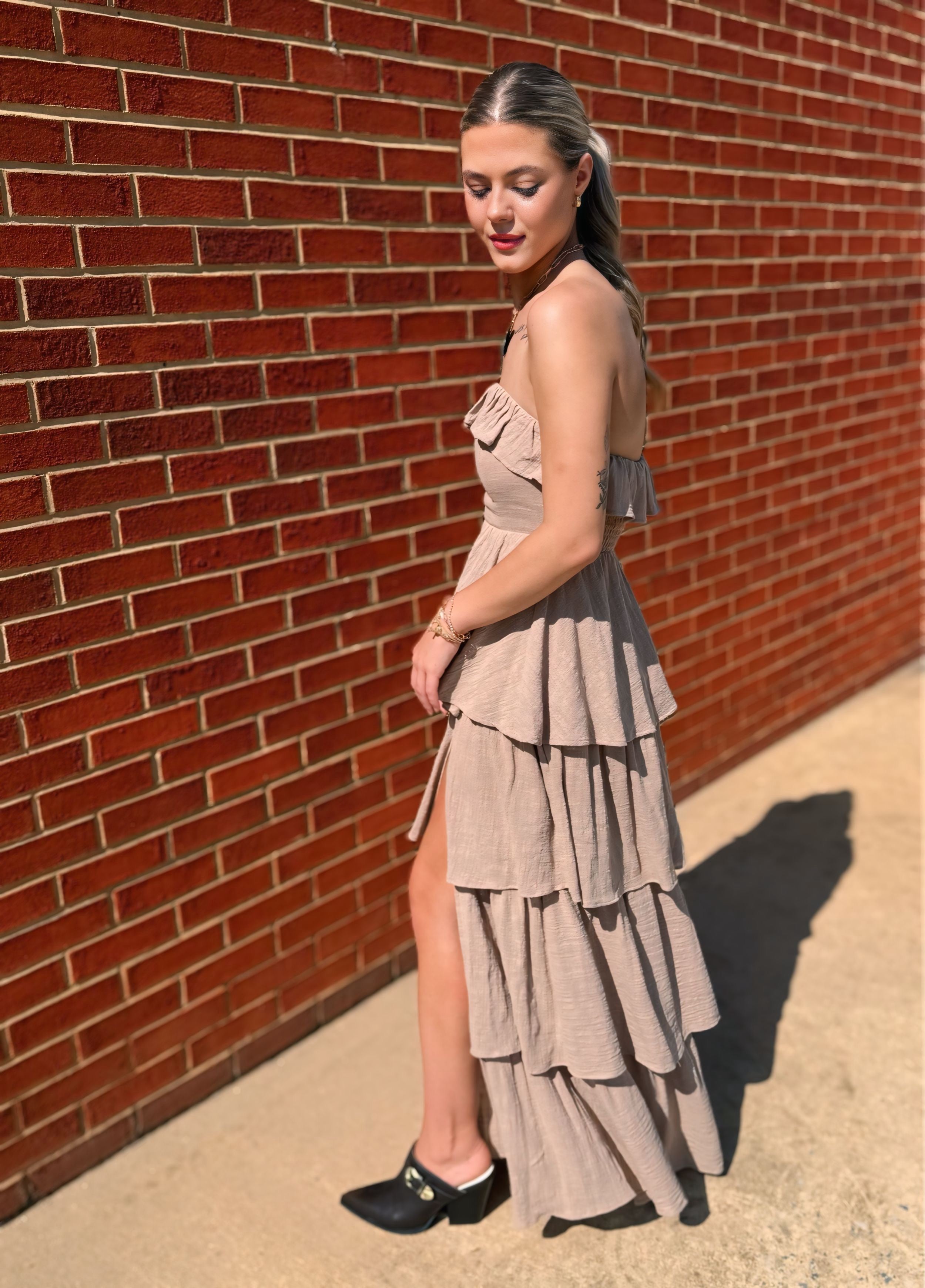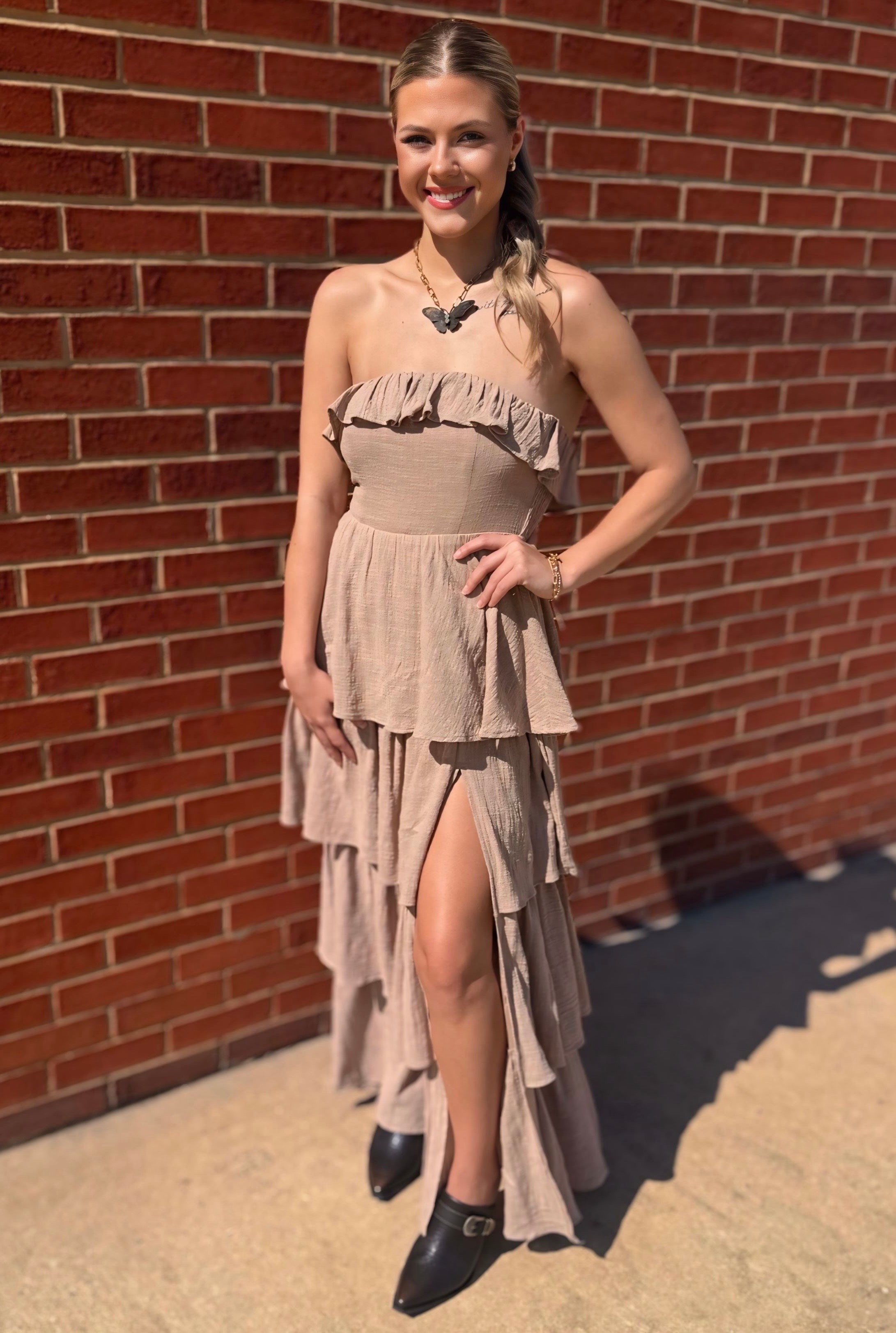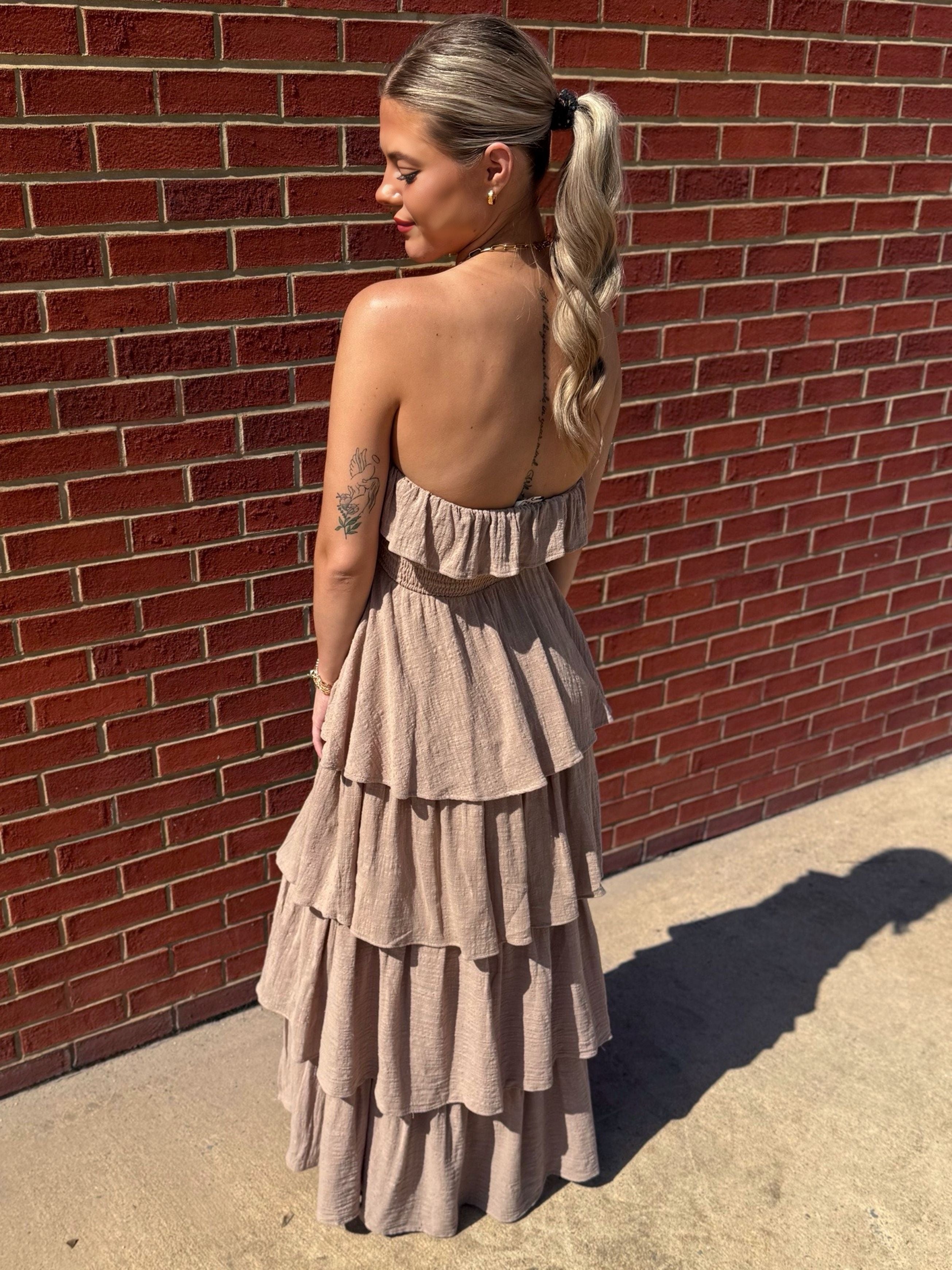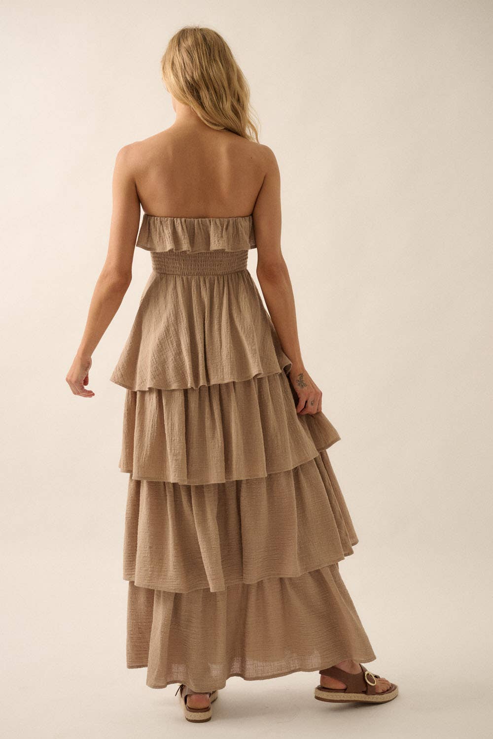 Sand Textured Cotton Strapless Tiered Ruffle Maxi Dress