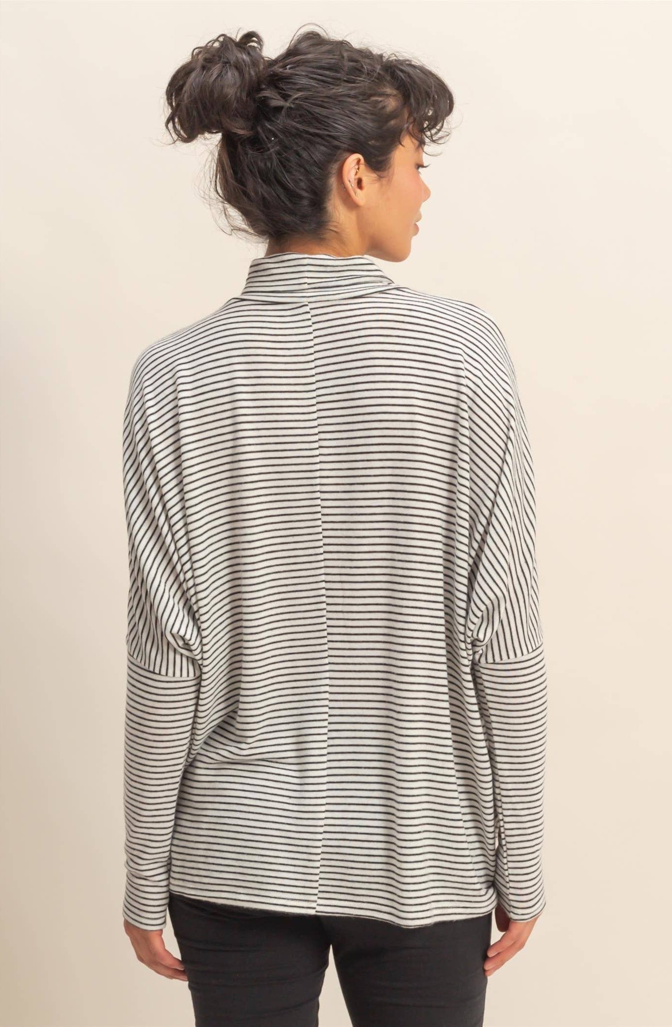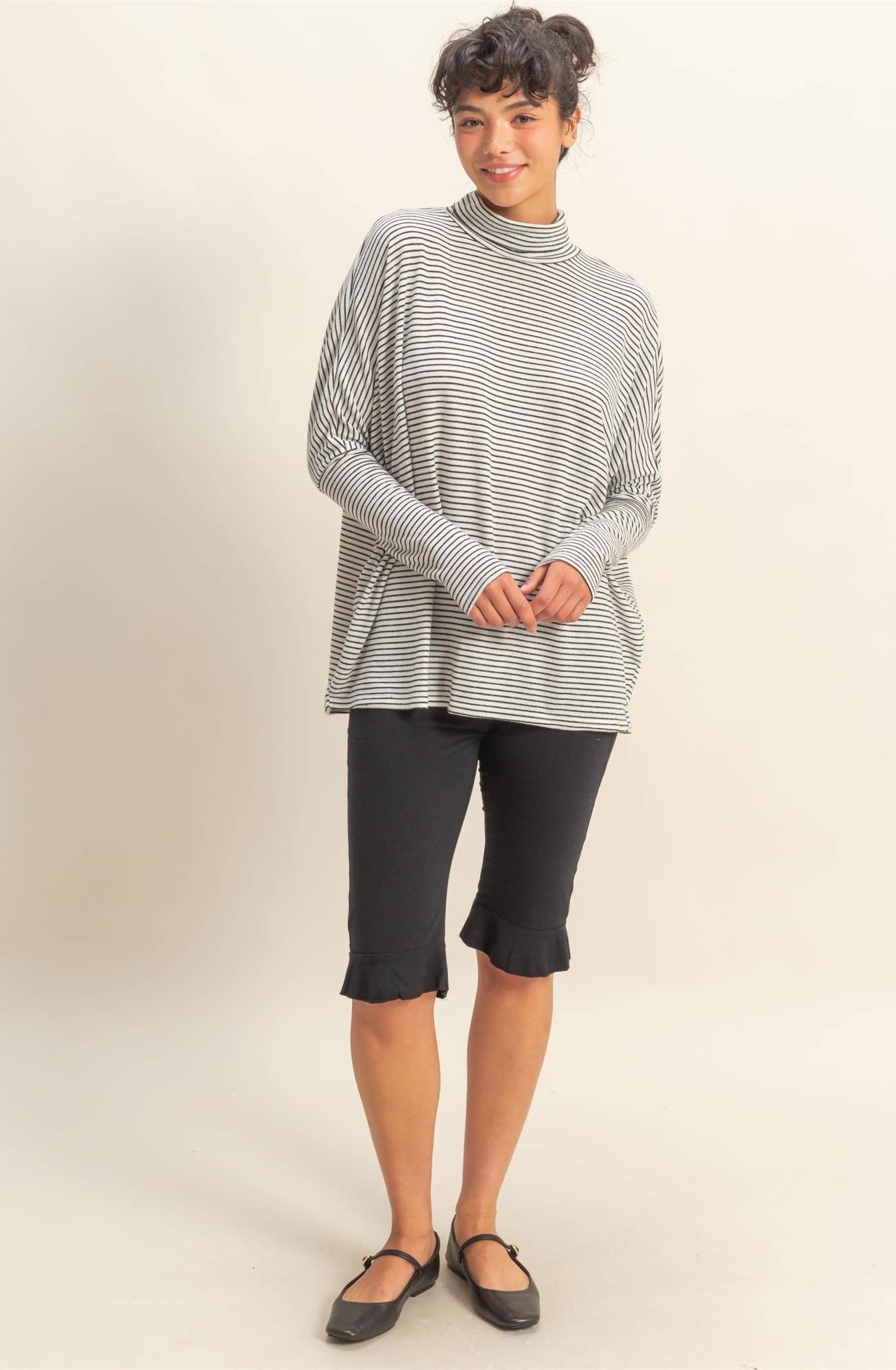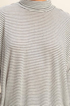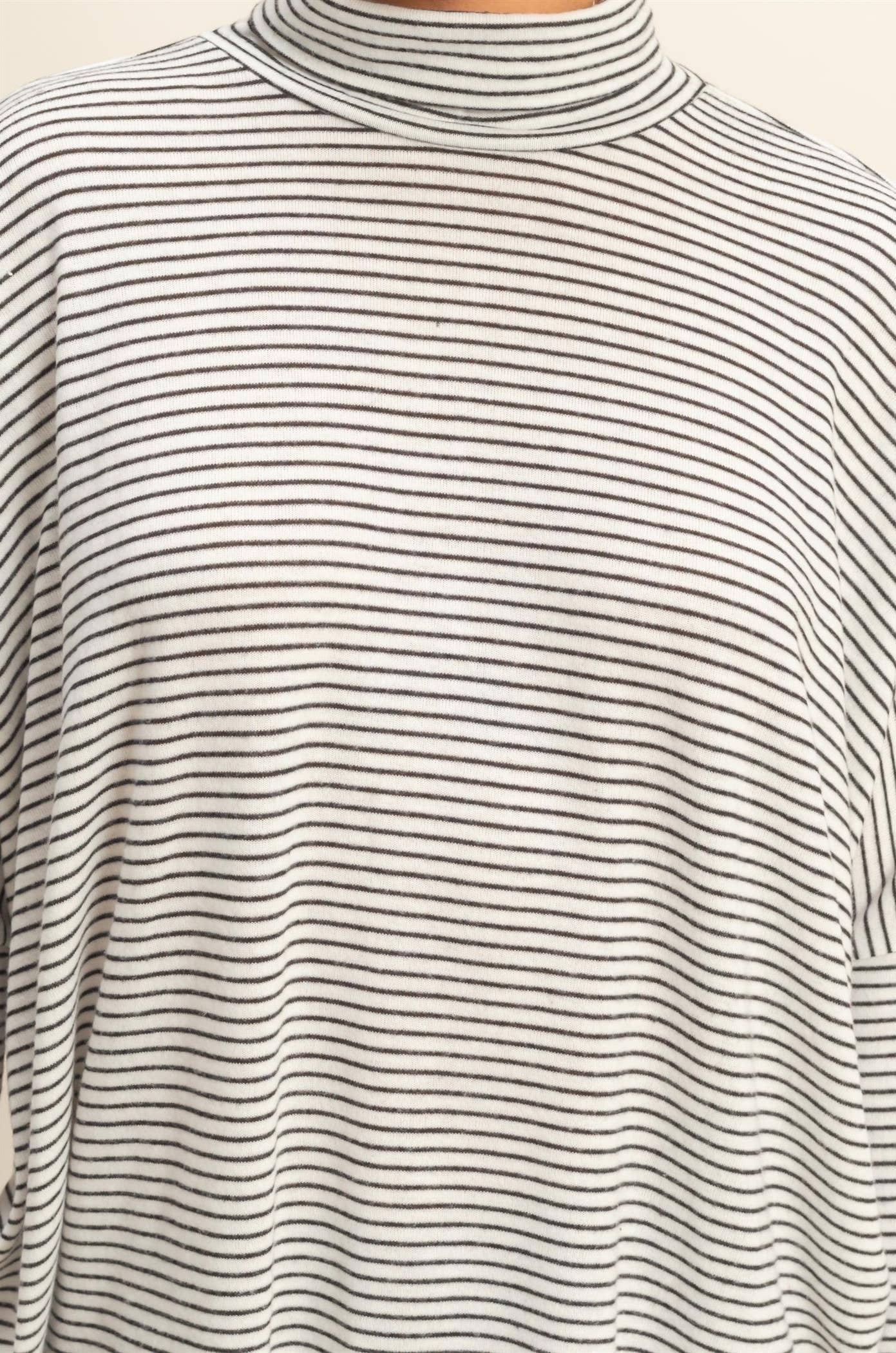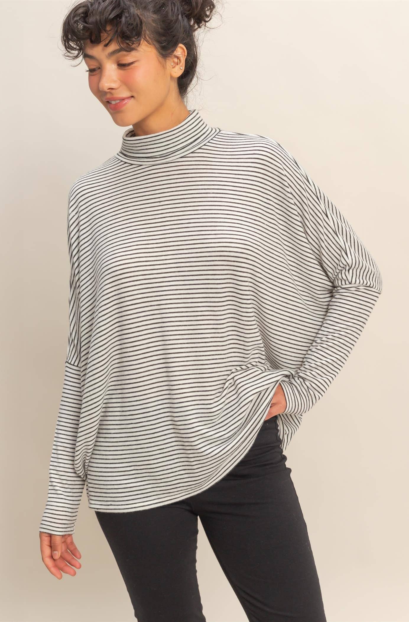 This oversized striped turtleneck top strikes the perfect balance between comfort and effortless style. Ideal for casual outings, its draped silhouette and soft fabric ensures ease of movement. Pair it with skinny jeans or leggings for an ensemble that's both stylish and practical. A versatile piece, it's suitable for layering during cooler months or wearing solo in milder weather. Model Is 5' 7" Tall, 32" Chest, 25" Waist, 36" Hips And Wearing A Size Small Imported. Designed In The USA