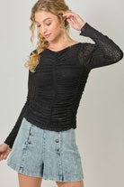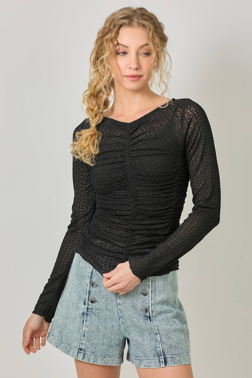 Strategic ruching along the front, sides, and back creates a flattering, body-skimming silhouette that adds dimension and shape without sacrificing comfort. The delicate lettuce hem detailing softens the look, offering the perfect balance of romantic and edgy.