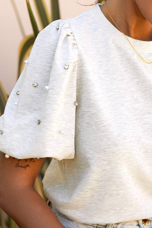Rhinestone Pearl Puff Half Sleeve Top