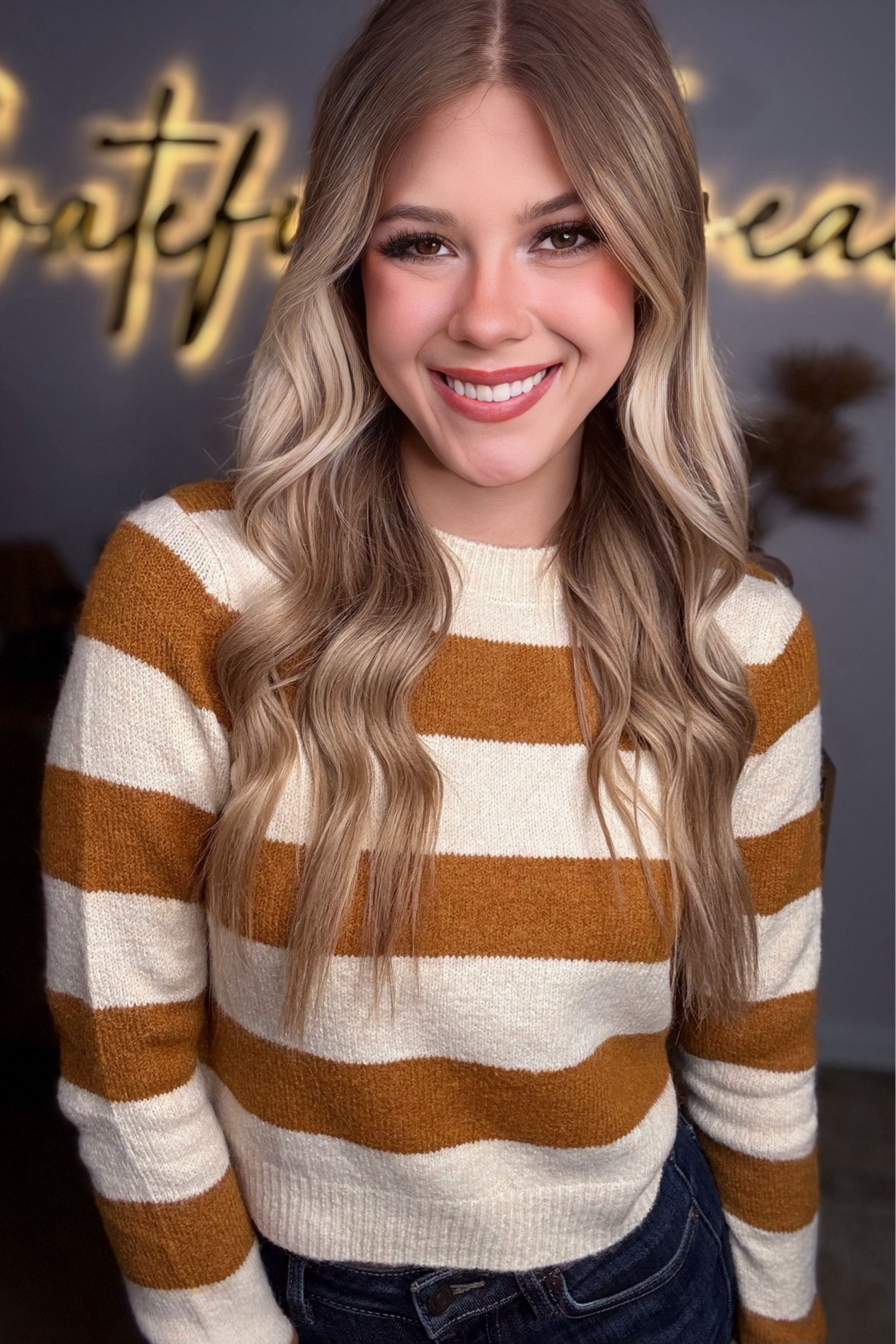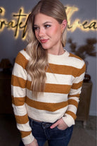 Active Basic | Active USA - Long Sleeve Crew Neck Stripe Sweater: Camel/Ivory