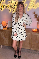 Featuring a stylish polka dot print and a flattering surplice V-neckline, this dress effortlessly exudes chic sophistication. The trendy puff sleeves add a touch of flair, while the mini length adds a playful and flirty element. Perfect for any occasion, this dress is a must-have addition to your wardrobe.