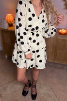 Beige Polka Dot Printed Suplice V-Neck Puff Sleeve Mini Dress