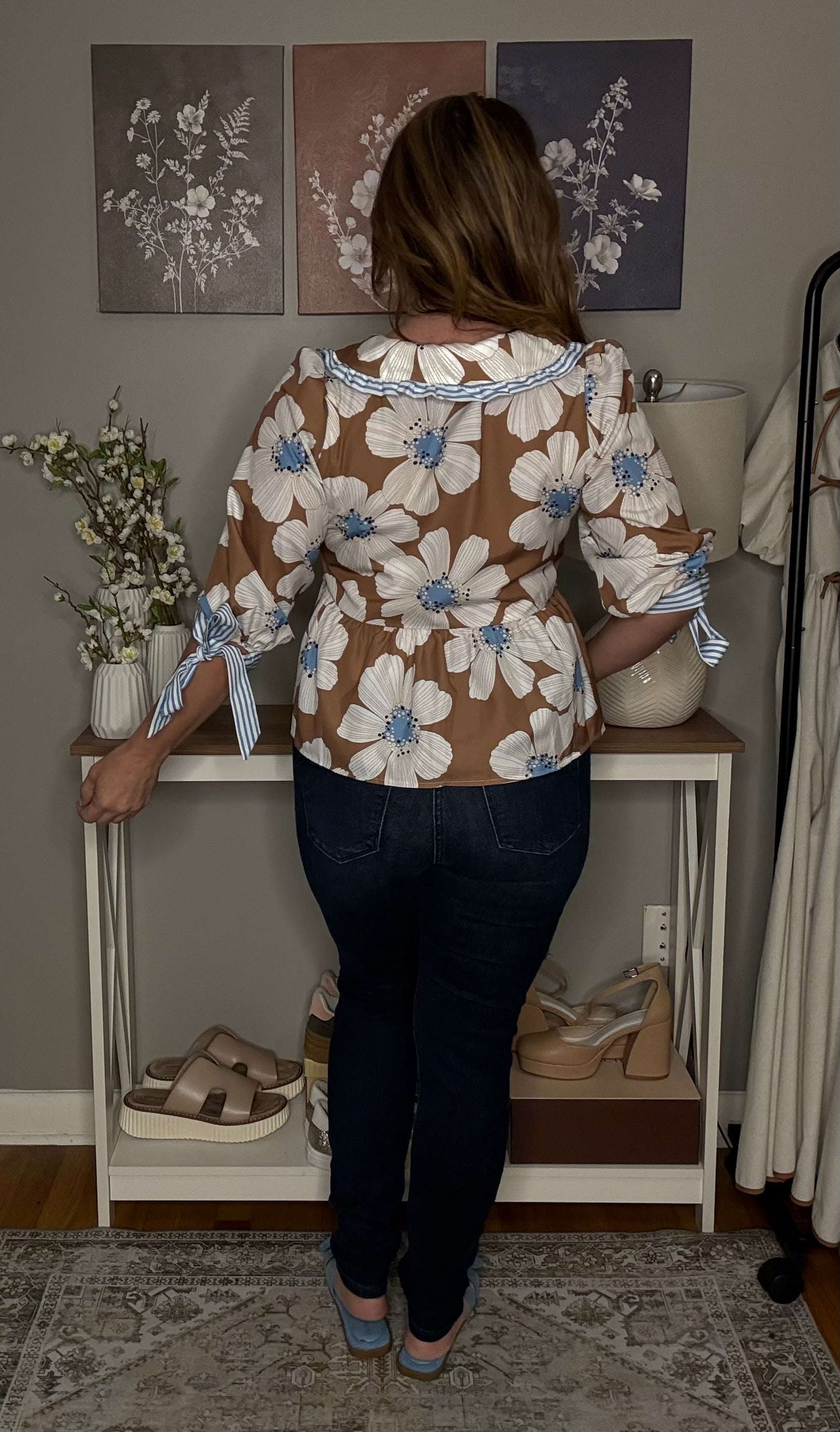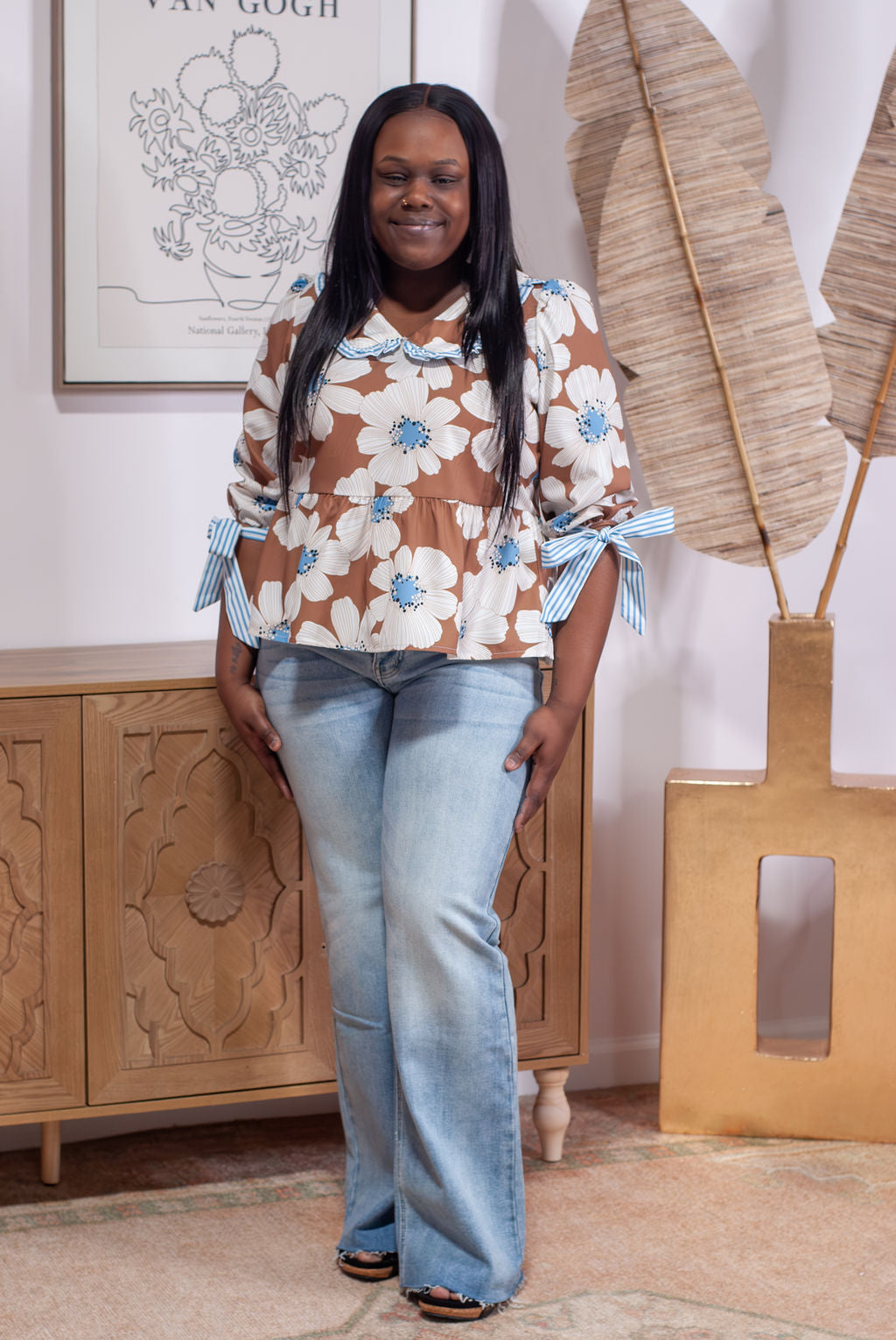 The Floral Print Tie V-Neck Blouse is a versatile, feminine piece perfect for adding a touch of elegance to any outfit. Whether you're dressing up for a special occasion or pairing it with your favorite jeans for a casual day out, this blouse effortlessly combines style and comfort.