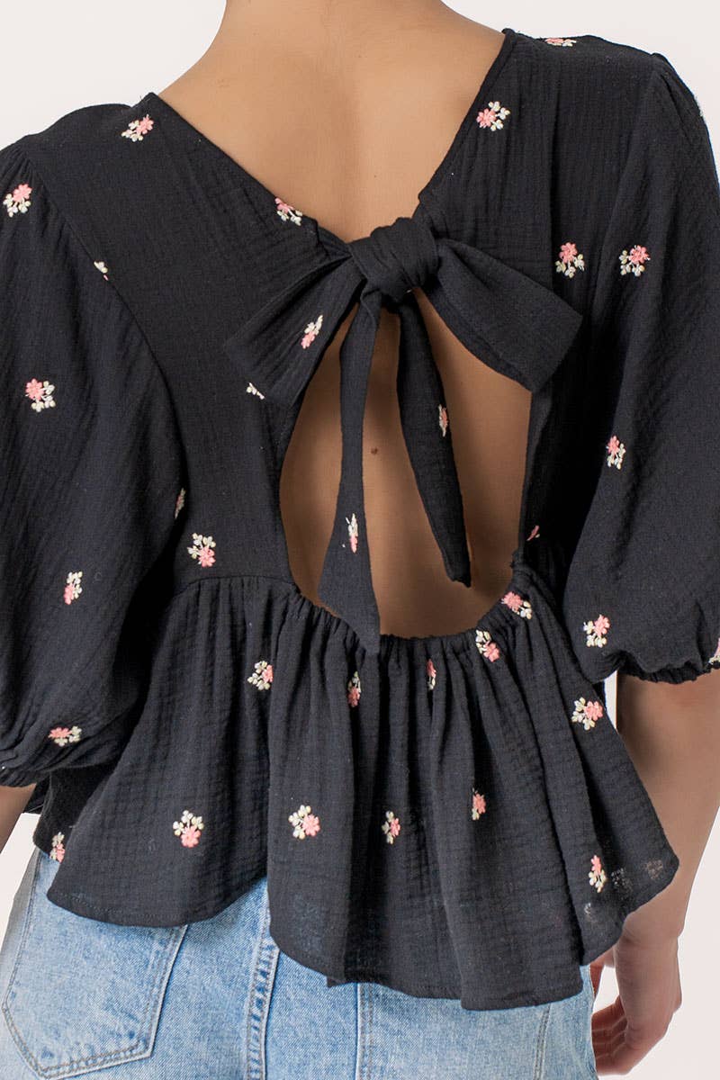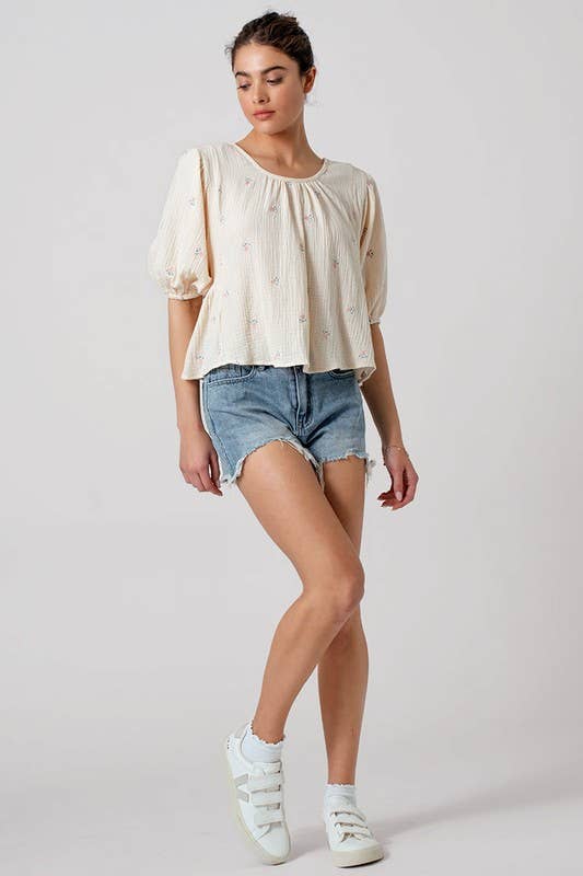Scoop Neck Gauze Blouse with Mini Floral Embroidery and Elbow Puff Sleeve and Open Tie Back Closure