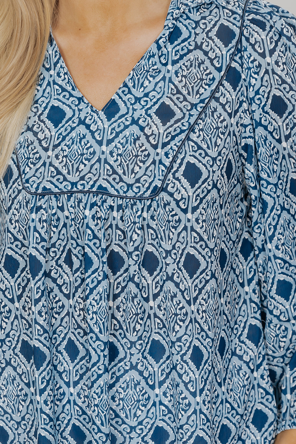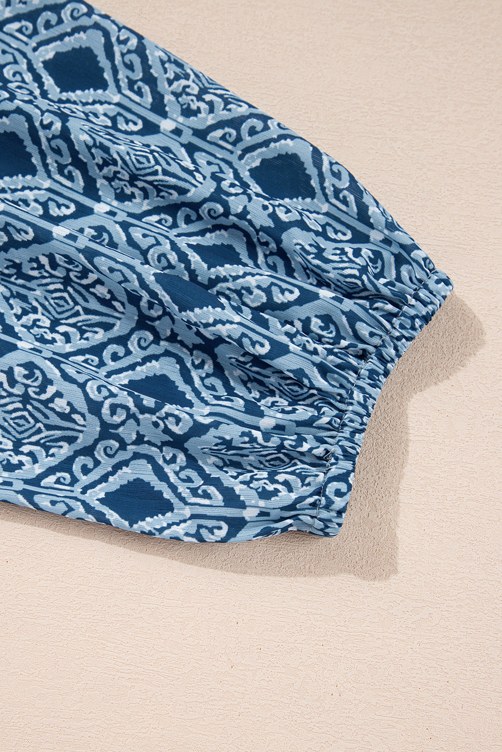Sky Blue Western Geometric Print Frilled V Neck Loose Fit Blouse