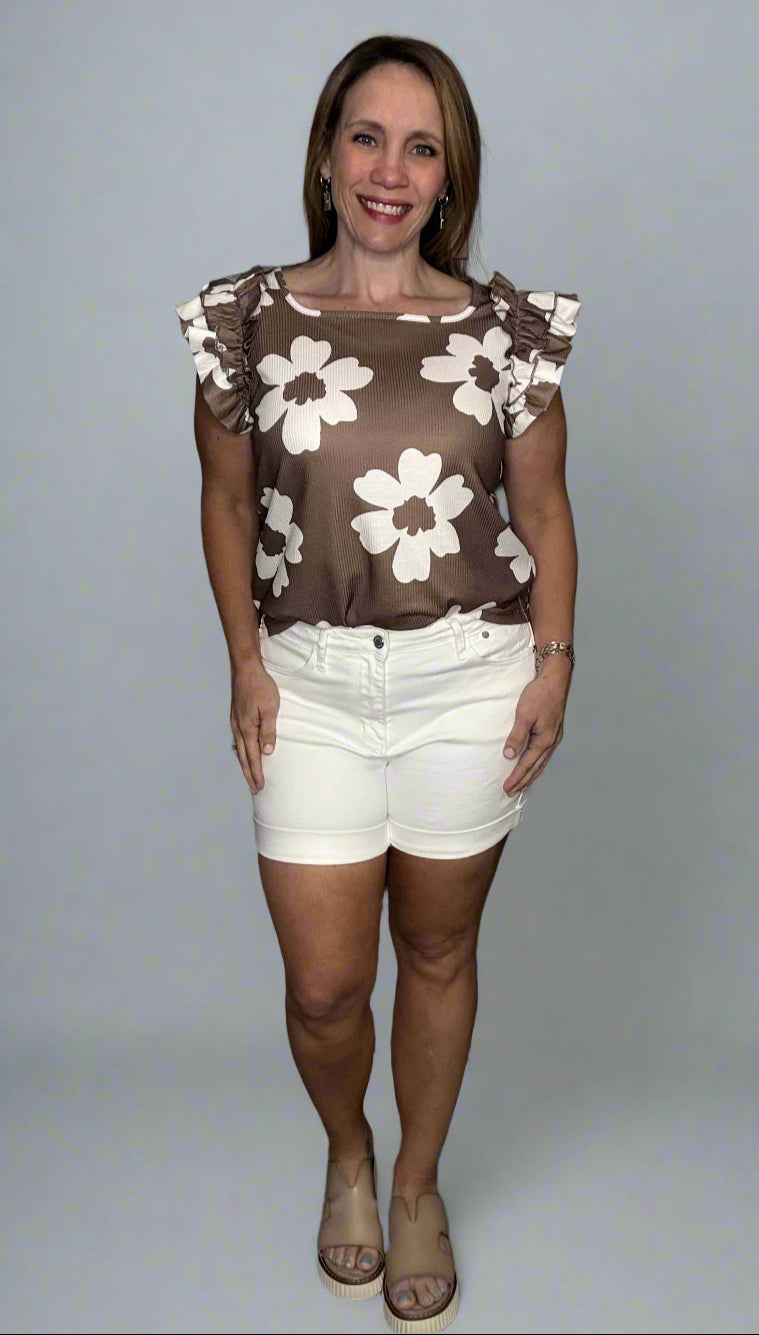 Bring playful charm and elevated comfort to your wardrobe with the Brown Floral Textured Blouse by Grateful Threads. Featuring a flattering square neckline and soft, ribbed texture, this blouse is designed to stand out with its bold ivory floral print and beautifully layered ruffled sleeves. The warm brown tone adds a neutral versatility, making it easy to dress up or down for any occasion.