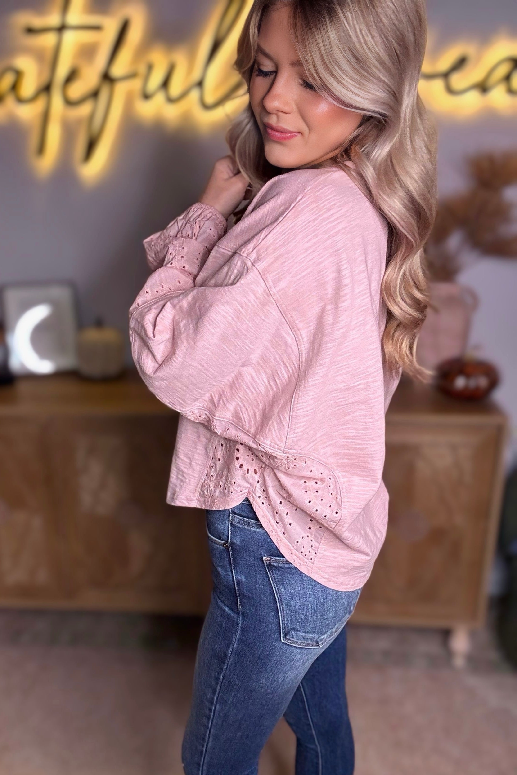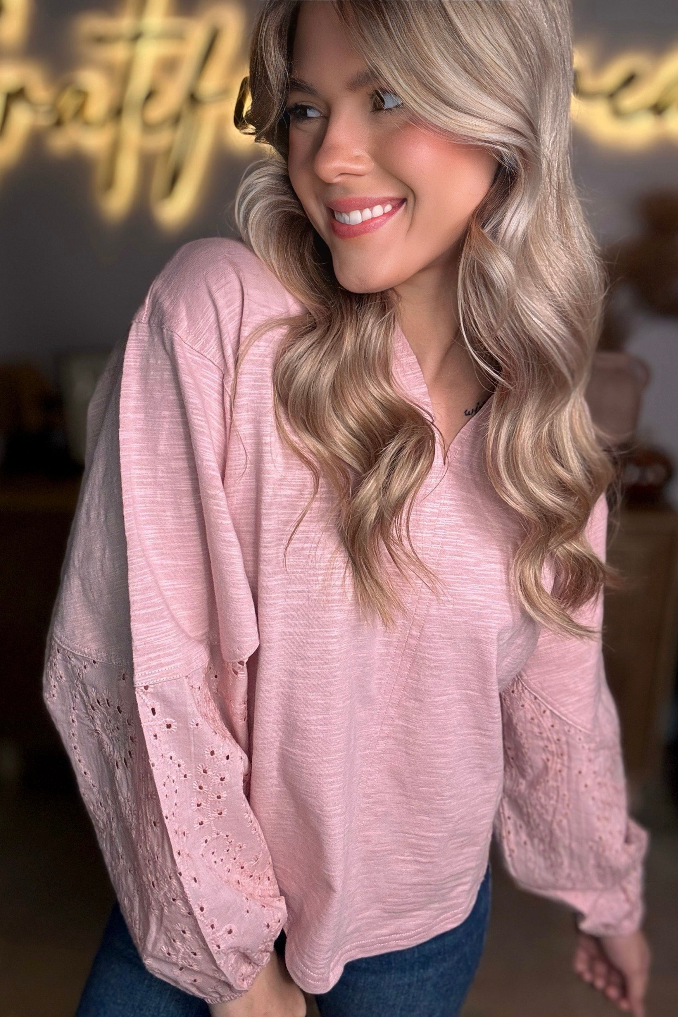 Light Pink Keyhole V-Neck Batwing Sleeve Blouse – Trendy Casual Top