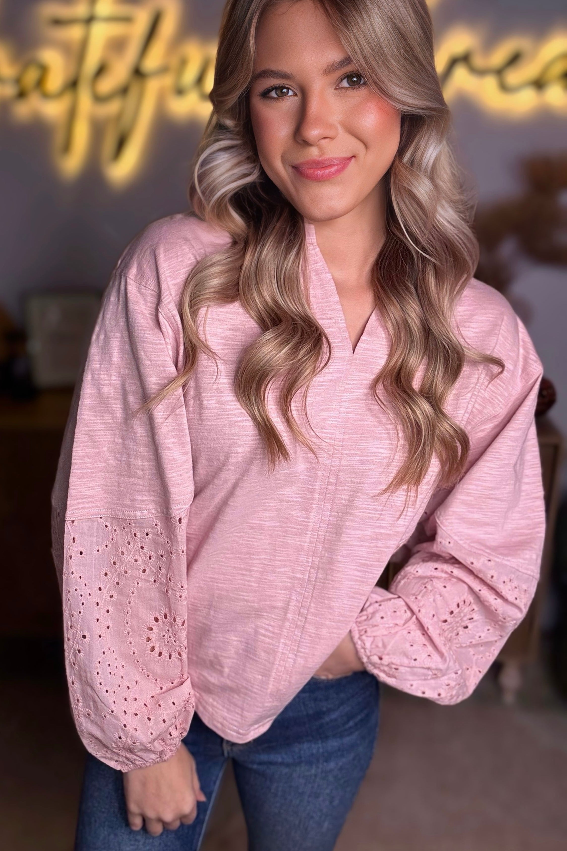 Featuring a flattering notch V-neckline, breezy batwing sleeves, and a soft flowy silhouette, it’s a versatile blouse that pairs effortlessly with jeans, shorts, or skirts. The light pink shade adds a fresh, feminine pop of color that’s easy to style year-round.