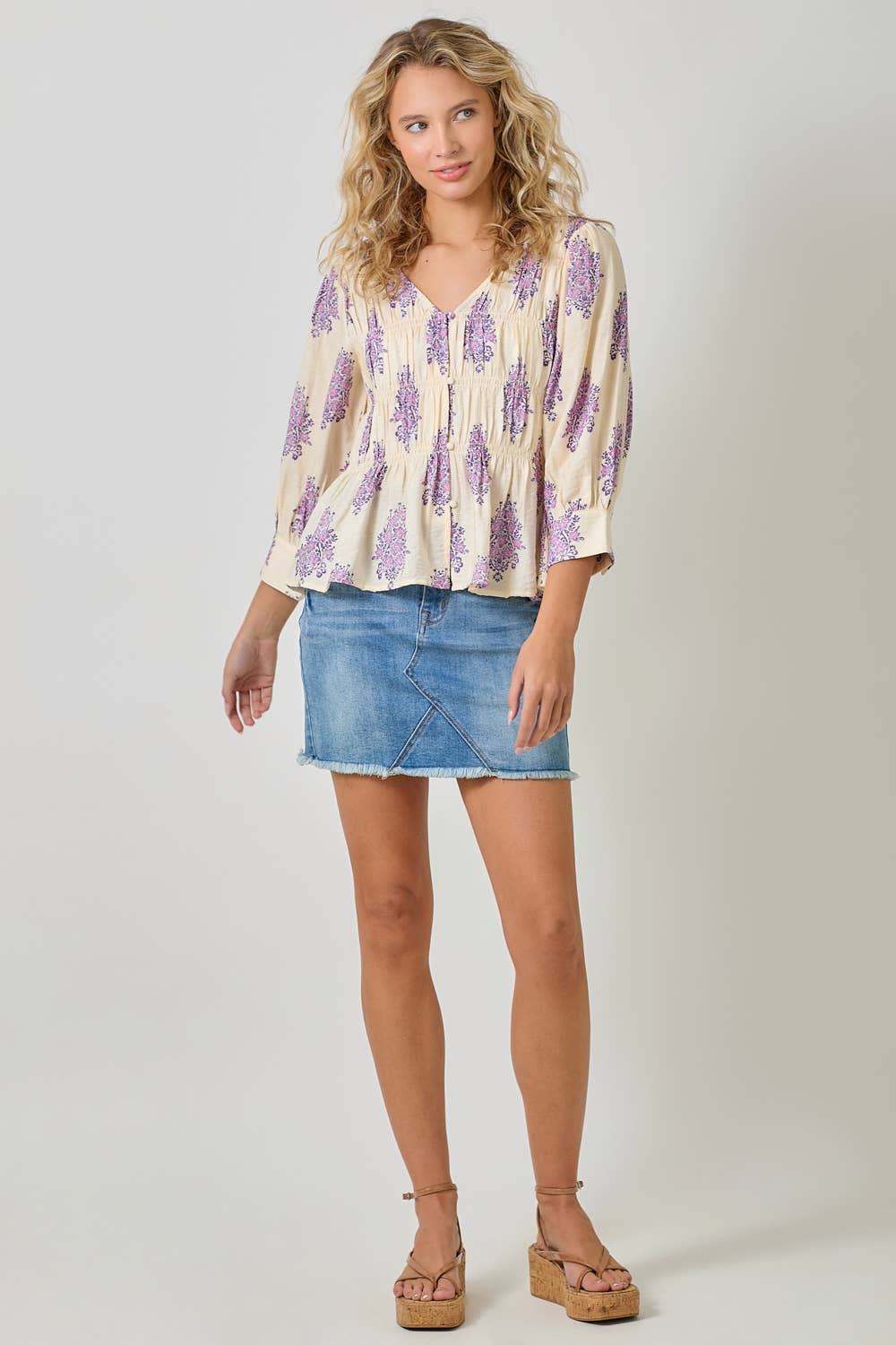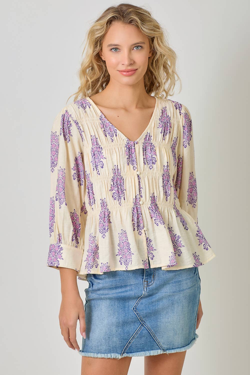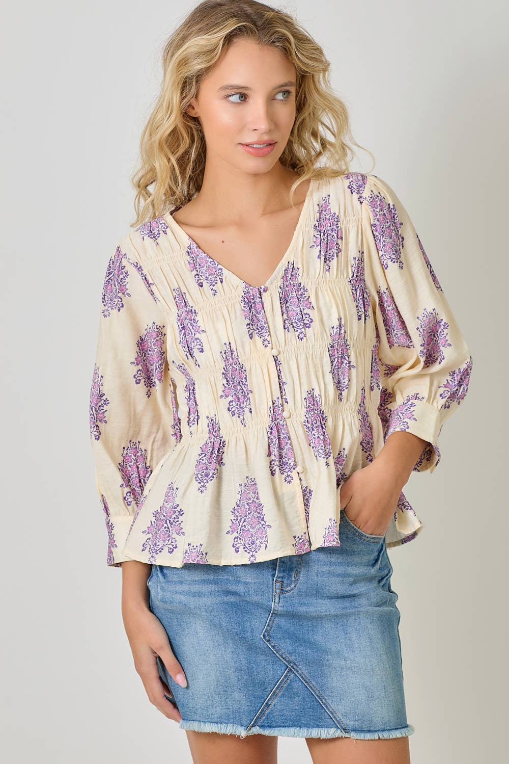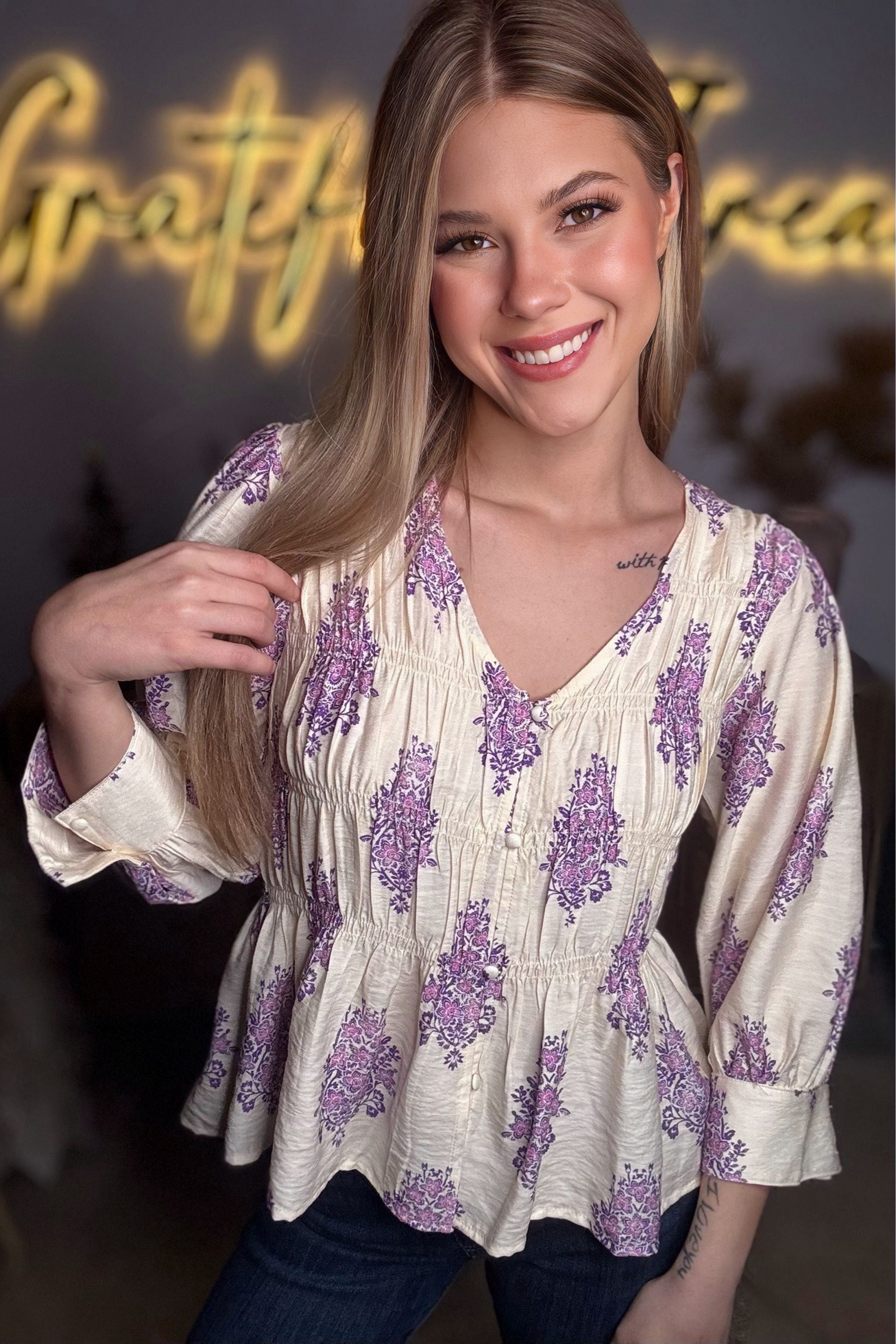 Float through your day in effortless boho charm with the Lavender Fields Puff Sleeve Smocked Blouse by Mystree. Designed with a soft, lightweight woven fabric, this blouse features romantic puff sleeves, delicate allover lavender floral motifs, and a flattering smocked bodice that offers comfortable stretch and shape without clinging.