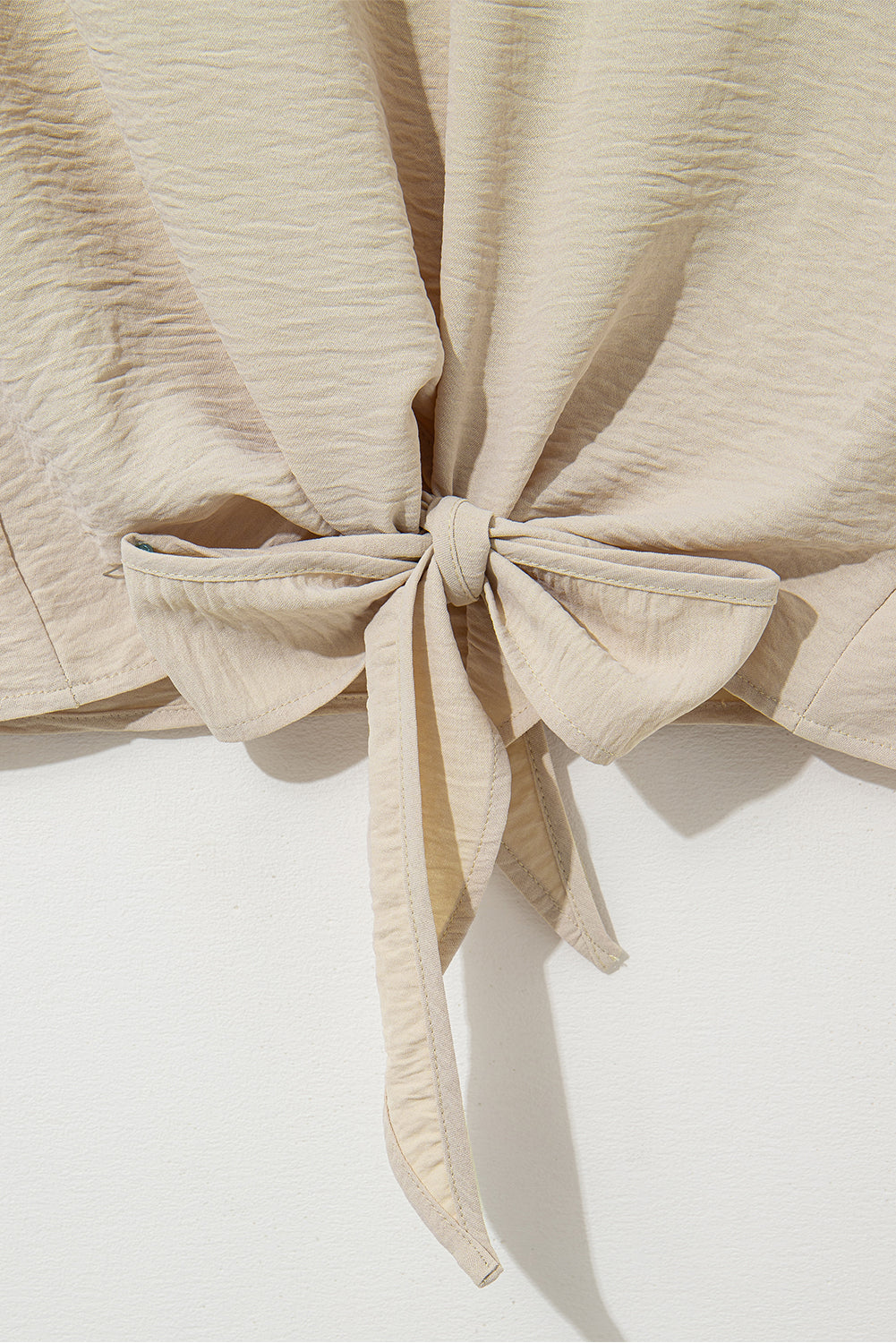 Looking for an easy way to elevate your everyday look? The Parchment Solid Color Knotted Hem Short Sleeve Blouse is your new go-to for instant style and confidence.