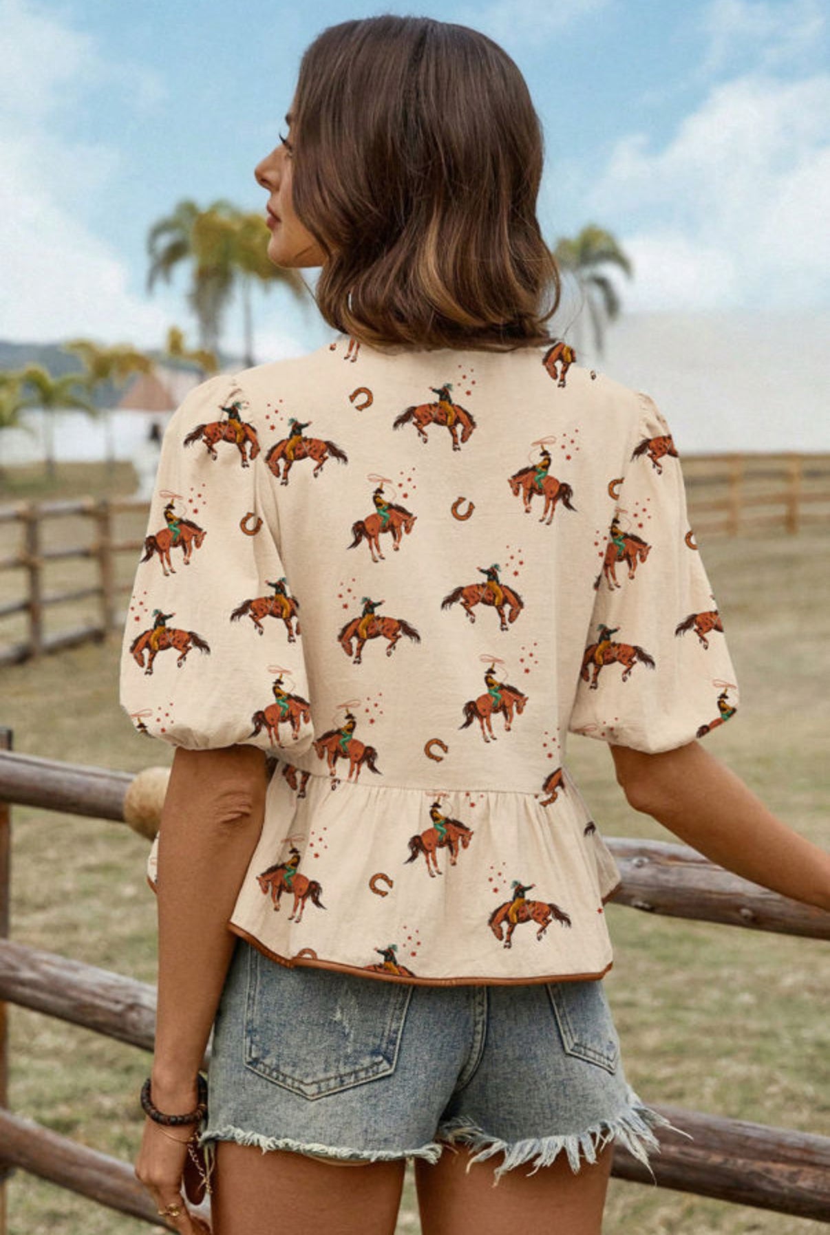 Saddle up in style with our Rodeo Romance Peplum Blouse by Grateful Threads, a playful nod to Western charm and everyday chic. Made from 100% cotton for lightweight comfort, this apricot-toned beauty features a bold cowboy print sprinkled with lucky horseshoes and starry accents. The flattering peplum silhouette cinches at the waist with a trio of charming bow tie details, while the short puff sleeves add a touch of feminine flair. Perfect for daily wear with denim cutoffs or your favorite flares, it’s the ultimate blend of country charm and effortless cool.