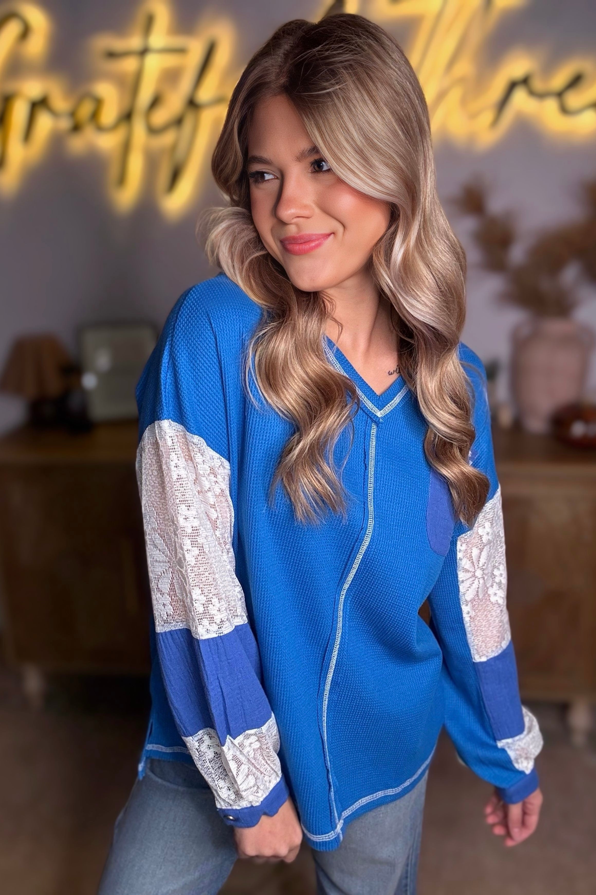 Sky Blue Lace Floral Patchwork Sleeve Stitching V Neck Rib Knit Blouse