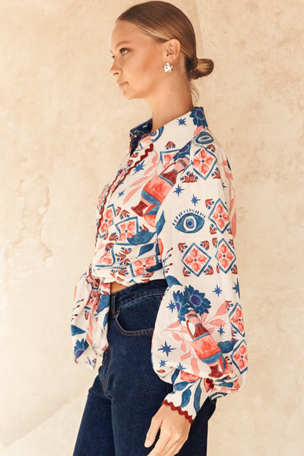 Western Bishop Sleeve Button Up Shirt with Scalloped Trim