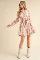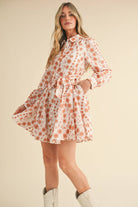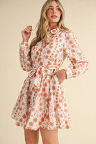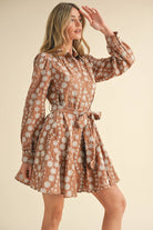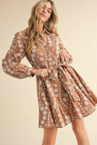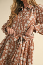 &merci - Floral Embroidery Button Down Flared Mini Dress in Dark Amber