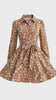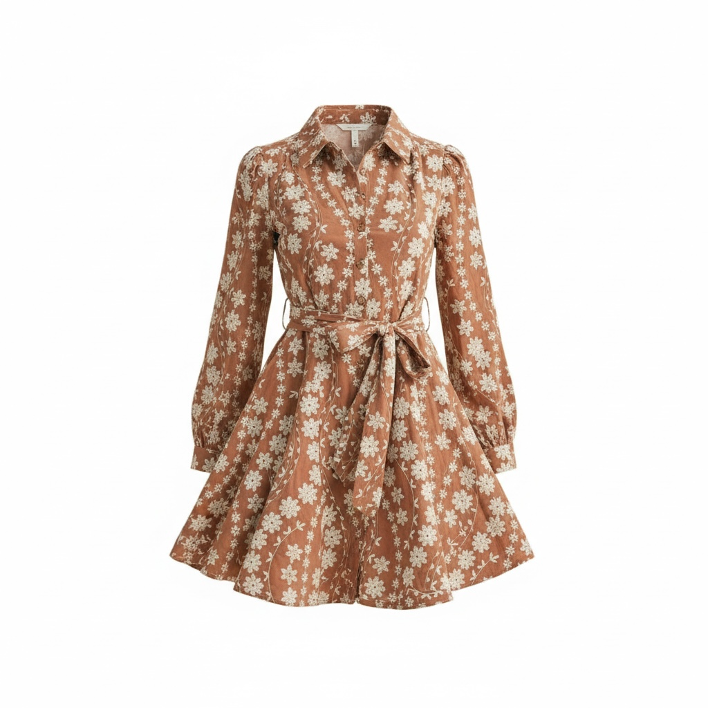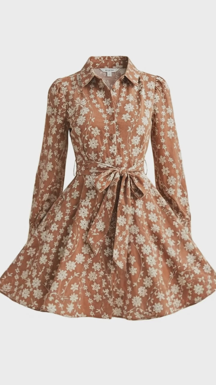 &merci - Intricate Floral Embroidery Button Down Flared Mini Dress in Dark Amber