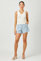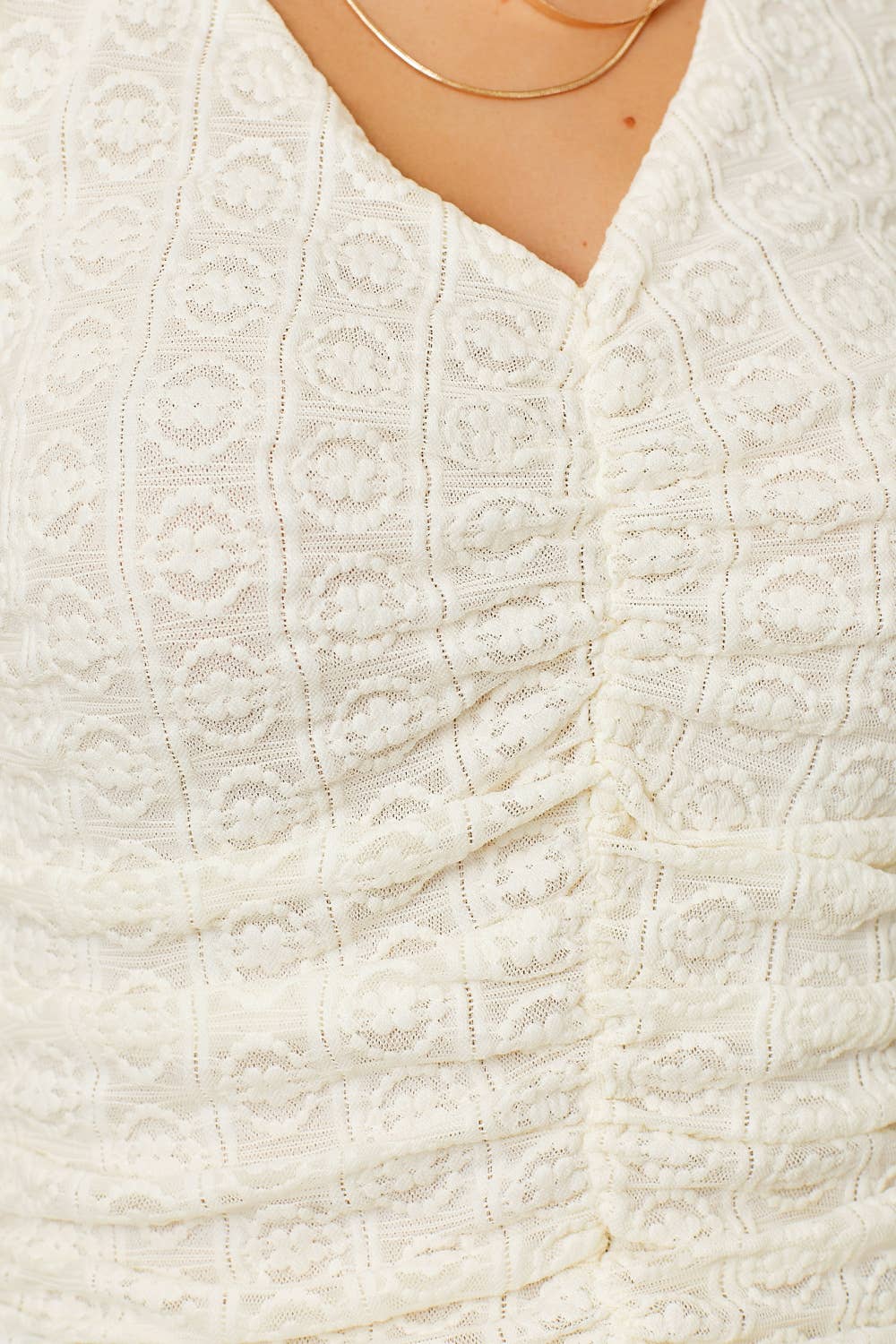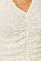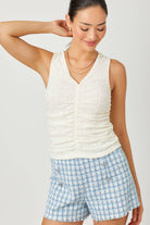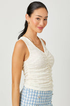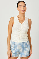 Soft, feminine, and effortlessly flattering, the Whisper White Ruched Floral Tank by Mystree is the kind of staple you’ll reach for again and again. Designed in a creamy off-white hue with a subtle floral textured fabric, this tank brings delicate detail to an everyday essential. The ruched front creates a beautifully slimming silhouette while adding visual interest, and the flattering V-neckline highlights the neckline without feeling too revealing.