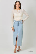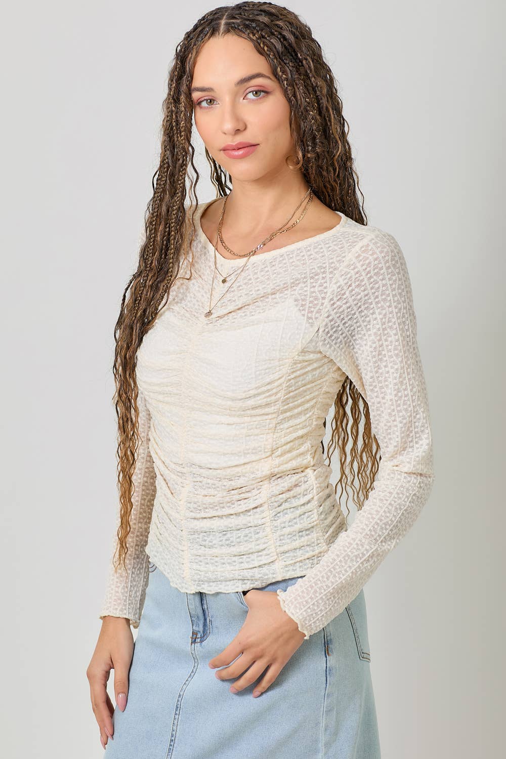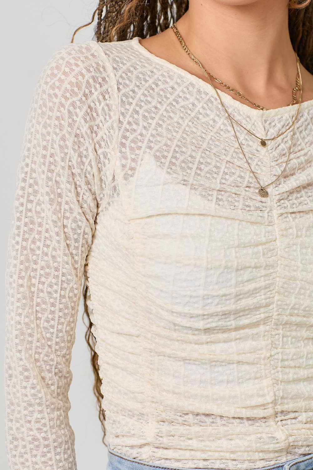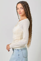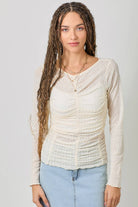 Delicate ruching along the front, sides, and back creates a beautifully contoured silhouette that hugs in all the right places while remaining lightweight and breathable. The softly scalloped lettuce hem adds a whimsical finish, making this top perfect for layering under denim jackets, cardigans, shackets, or statement vests.
