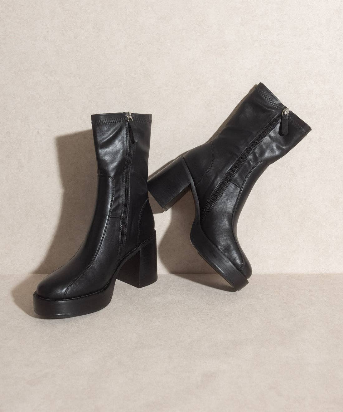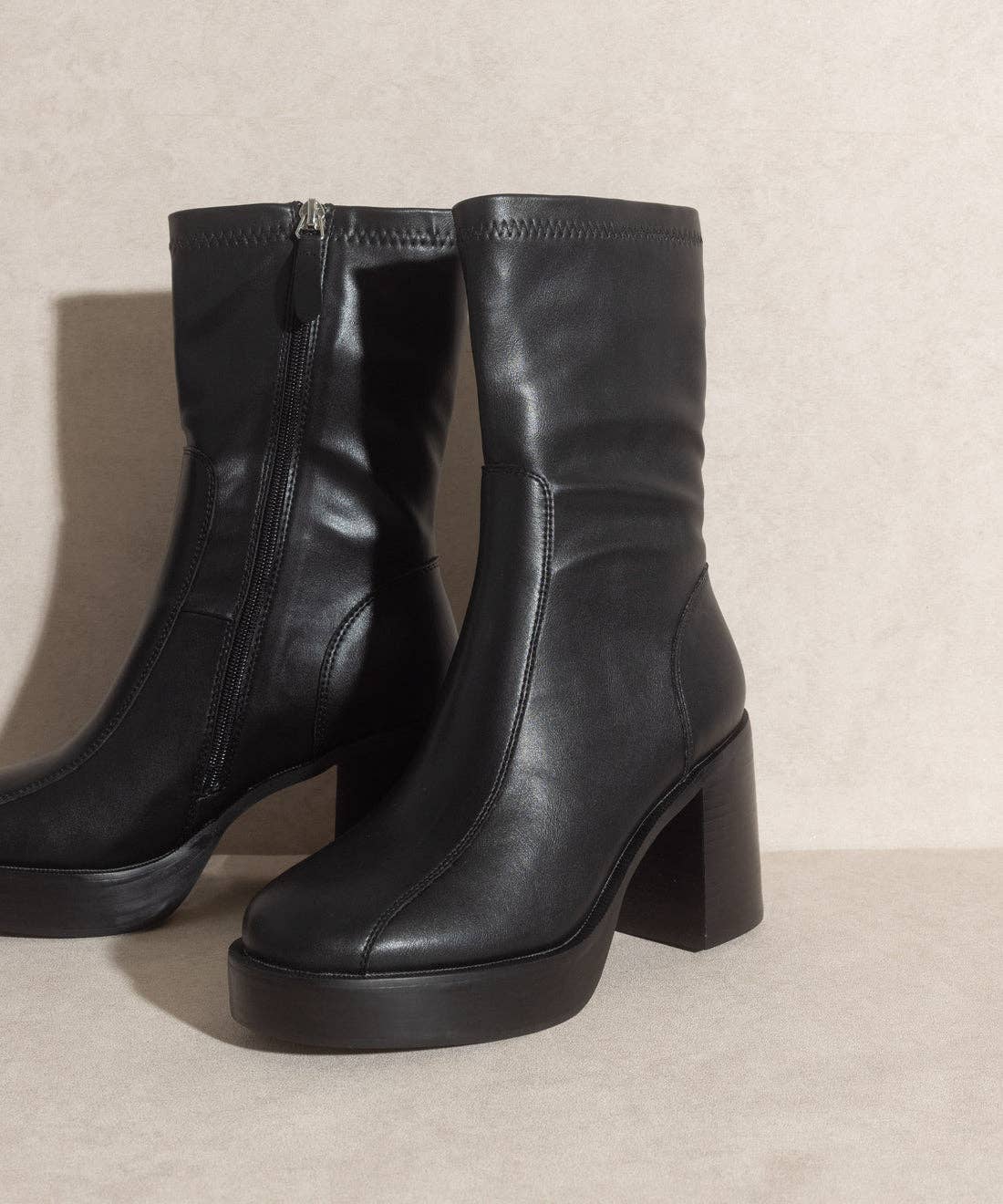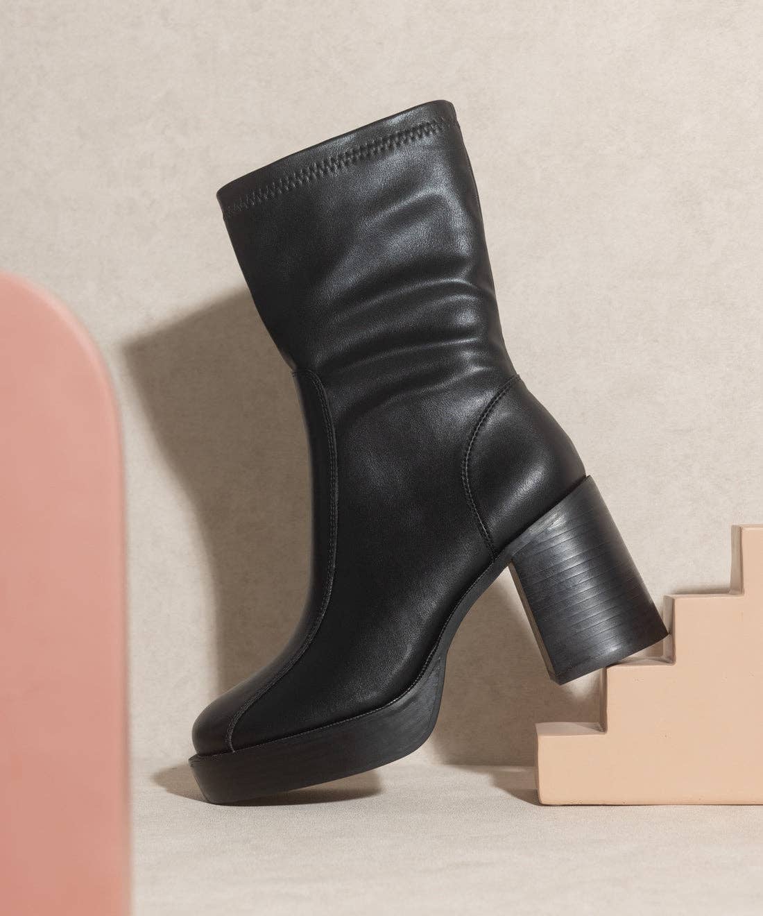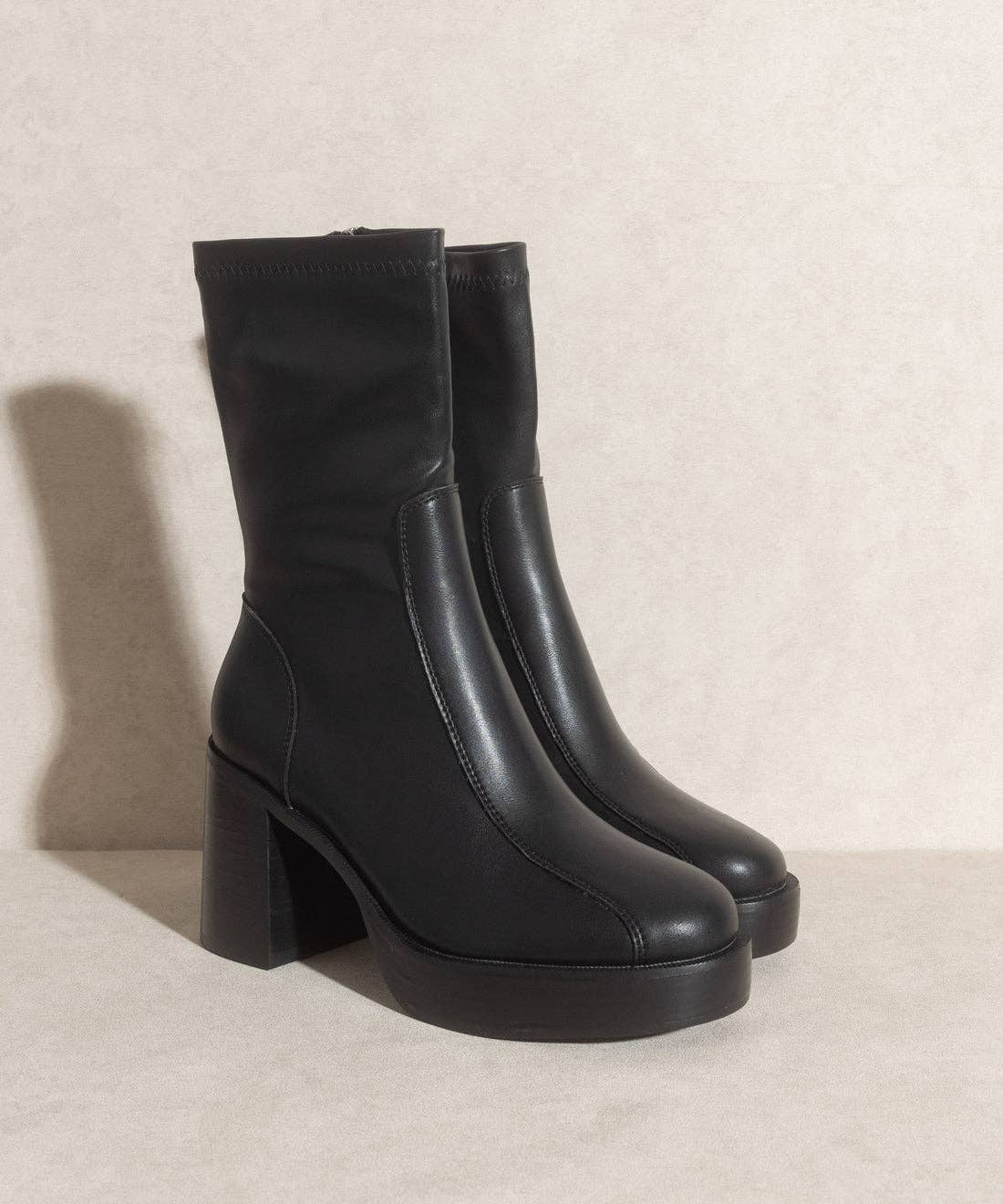 Upgrade your shoe game with these black classic heeled platform boots, designed to merge sophistication and style. Comfortable enough for long days or a night out on the town.