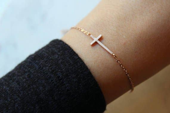 Beautiful matte rose gold sideways cross bracelet on a rose gold plated chain. Bracelet measures 7".