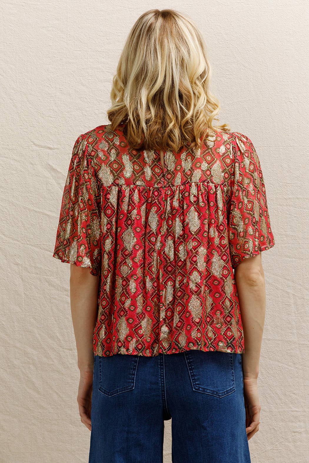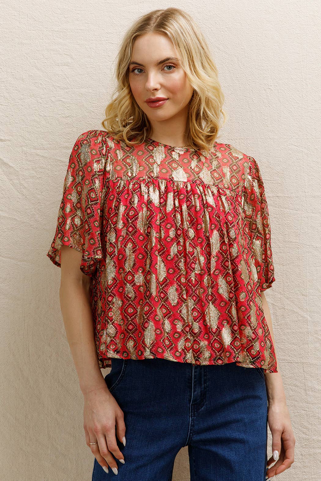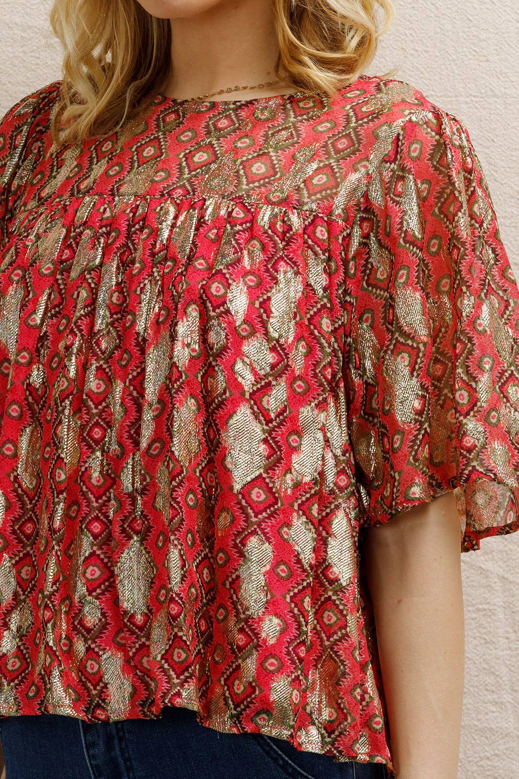 Short Sleeve Lurex Spotted Blouse Self: 85% Viscose 15% Metallic | Lining: 100% Polyknit Size S(2) - M(2) - L(2) Made in India *MODEL IS 5'8" AND IS WEARING A SMALL
