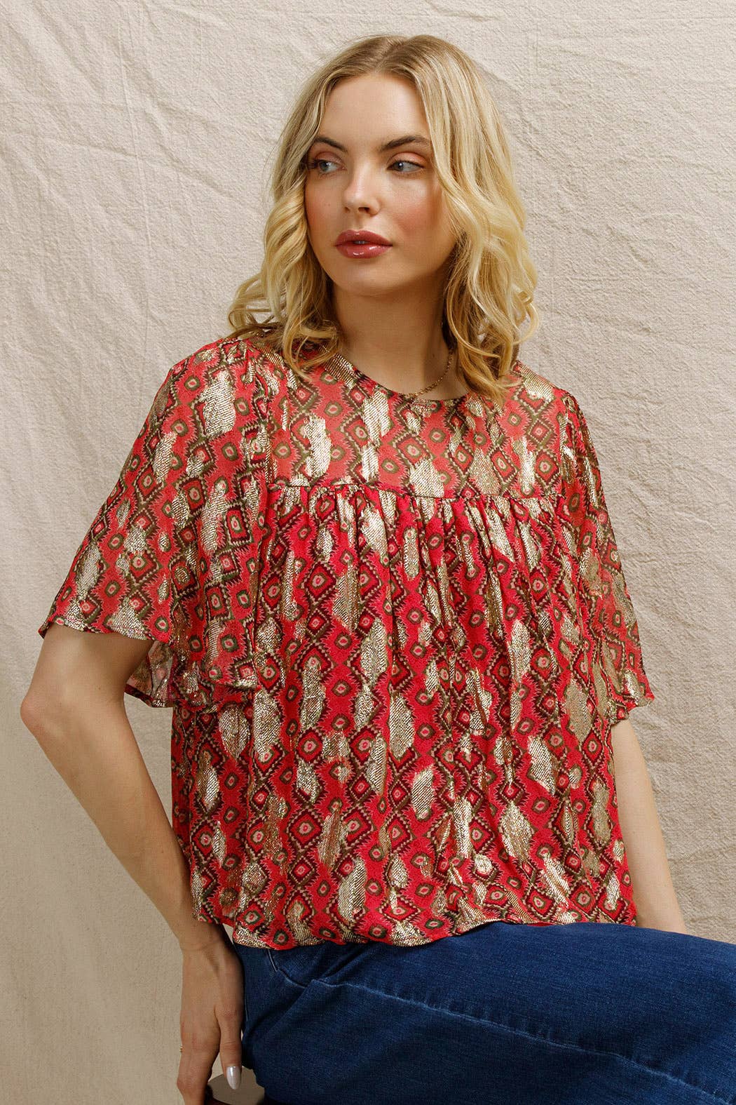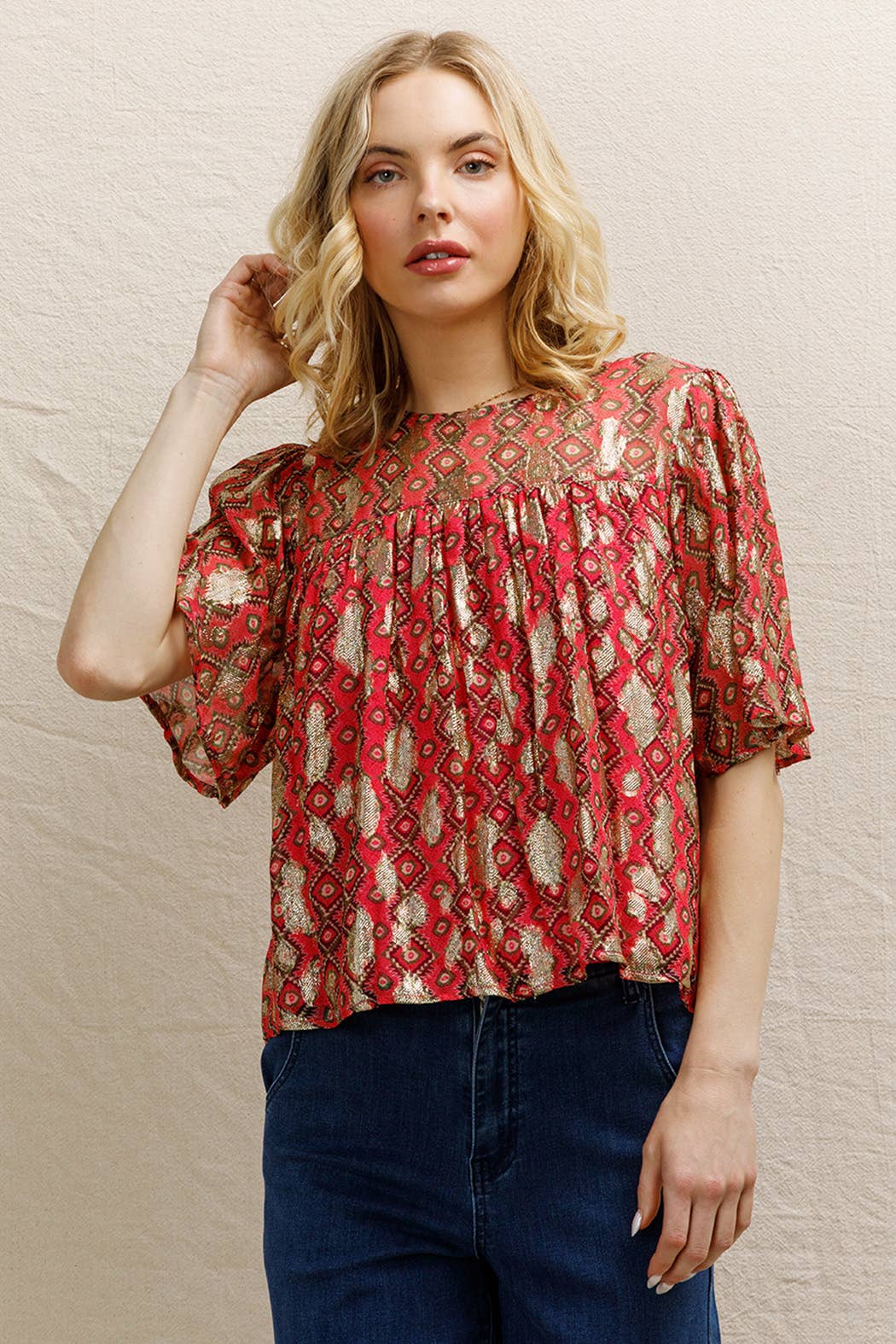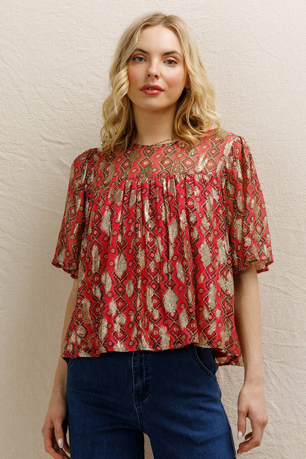 Short Sleeve Lurex Spotted Blouse Self: 85% Viscose 15% Metallic | Lining: 100% Polyknit Size S(2) - M(2) - L(2) Made in India *MODEL IS 5'8" AND IS WEARING A SMALL