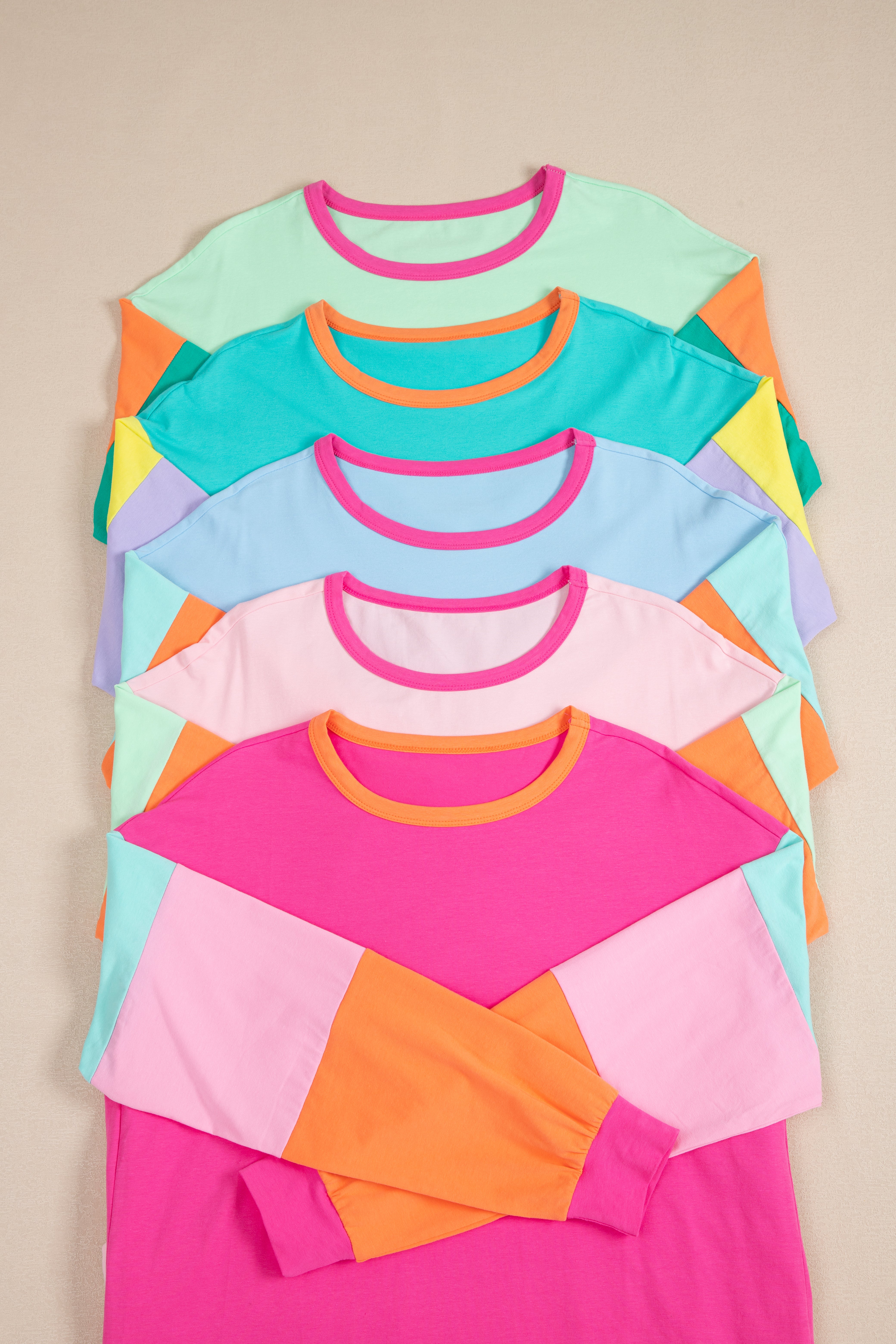 Rose Red Colorblock Patchwork Long Sleeve Loose Top