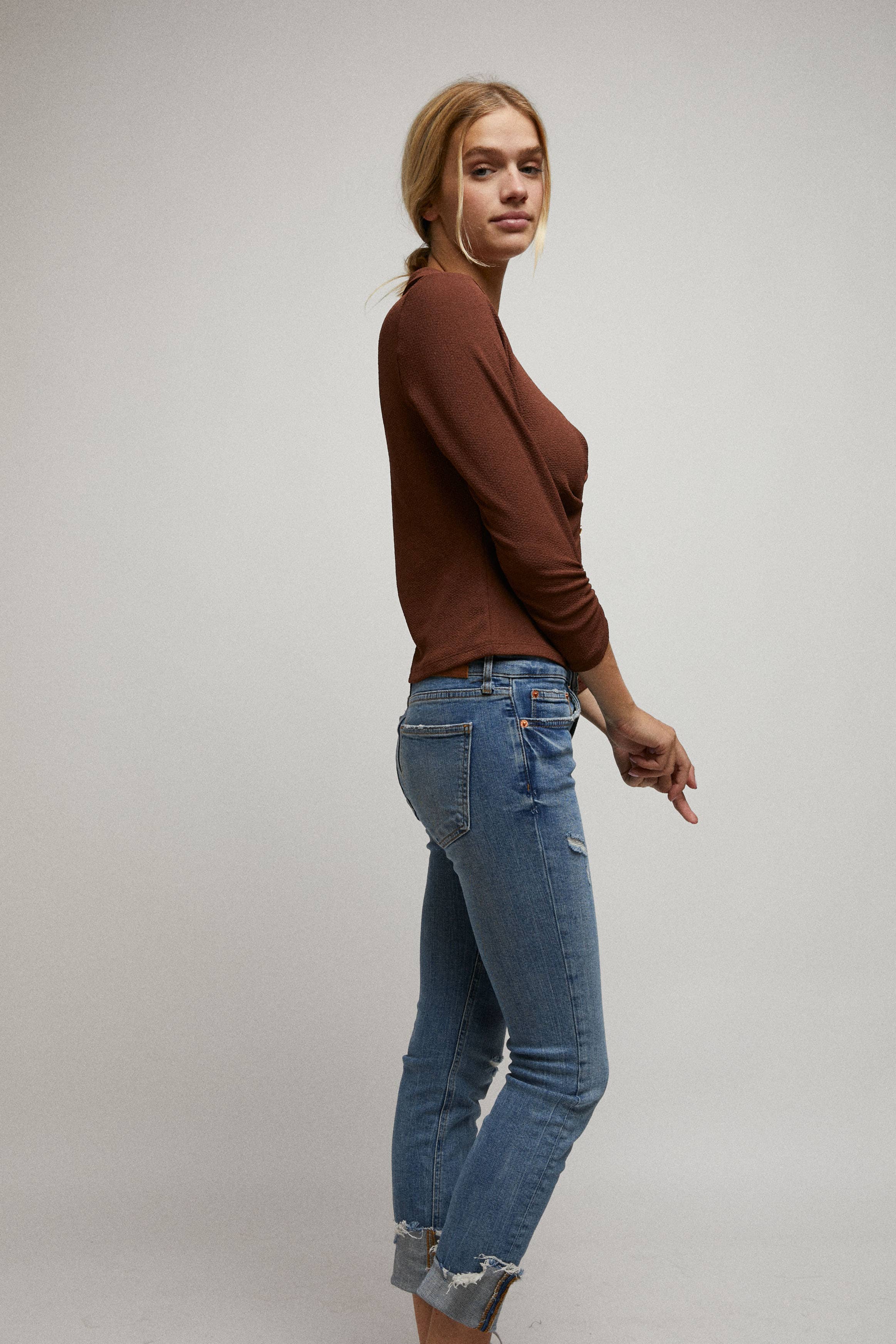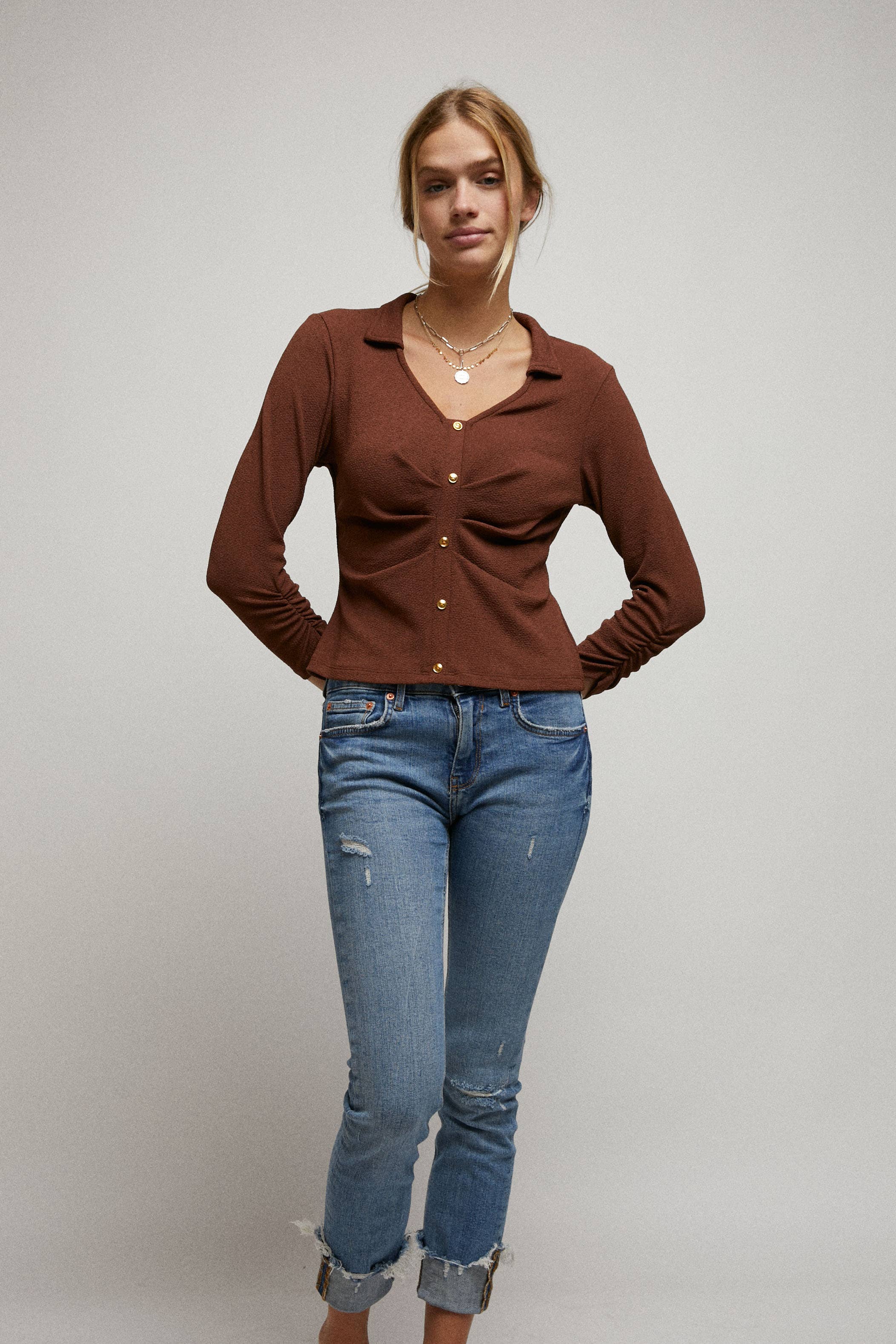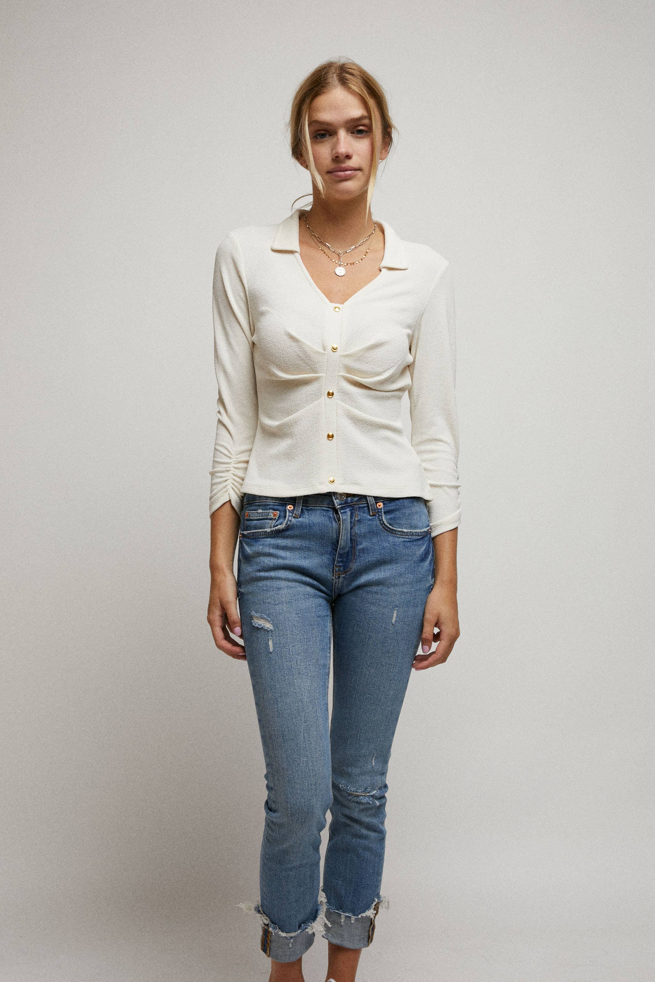 Cinched 3/4 Sleeves Pleated Front Collar V-Neck Top