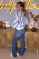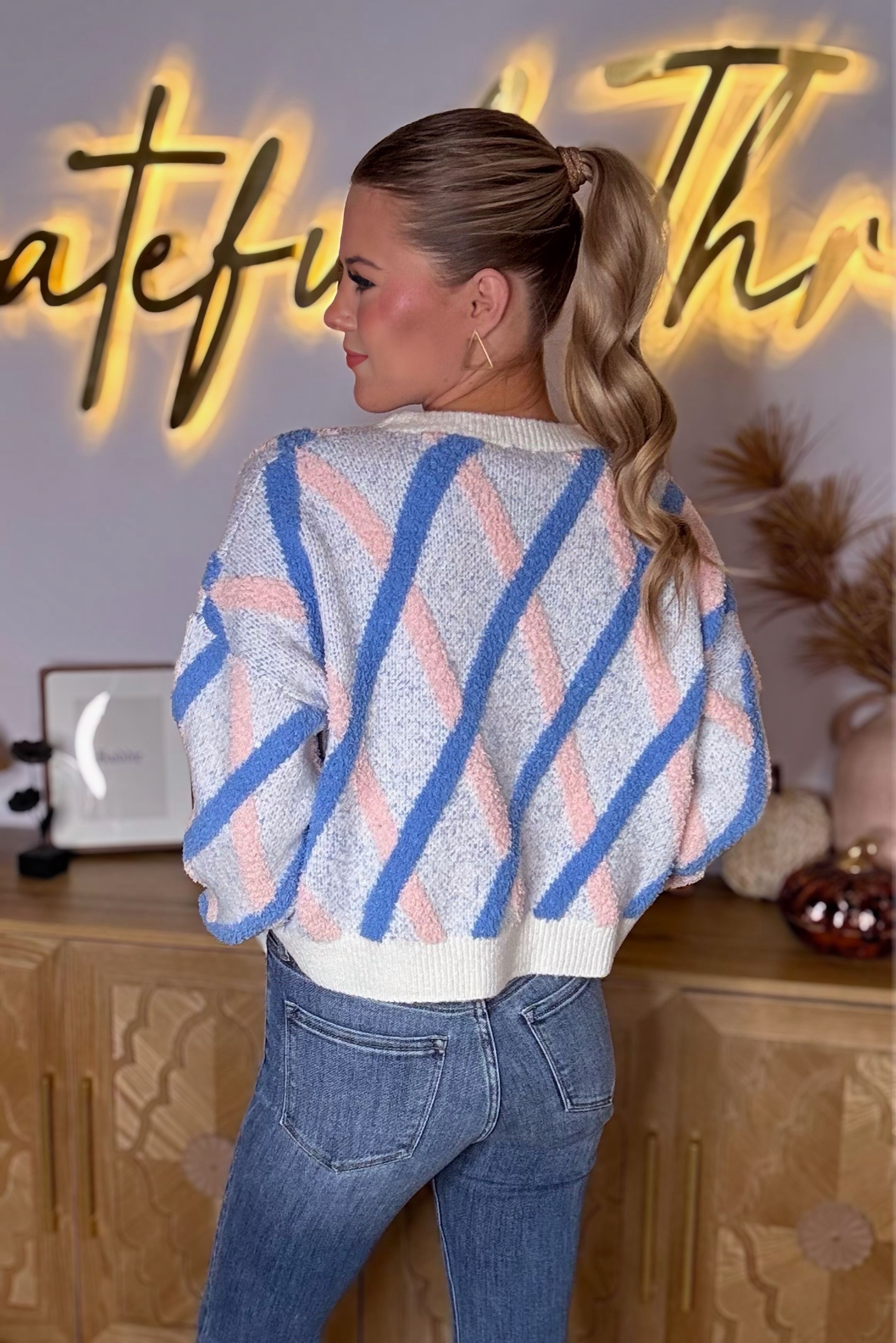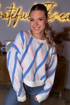 Elevate your everyday style with our Kelly Kapowski Sweater by So Me, a trendy pastel knit designed for comfort, versatility, and statement-making style. This women’s boutique sweater features a soft, textured fabric with a geometric pastel stripe pattern in blue and blush, giving it a modern yet retro-inspired look. The relaxed fit, drop shoulders, and ribbed neckline and hem make it the perfect cozy sweater for fall, winter, and cool spring days.