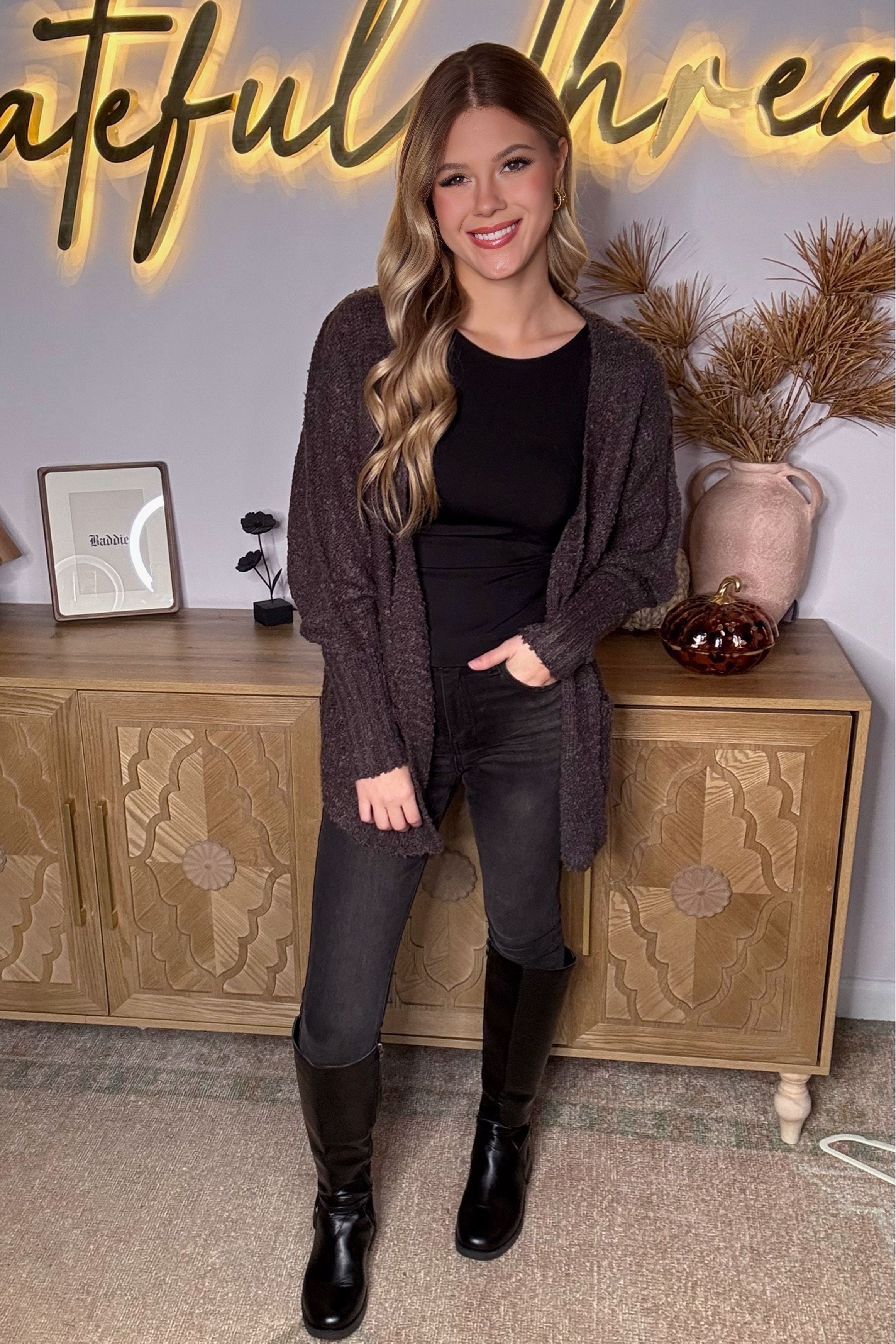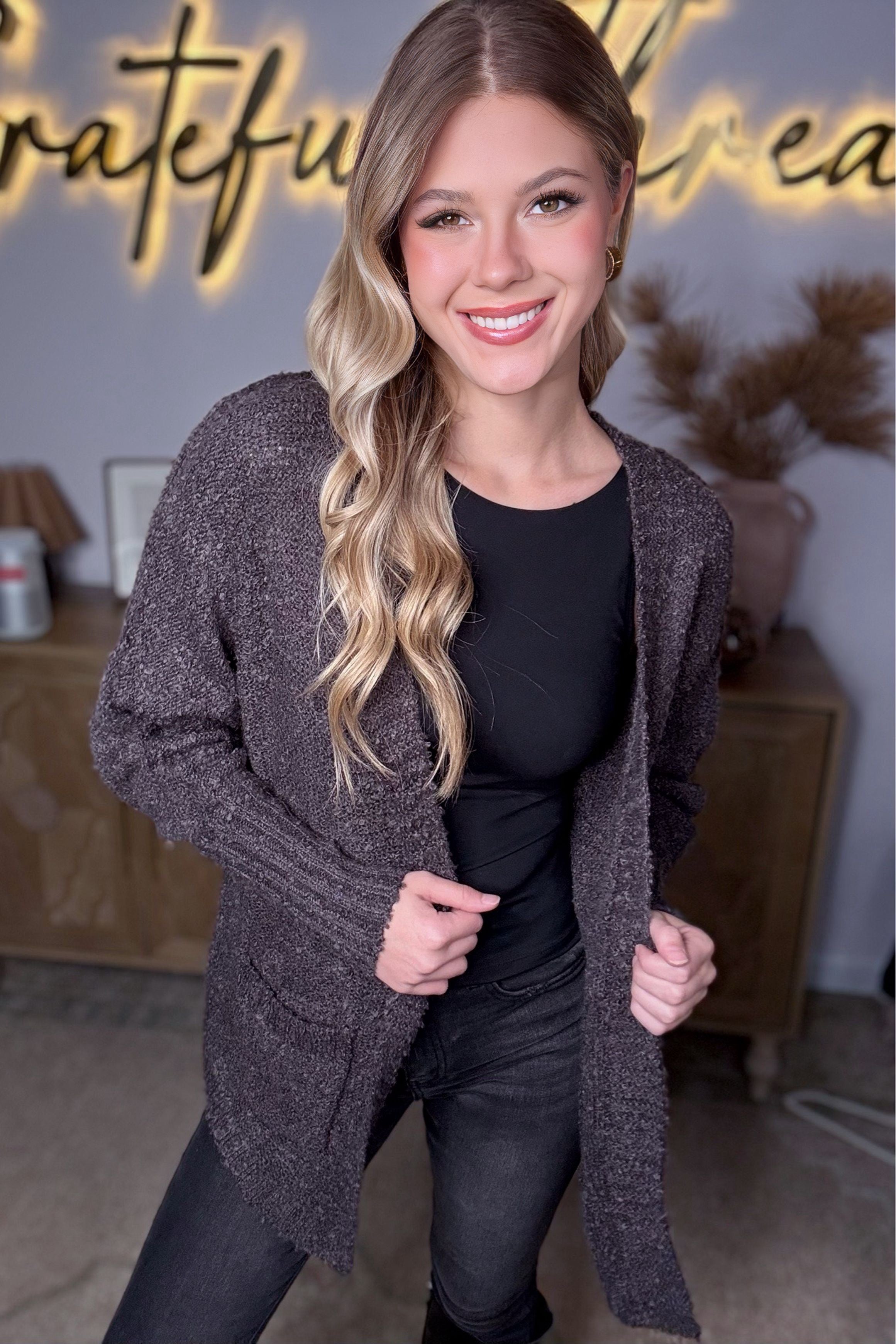 Women cardigan: solid color, knit, two pockets, textured, open front, long sleeves, cuffed hem, relaxed fit, not see through, non-stretchy, unlined, comfy, super soft to touch, casual, chic, basic, fall/winter collection. this amazing cardigan will keep you warm and cozy, but also looks stylish for season.