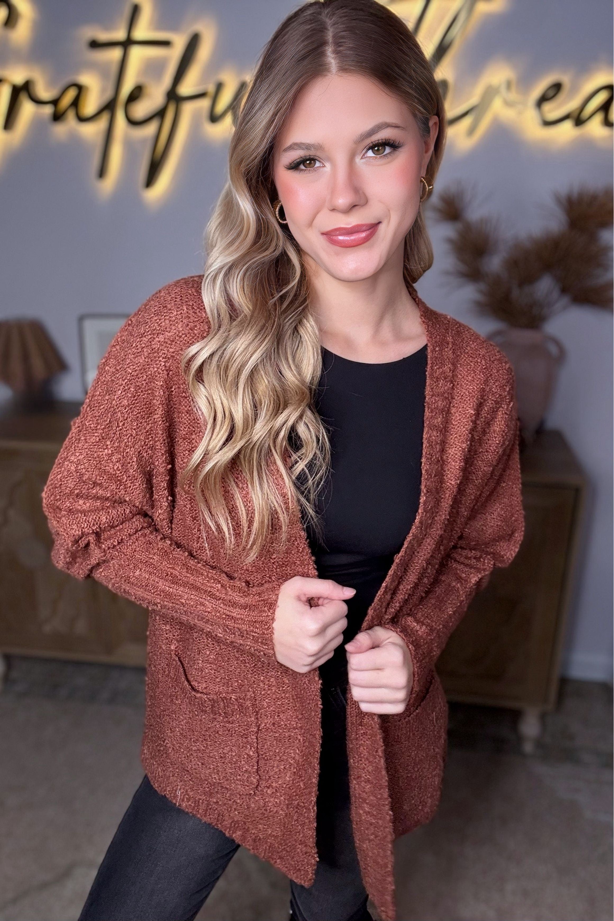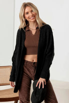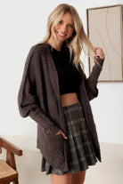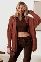 This luxurious open front cardigan is crafted from a textured knit fabric, delivering both comfort and sophistication. Complete with two pockets for added convenience, it is the perfect addition to any wardrobe. Elevate your style and stay cozy with this Knit Textured Two Pocket Open Front Cardigan.
