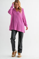 Blend effortless style with all-day comfort. Crafted from a soft, lightweight cotton-blend waffle knit, this long-sleeve top features a vintage-inspired mineral wash for a uniquely worn-in feel. The oversized collar adds a polished touch, while raw edge detailing at the shoulder and back seams enhances its relaxed, lived-in look. Cozy yet elevated, it’s perfect for layering or wearing solo—pair it with your favorite denim or leggings for a casual-chic outfit. Luciana is 5'9", a size 2, and is wearing an S 60% cotton 40% polyester