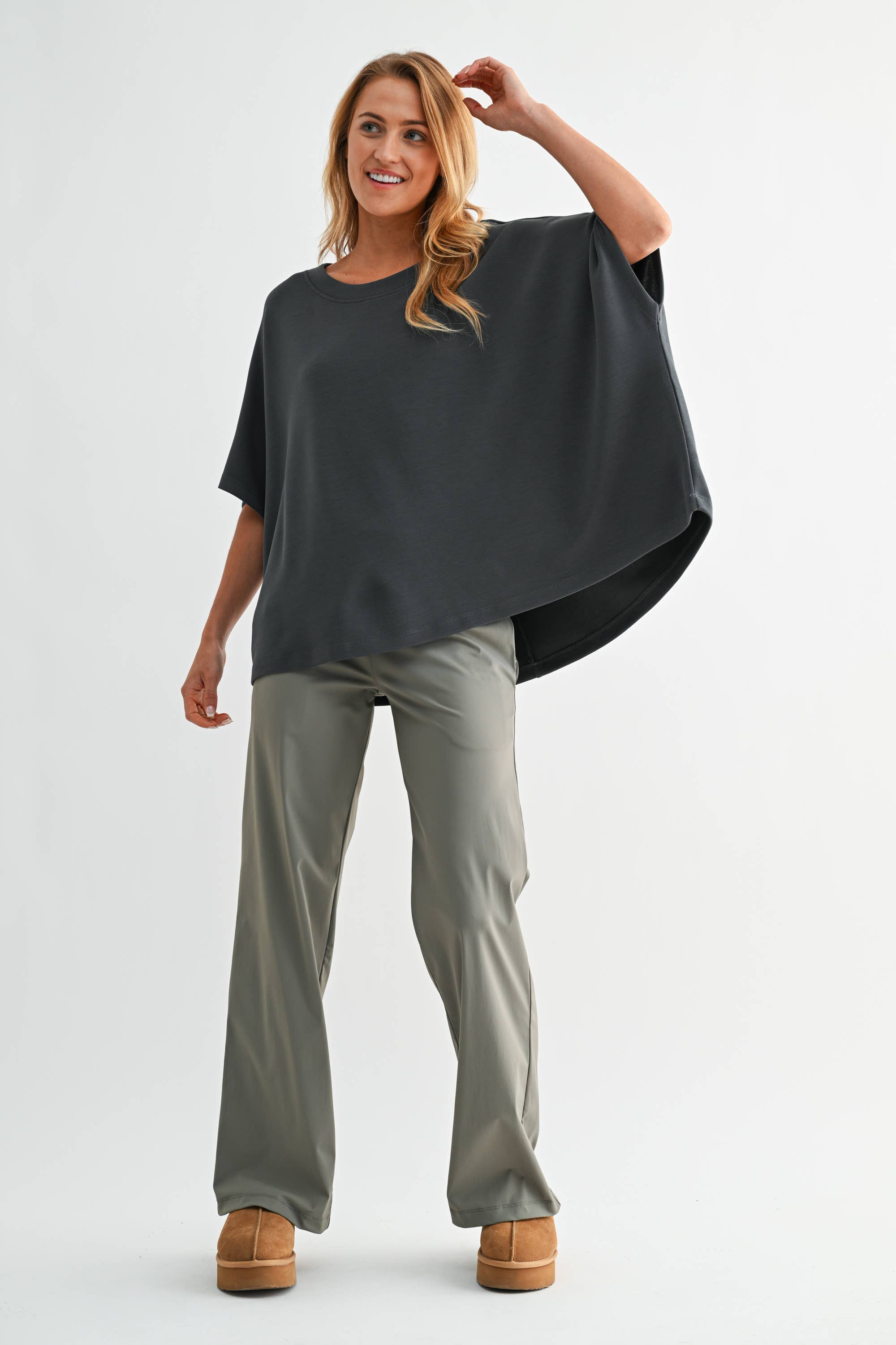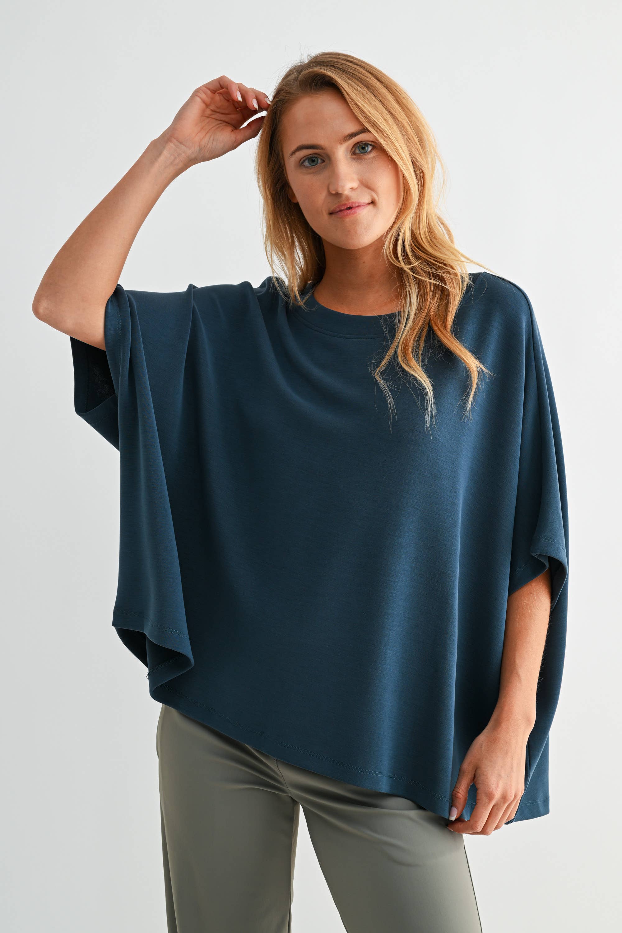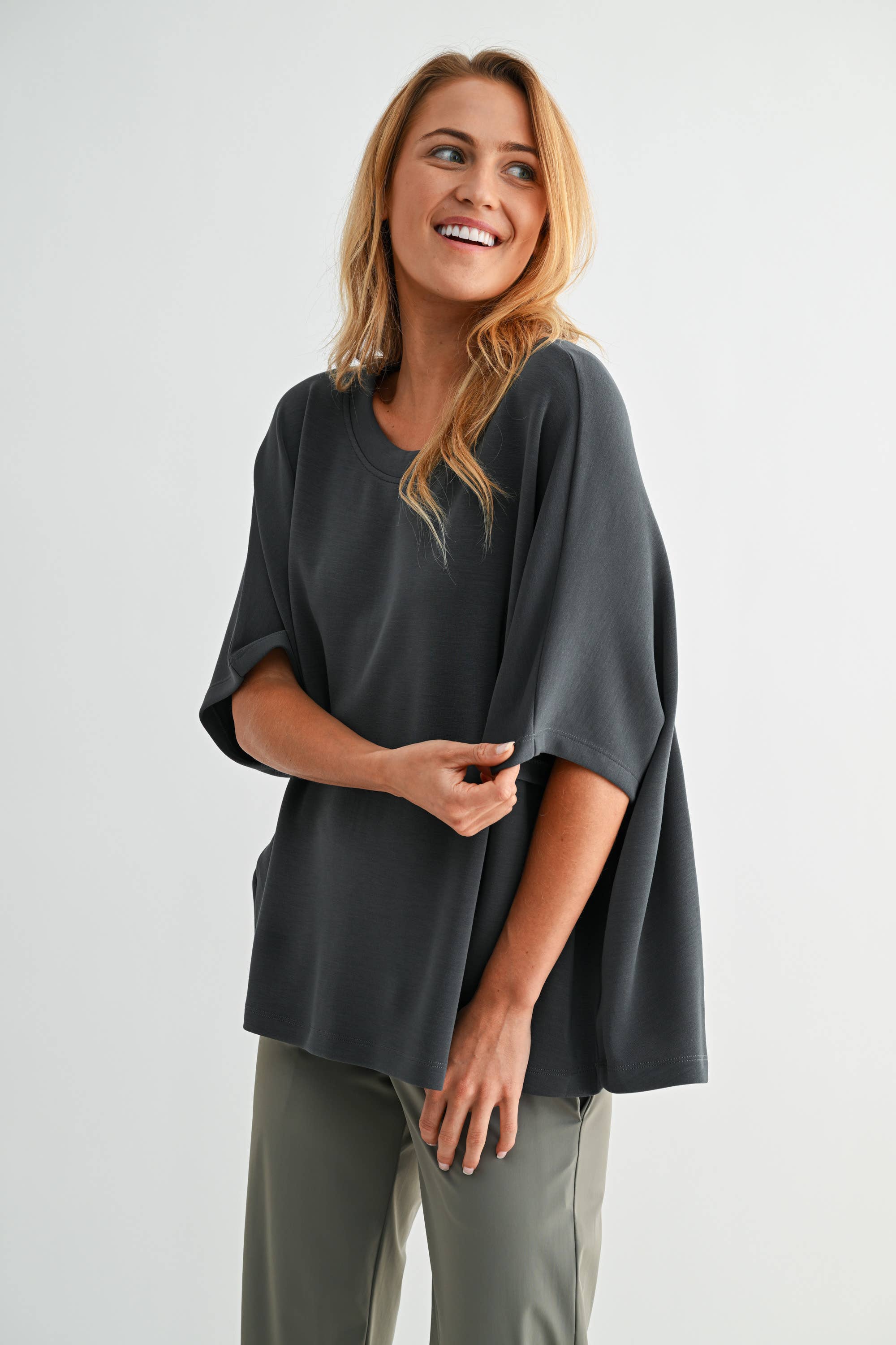 Lightweight and versatile, this top is your go-to for a polished yet comfortable outfit. Featuring a sophisticated boat neckline and dolman-shaped elbow-length sleeves, this airy top is perfect for crisp spring days. Its relaxed silhouette ensures ultimate comfort while maintaining an elegant vibe. Pair it with your favorite denim shorts for a casual look or match it with scuba pants or shorts for a coordinated style. Luciana is 5'9", a size 2, and is wearing an S 47% modal 47% polyester 6% spandex Machine wash delicate Dry flat