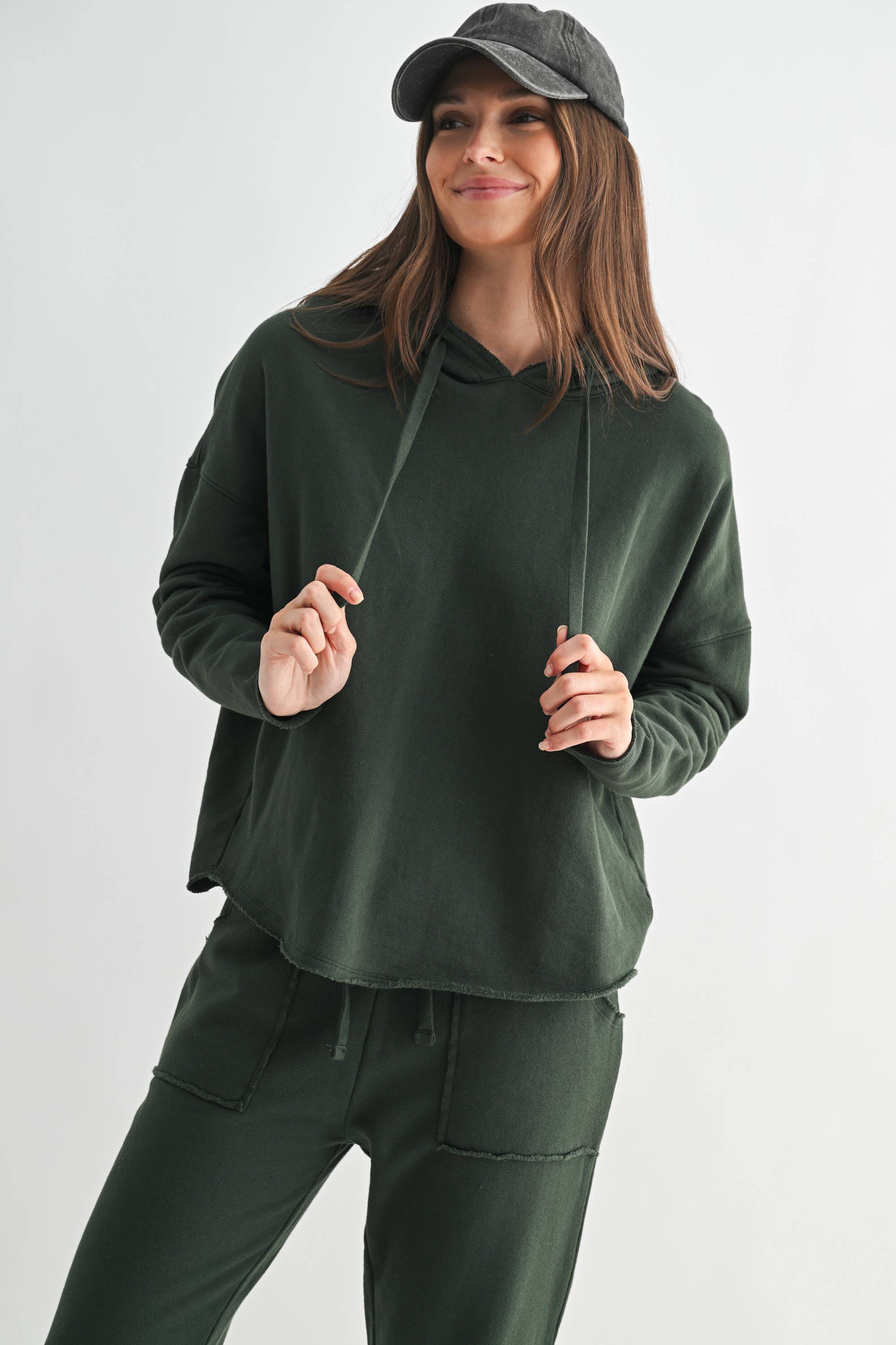 Loose-fit hoodie sweater made from durable 100% cotton for warmth and comfort. Features a big drawcord and raw-edge hem for a loved, worn-in vibe. Garment-washed for a uniquely soft feel. Perfect for errands, post-gym, or casual everyday wear! 100% cotton Katherine is a 5'9", a size 2, and is wearing an S.