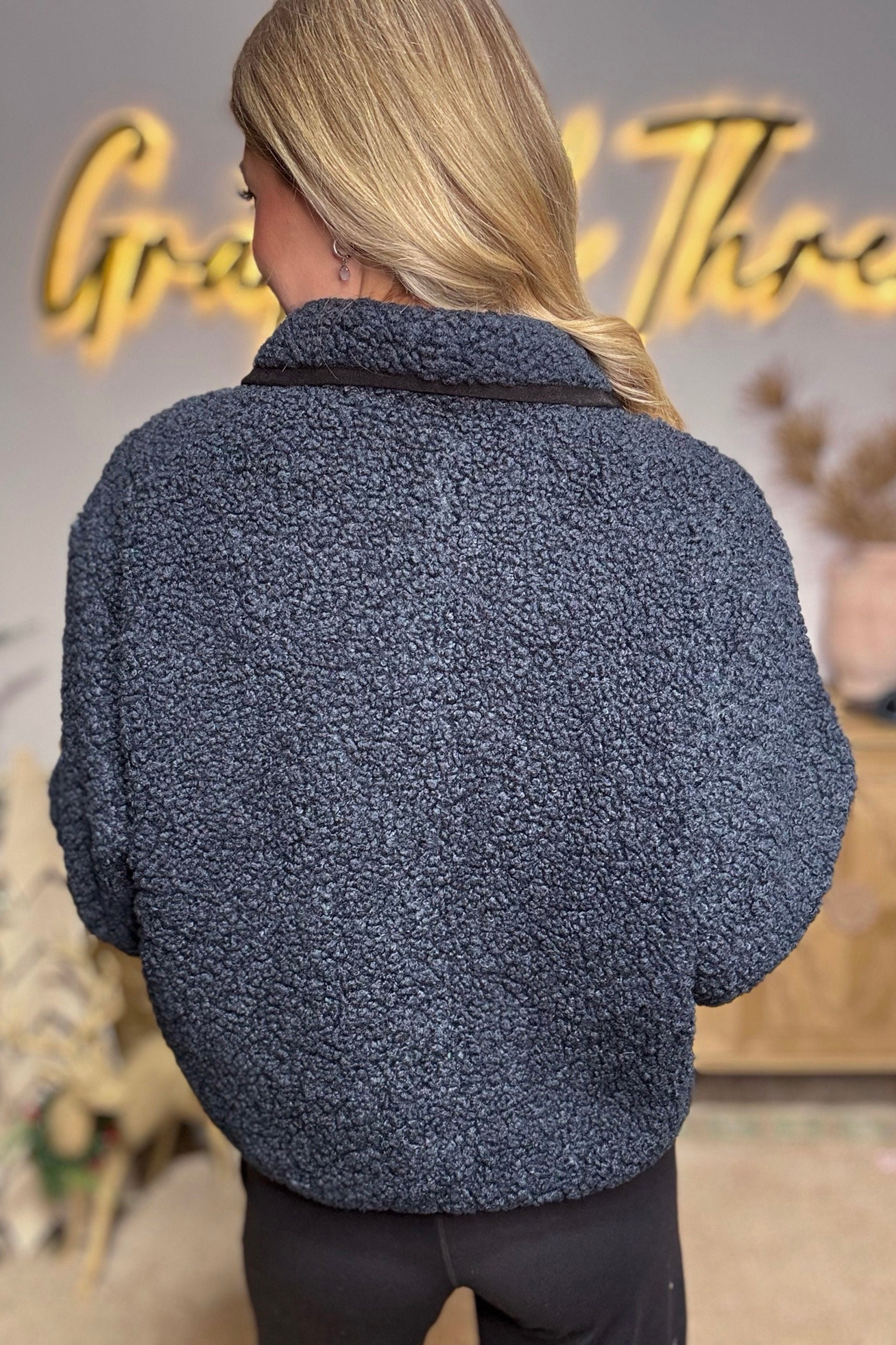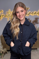 Meet the jacket that instantly elevates your cozy-girl game. This Le Lis Navy Sherpa Jacket features a plush teddy texture in a deep midnight black, trimmed with sleek contrast piping for that extra polished touch. The oversized fit, button-front closure, and warm pockets make it the perfect throw-on piece for chilly days when you still want to look effortlessly put together.