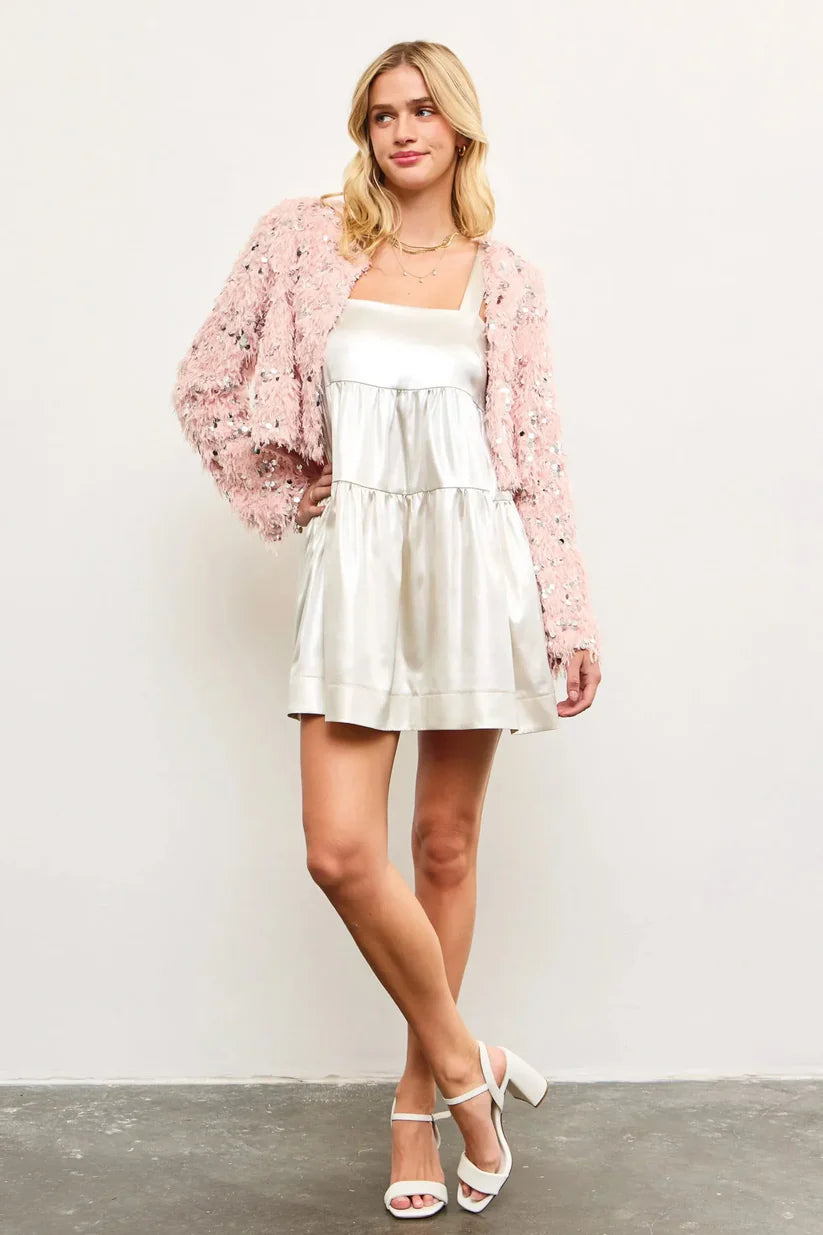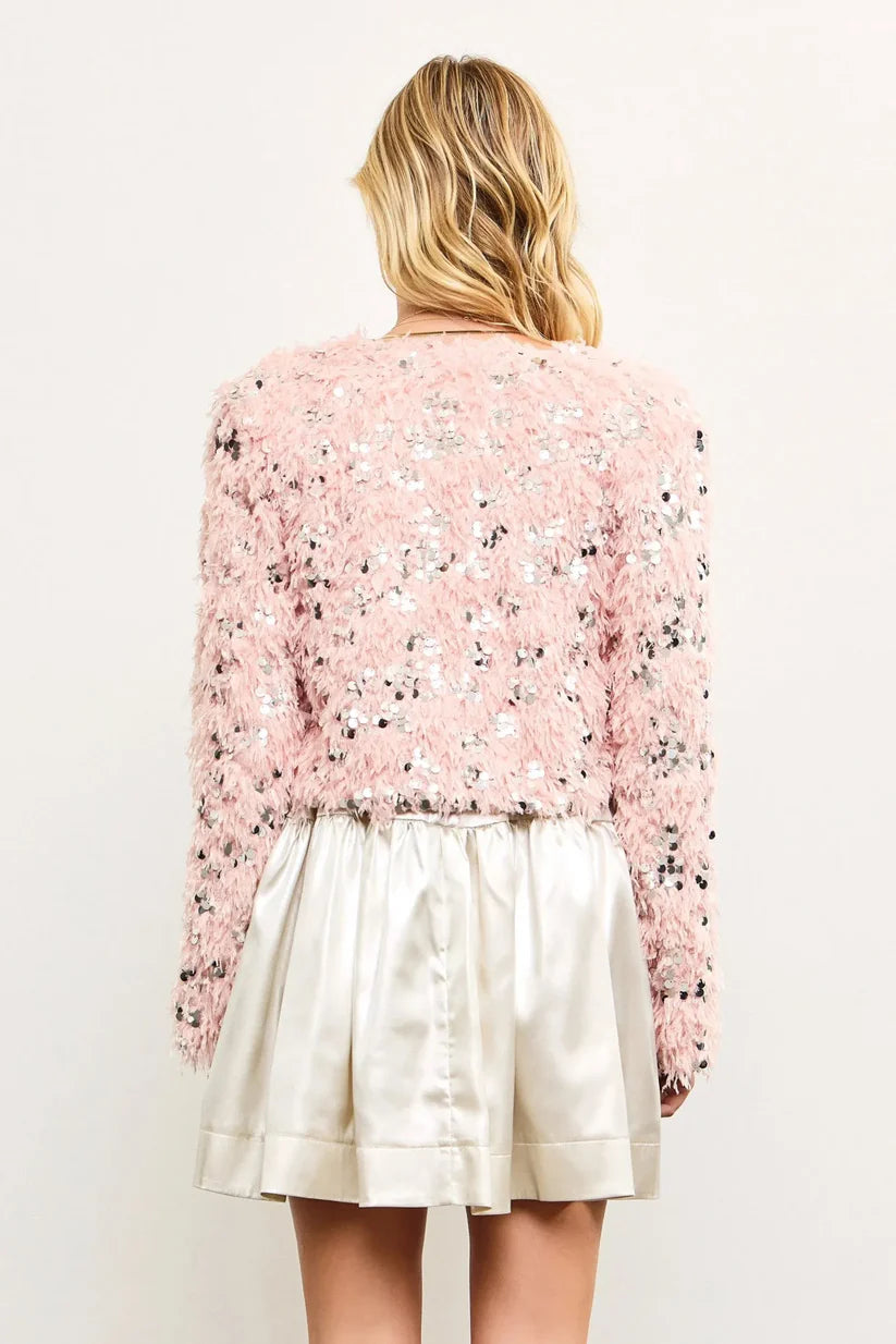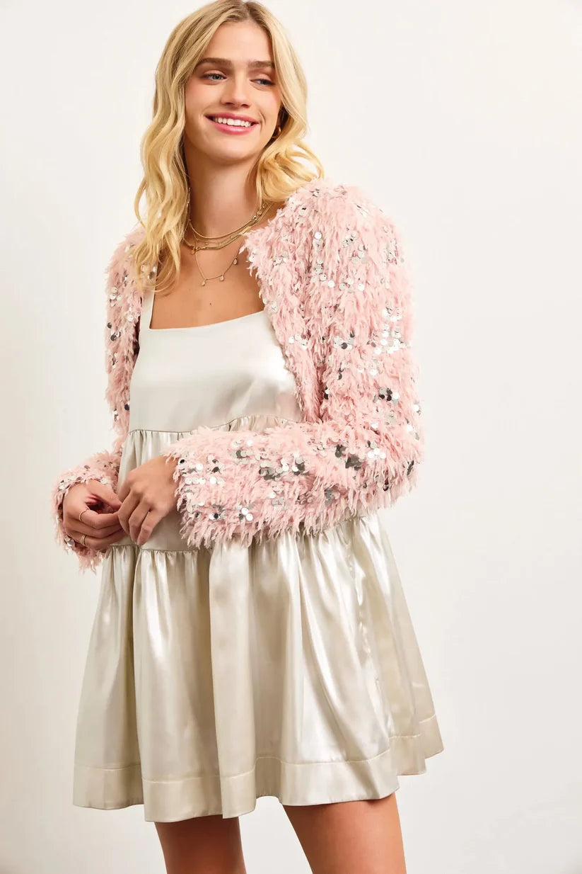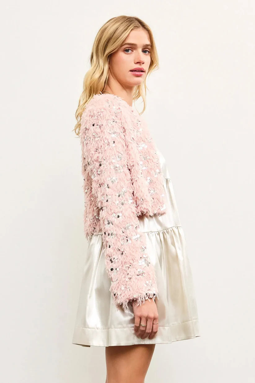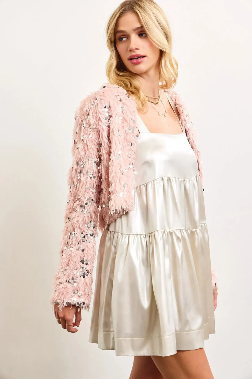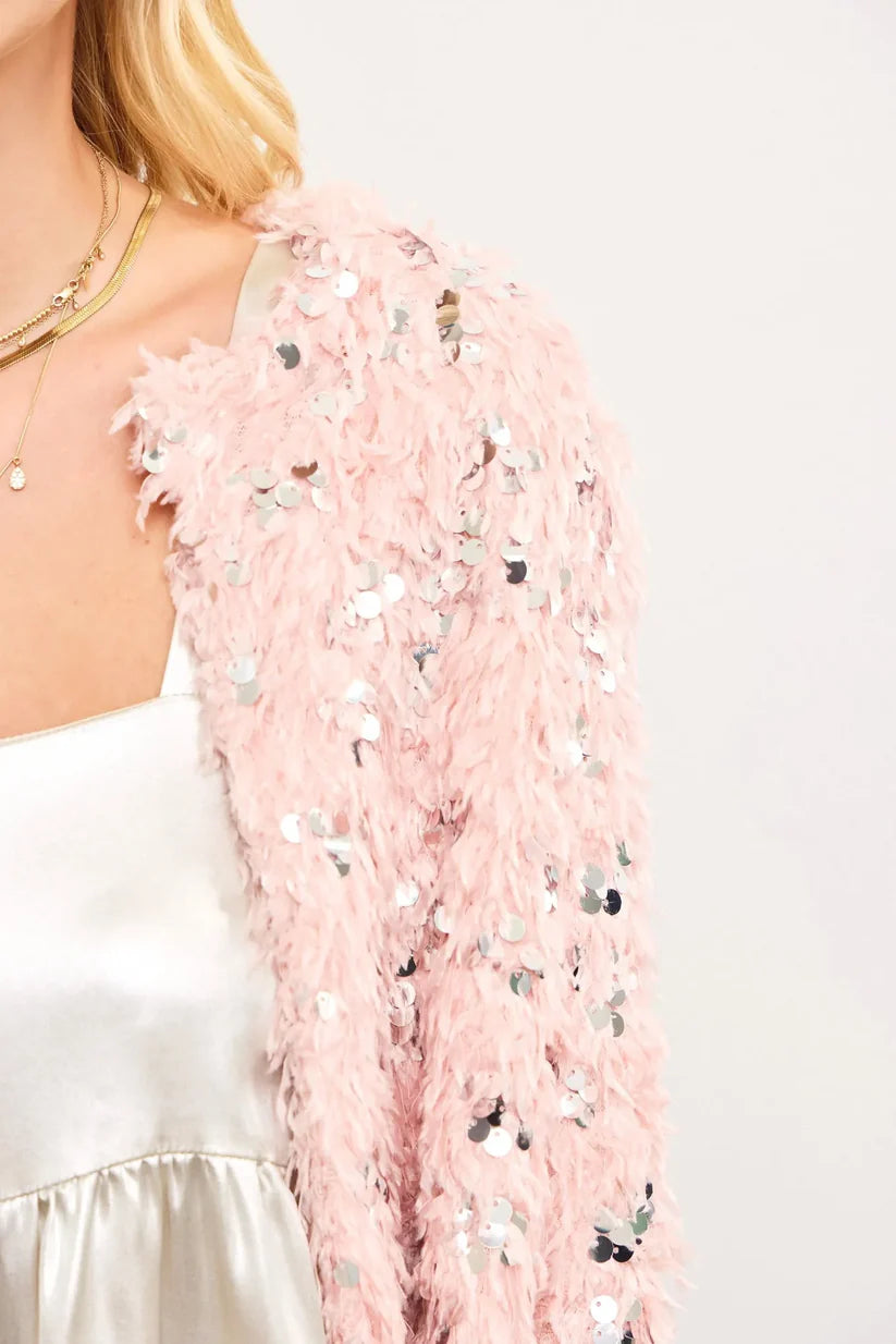 Sequin Faux Feather Padded Shoulder Cropped Jacket