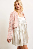 Elevate your style with our Sequin Faux Feather Padded Shoulder Cropped Jacket. Featuring a unique blend of sequins and faux feathers, this jacket adds a touch of glamour to any outfit. The padded shoulders provide structure and a flattering silhouette. Perfect for a night out or special occasion.