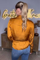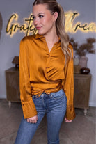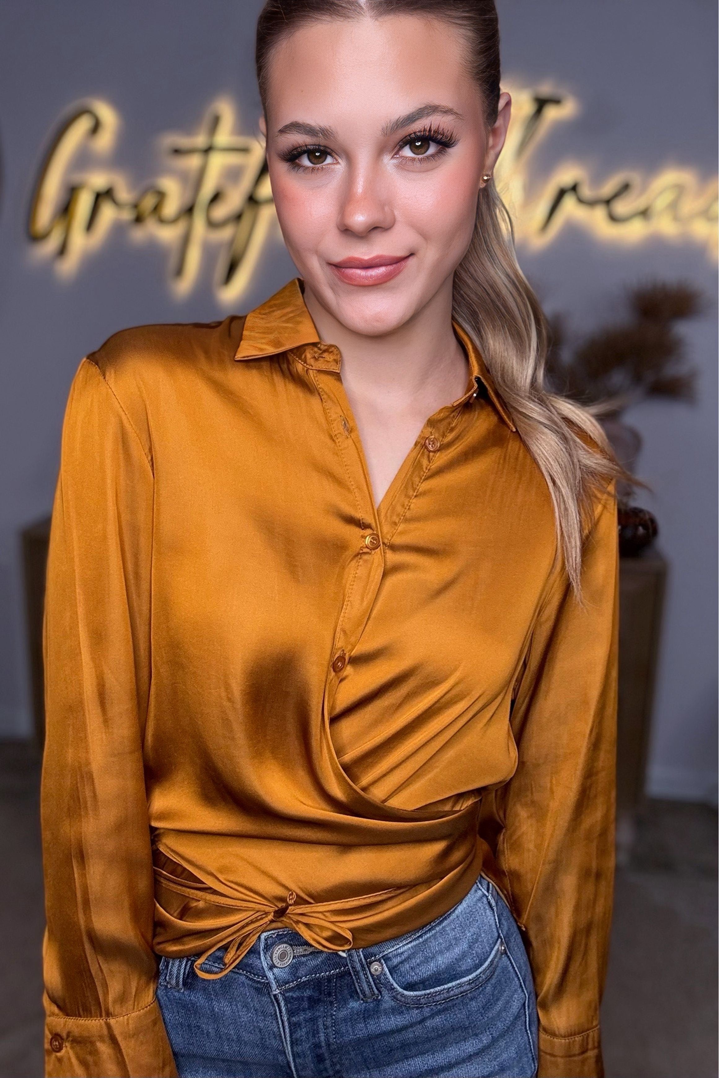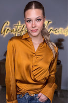 Meet your new statement top: the Golden Hour Satin Wrap Blouse by Mustard Seed. Crafted in a luxe, silky satin with a warm golden-amber hue, this blouse brings instant glow to any outfit. The wrapped front design creates a flattering, cinched silhouette, while the button-down collar adds a touch of effortless polish. Dramatic wide cuffs elevate the look even more, giving this top that perfect blend of classy, bold, and modern.