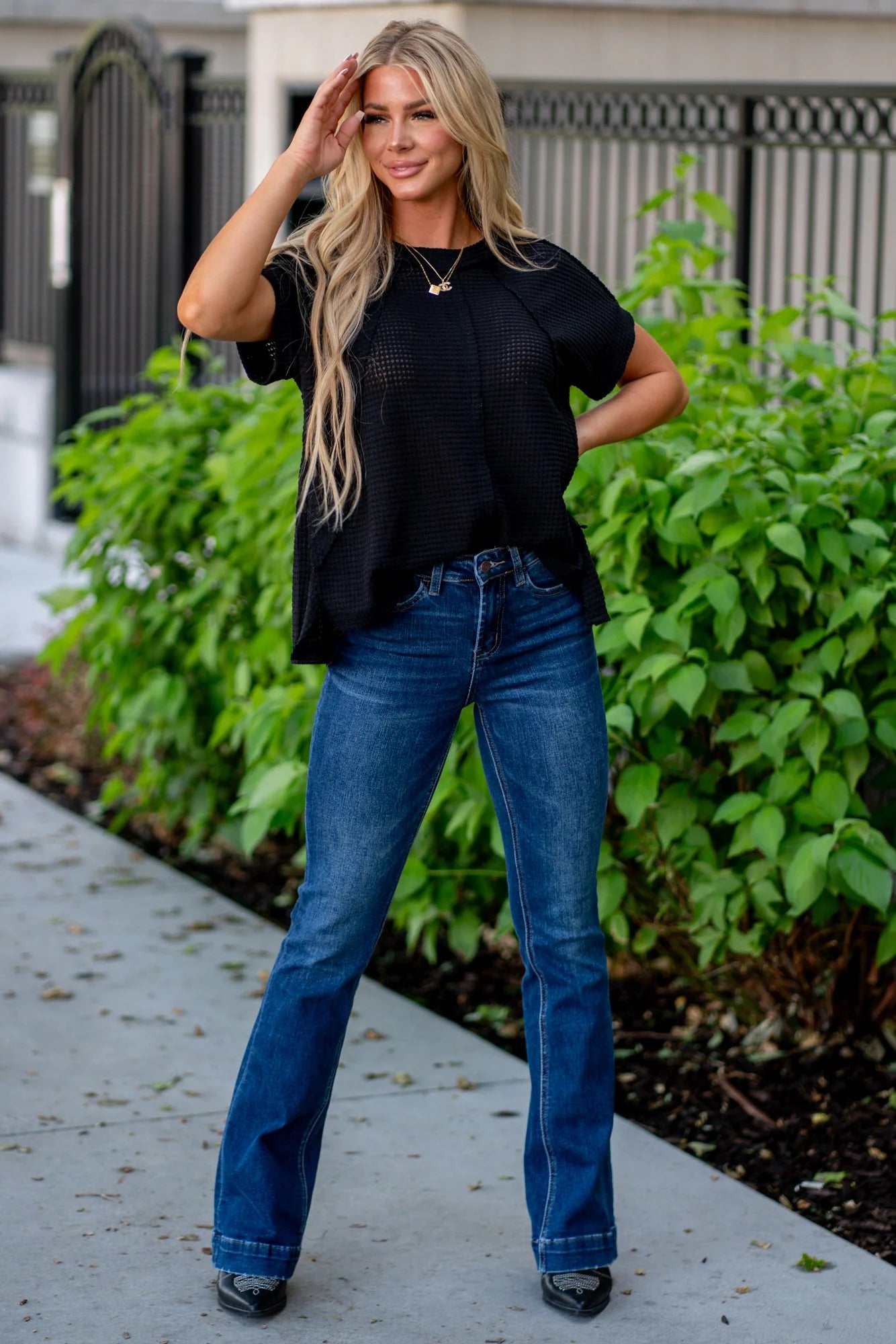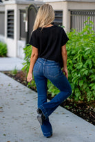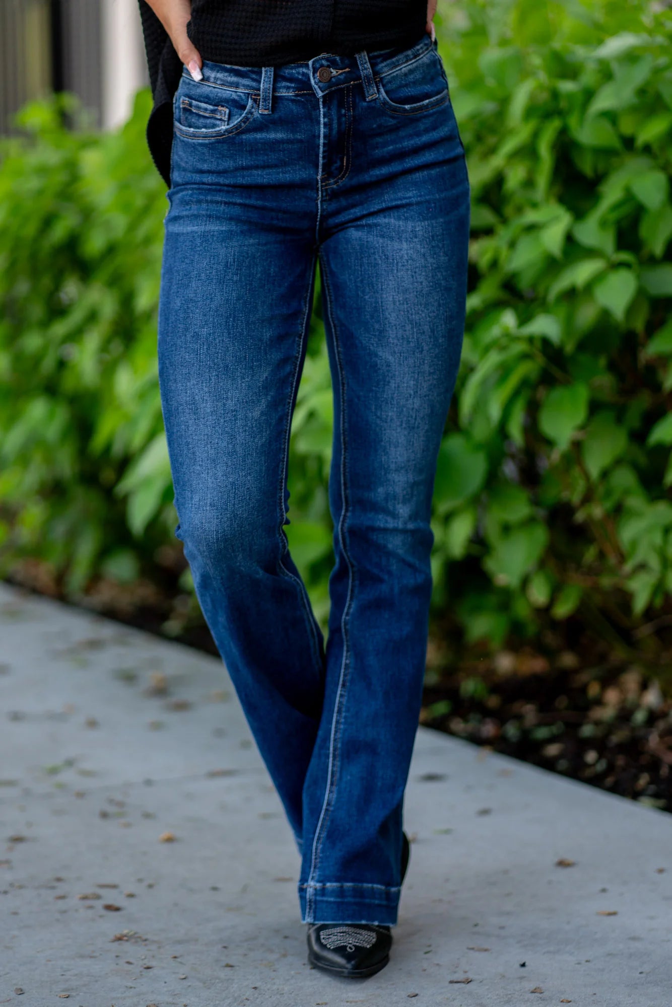 These Vervet High Rise Dark Wash Trousers Hem Bootcut Jeans for Women provides a flattering silhouette while the bow leg style offers comfort and versatility. Elevate your denim game with these limited edition jeans!
