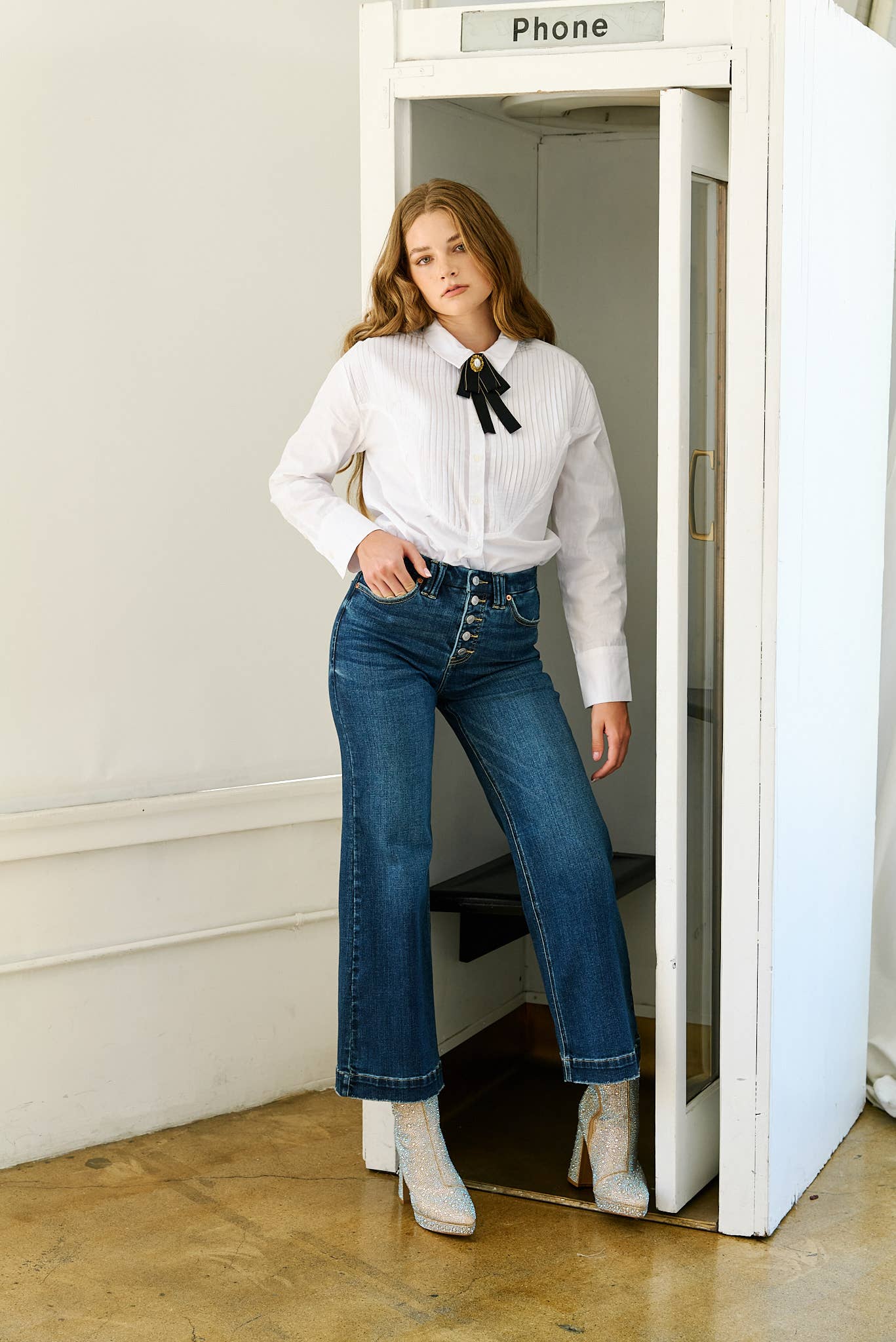 By securing the pocket lining to the J-stitch, this construction helps to flatten and shape the midsection while maintaining a natural and comfortable fit. The result is a pair of jeans that enhances your silhouette and provides the structure and support you need for all-day confidence. -HIDDEN TUMMY CONTROL POCKETS -STRETCH DENIM -HIGH RISE -WIDE HEM -EXPOSED BUTTON -MEDIUM STONE WASH FRONT RISE : 11" INSEAM : 31"
