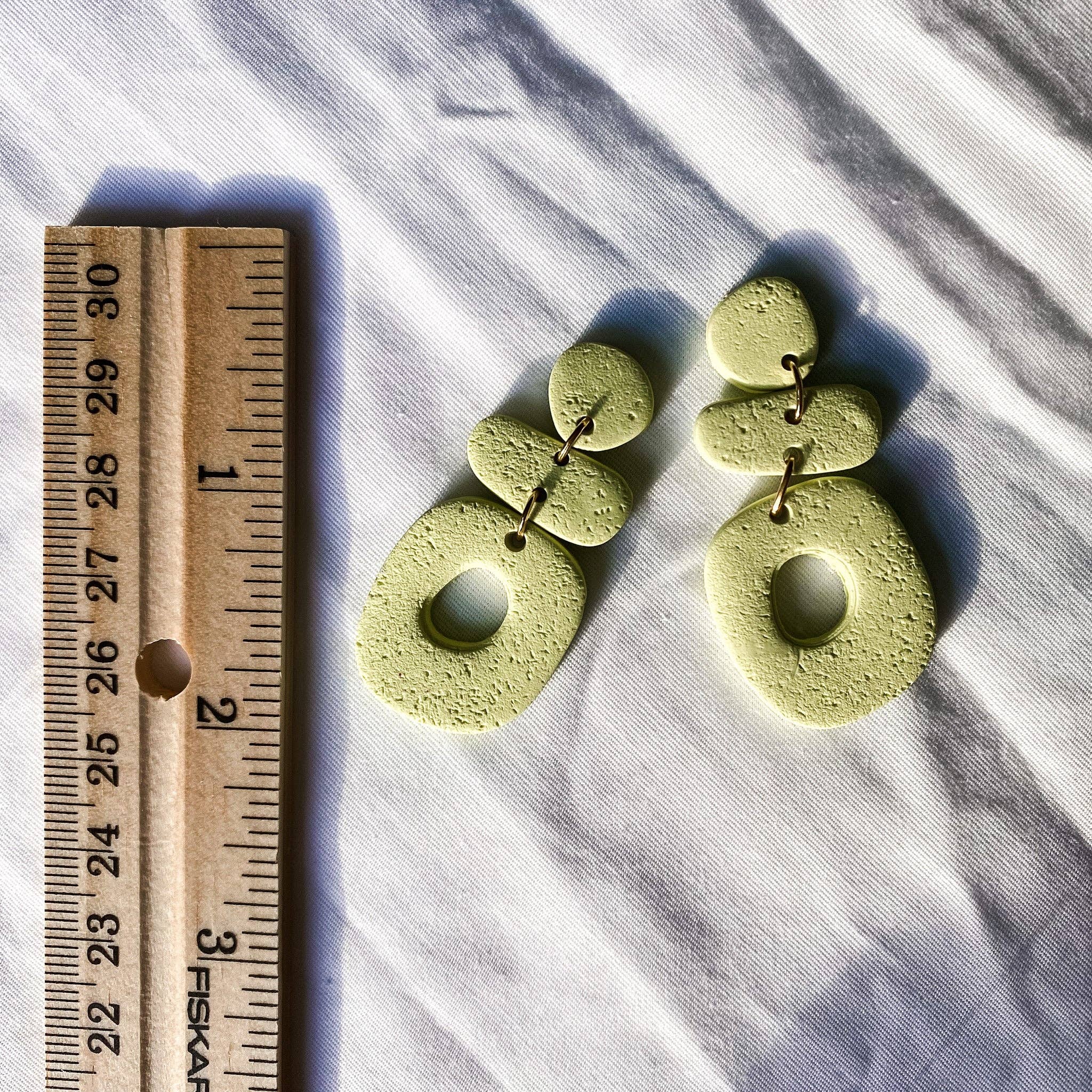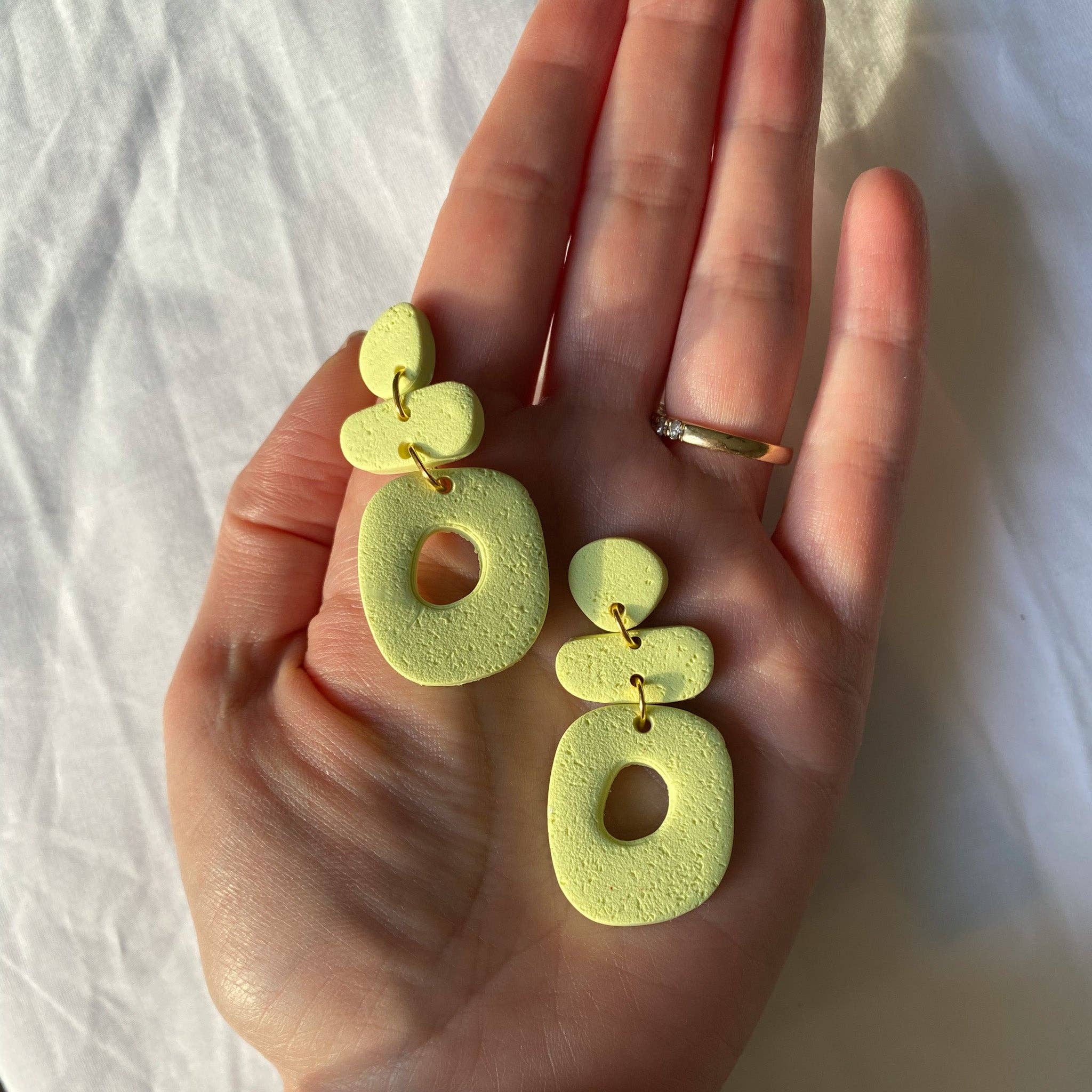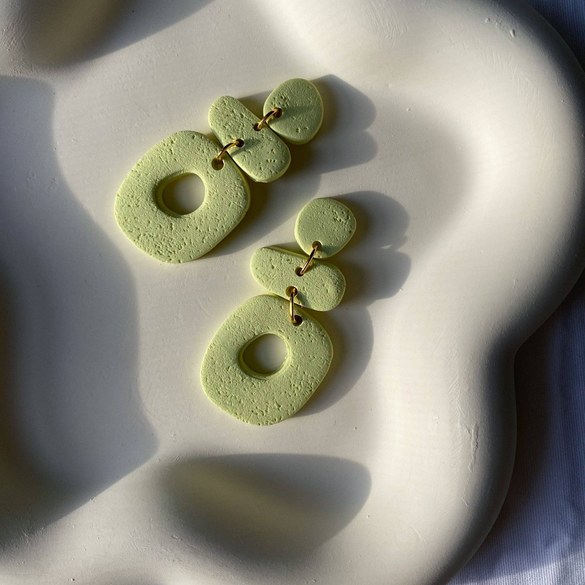 These green abstract earrings are here just in time for spring and summer! Elevate your outfit with a pop of color! * Made from Polymer Clay- an ultra-lightweight material * Each pair is unique and made to order * Nickel-free findings * Size is in listing images  *Please note that because this is a handmade item, each pair may slightly vary from the listing images. These are made to order and have a 5-10 business day processing time. Be sure to check our shipping and Policy page :)