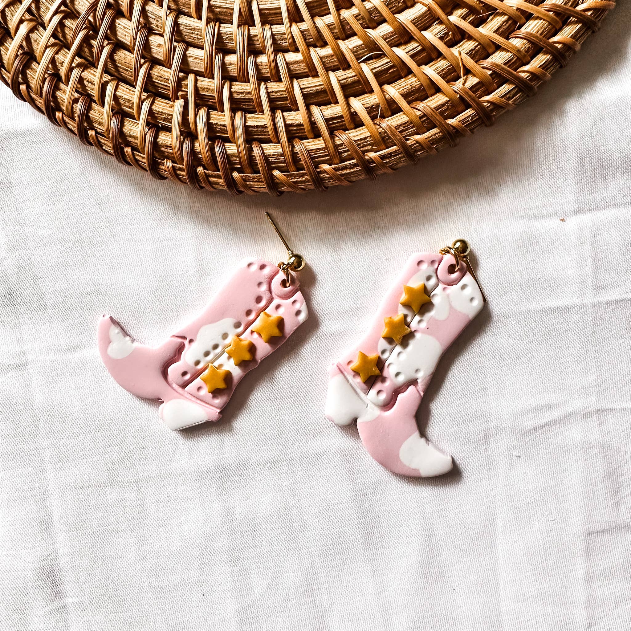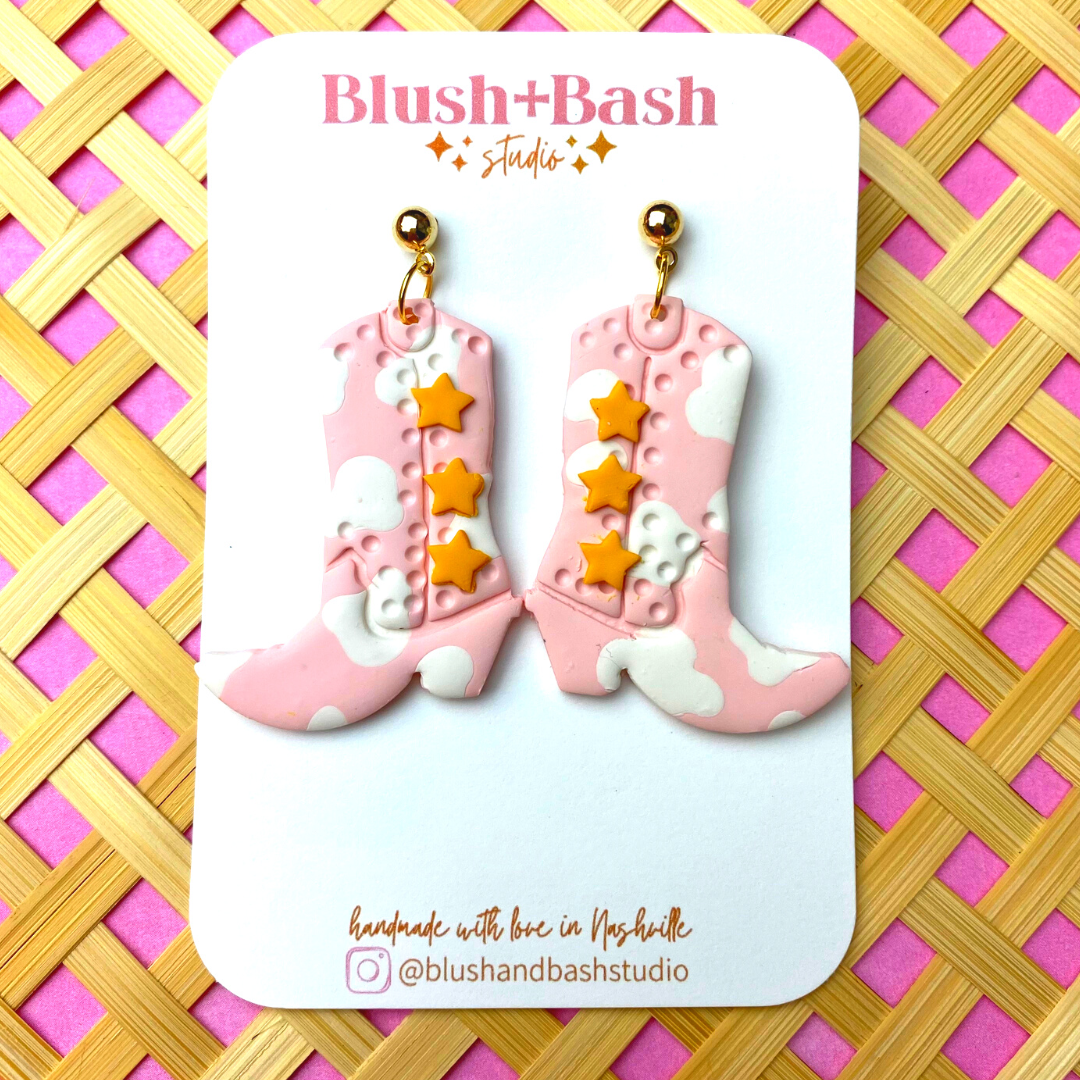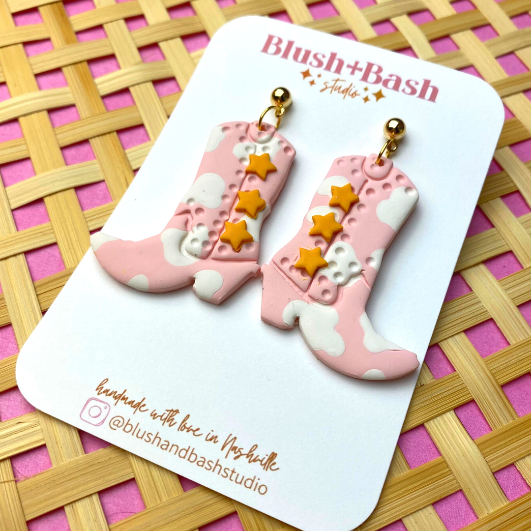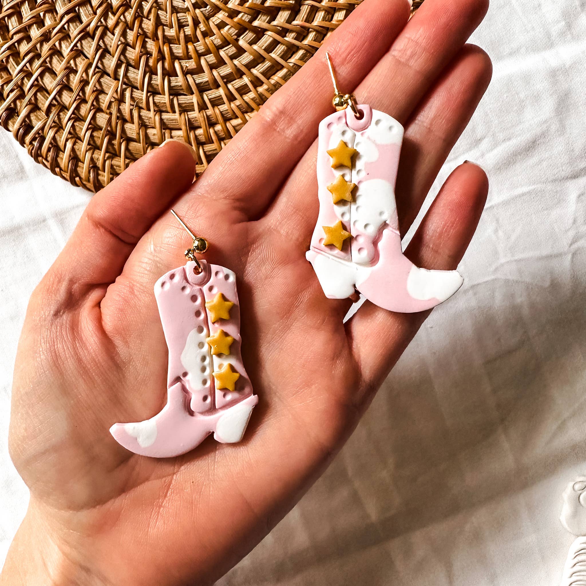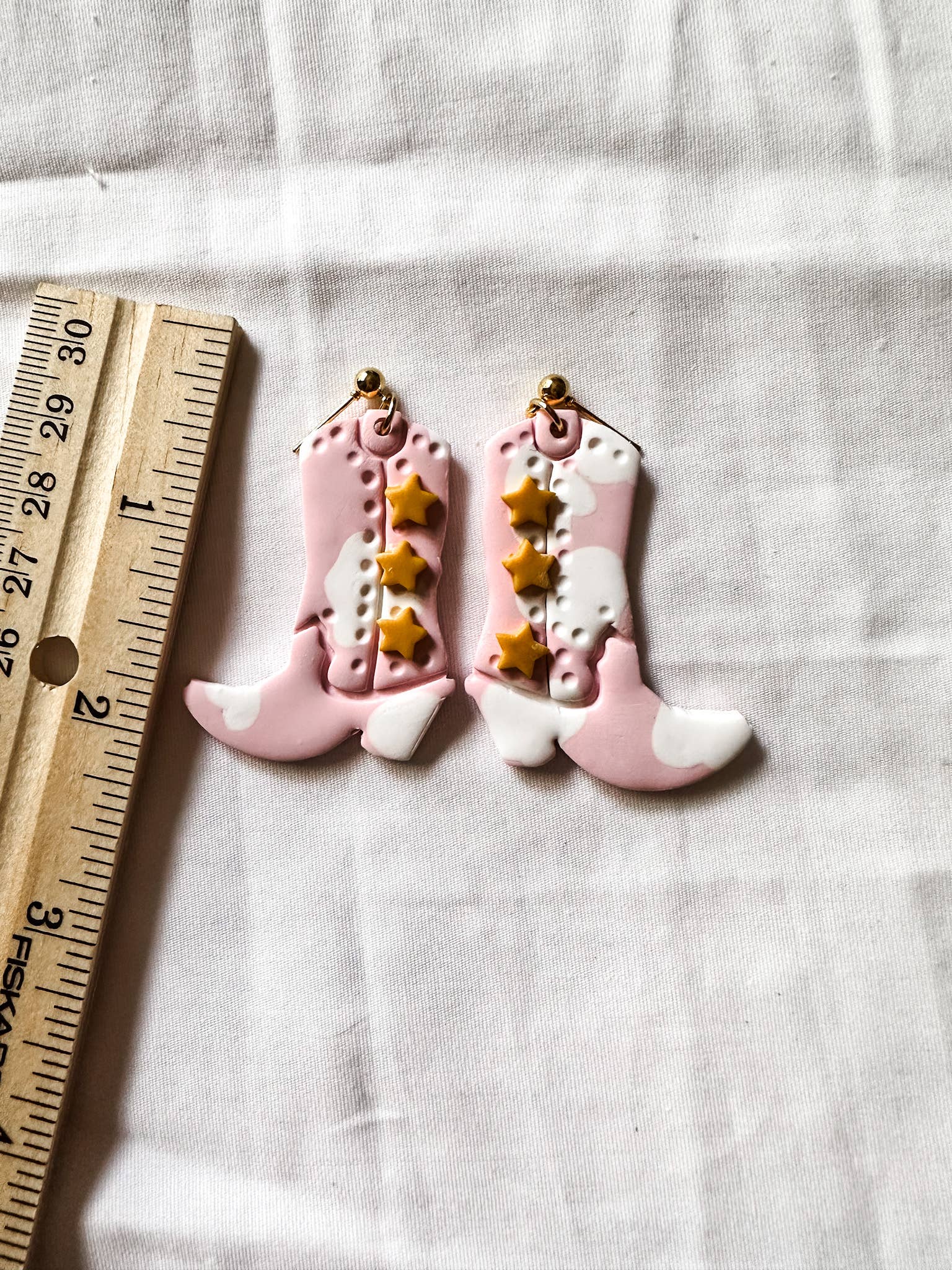 These Cow Print Cow Girl Boot Earrings are handmade with love in Nashville Tennessee!