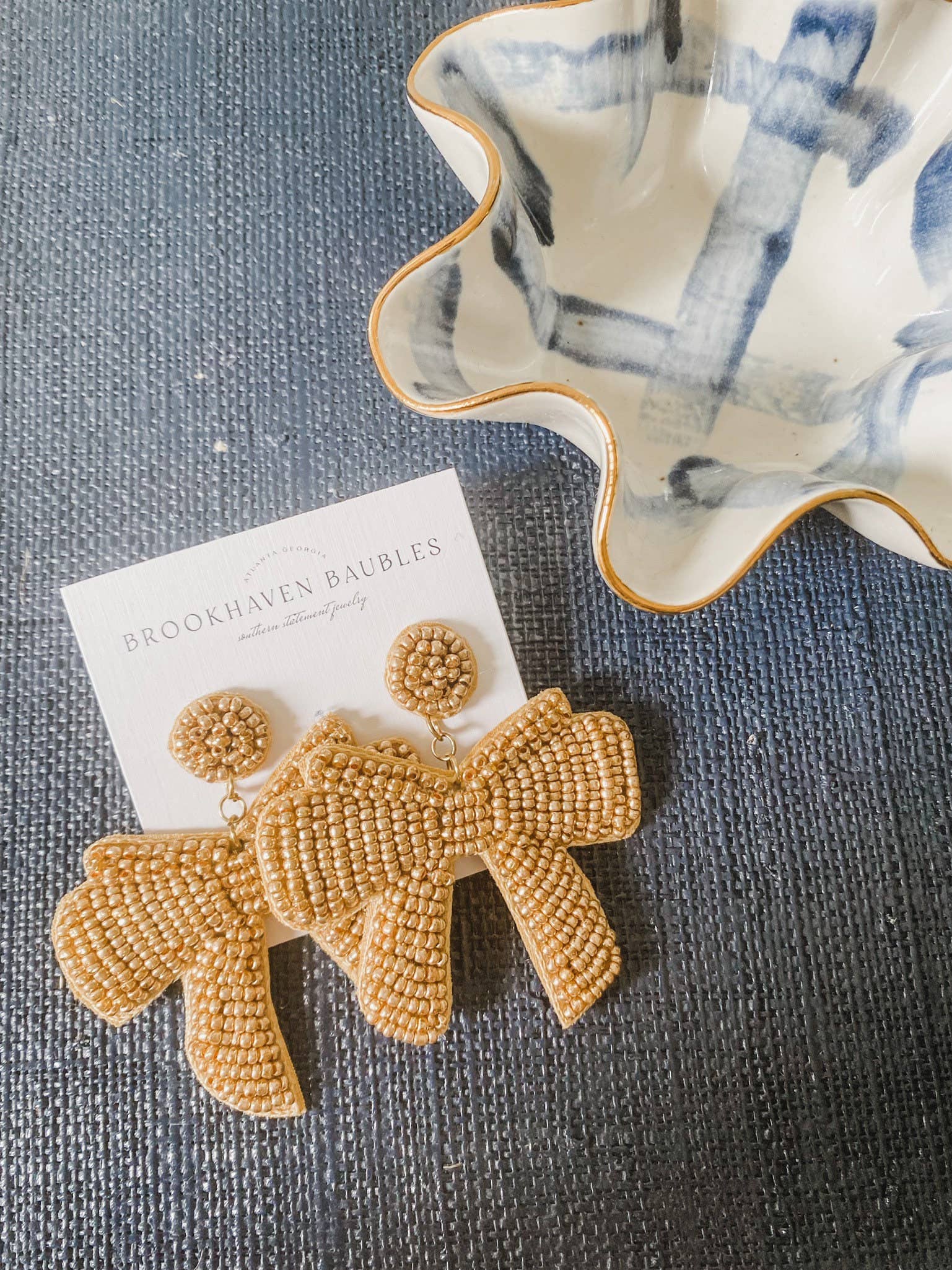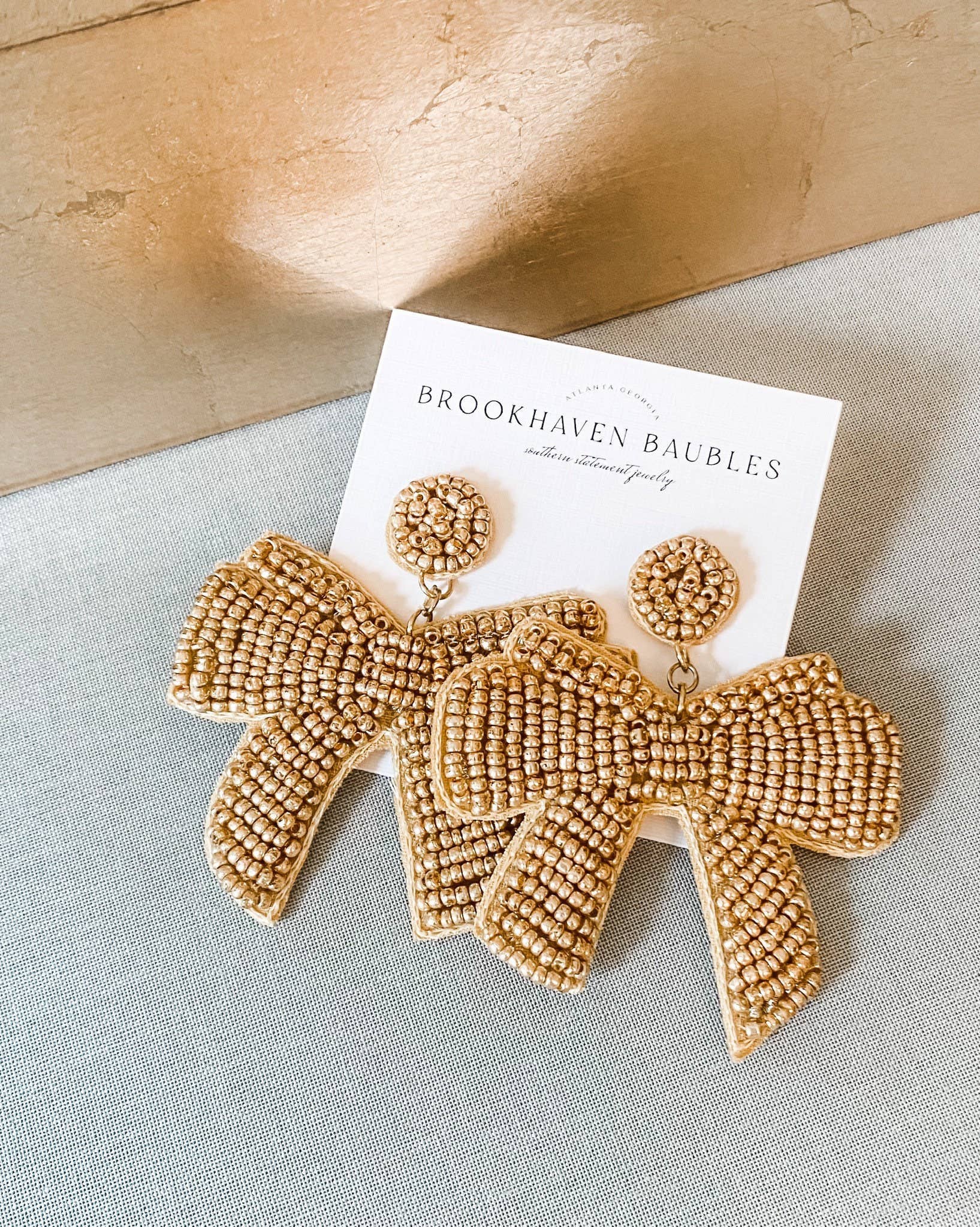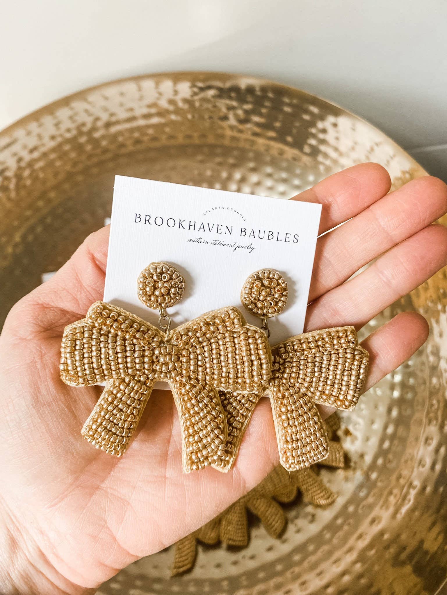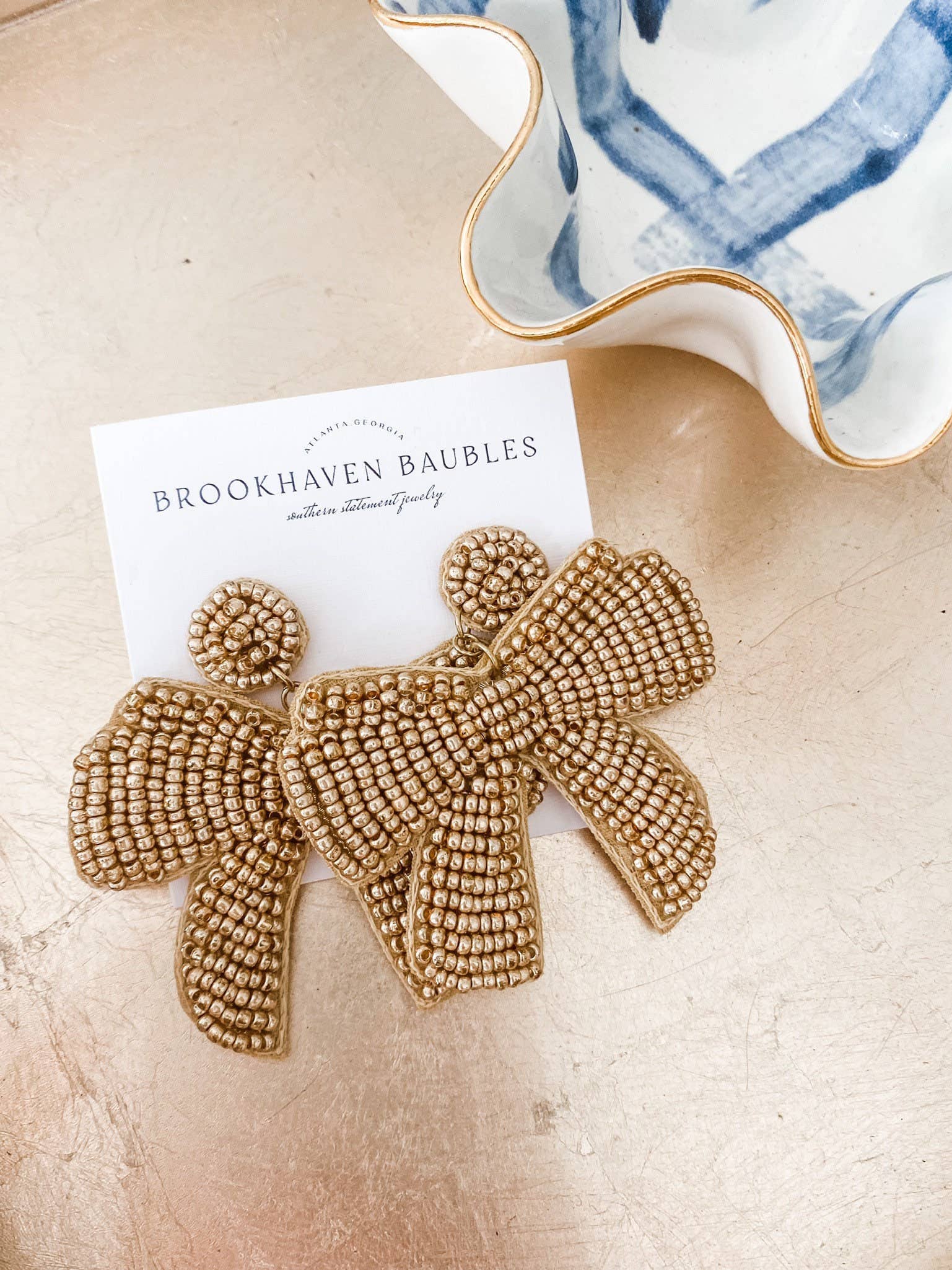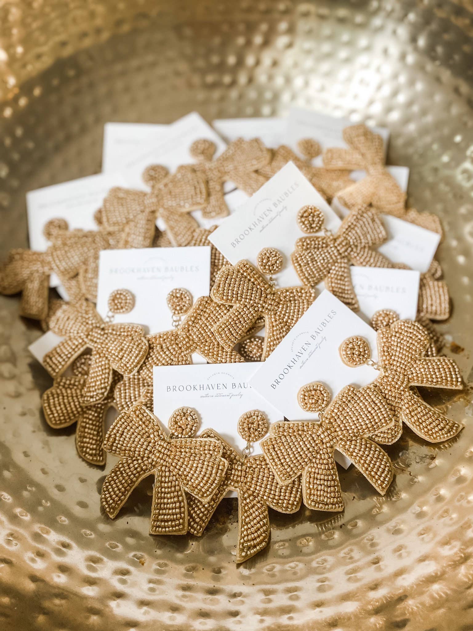 Celebrate the festive season in style with the Gold Bow Beaded Statement Earrings from Brookhaven Baubles. These stunning earrings feature a beautiful gold bow design, intricately crafted with shimmering beads, perfect for adding a touch of cheer to any outfit. Lightweight and comfortable, they are ideal for all your festive gatherings and celebrations.