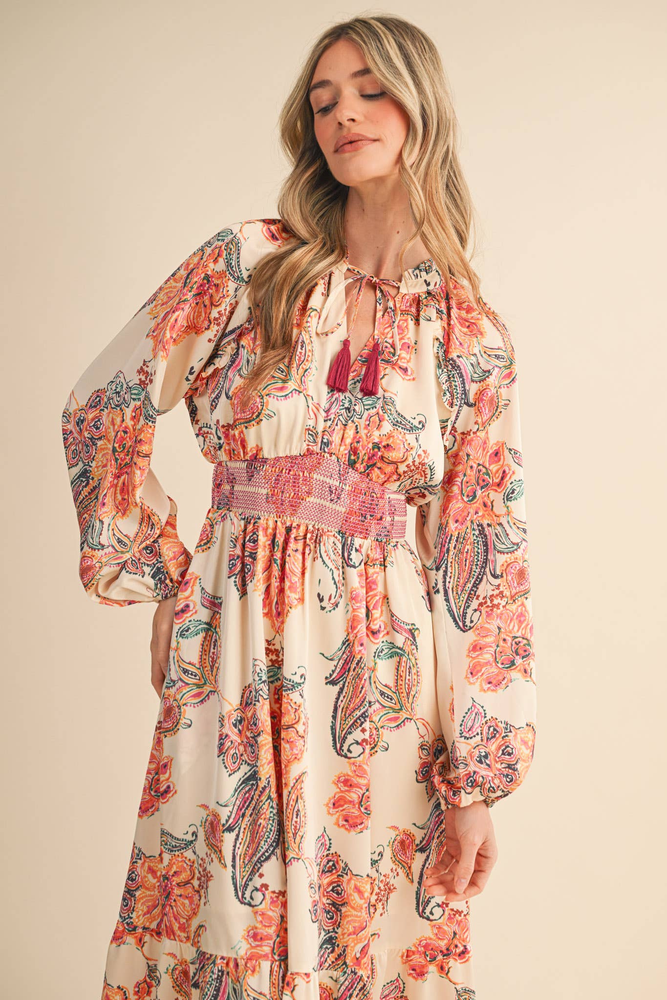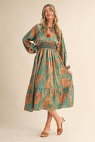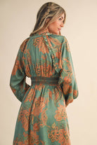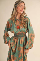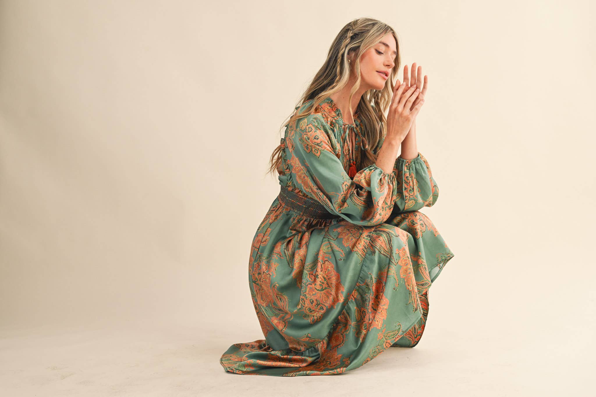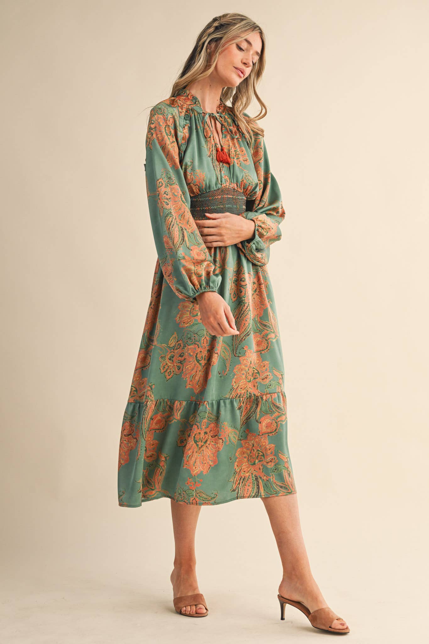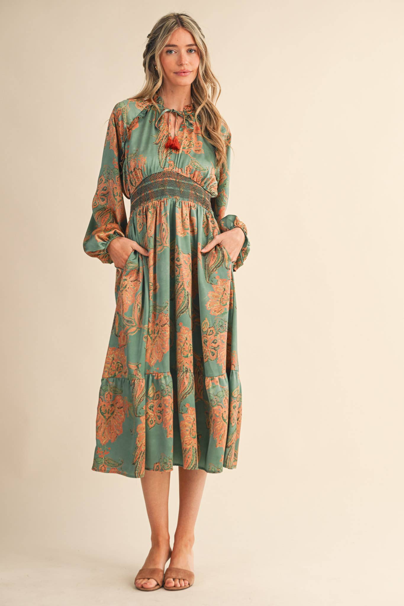 &merci - PAISLEY PRINT SMOCKED MIDI DRESS: EMERALD MULTI PAISLE