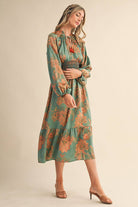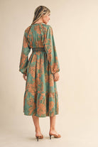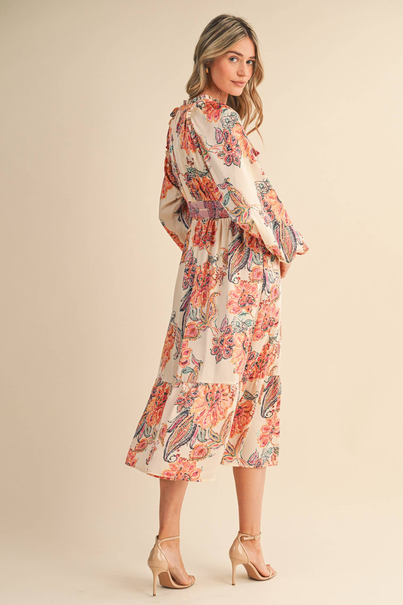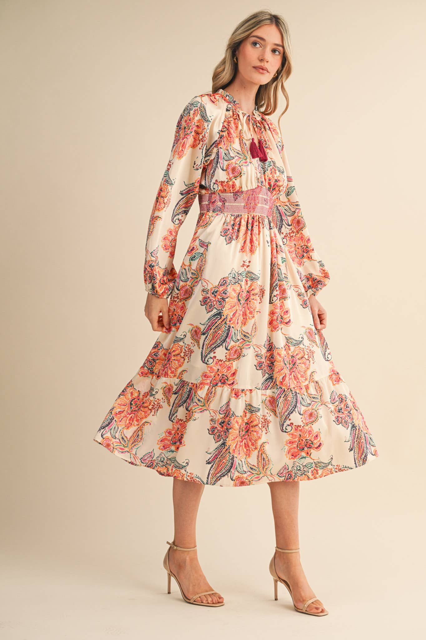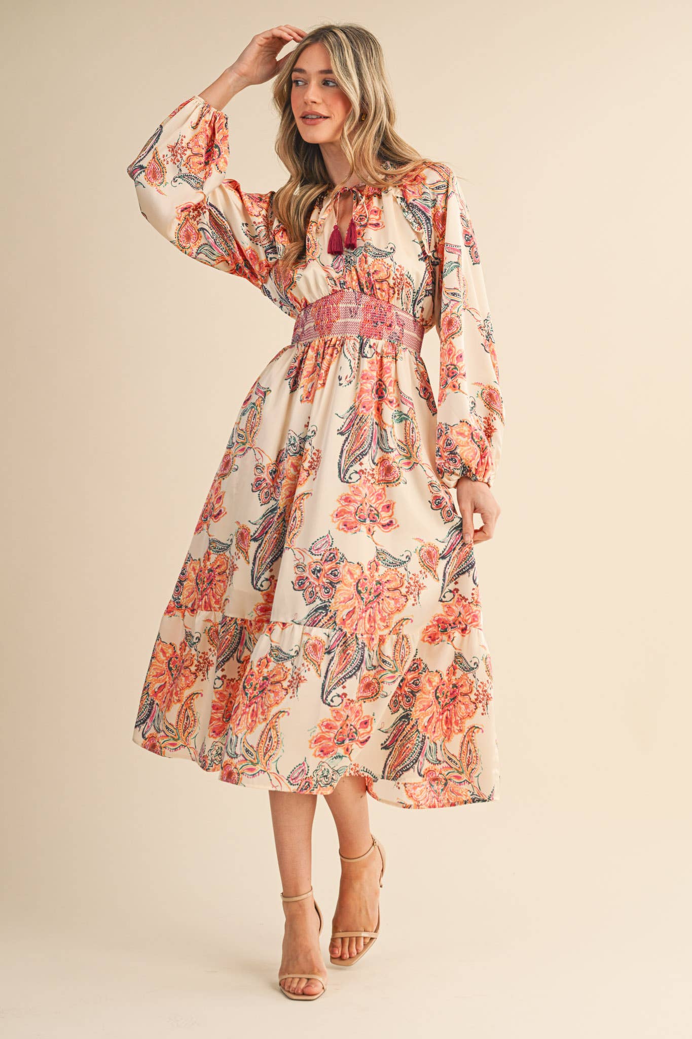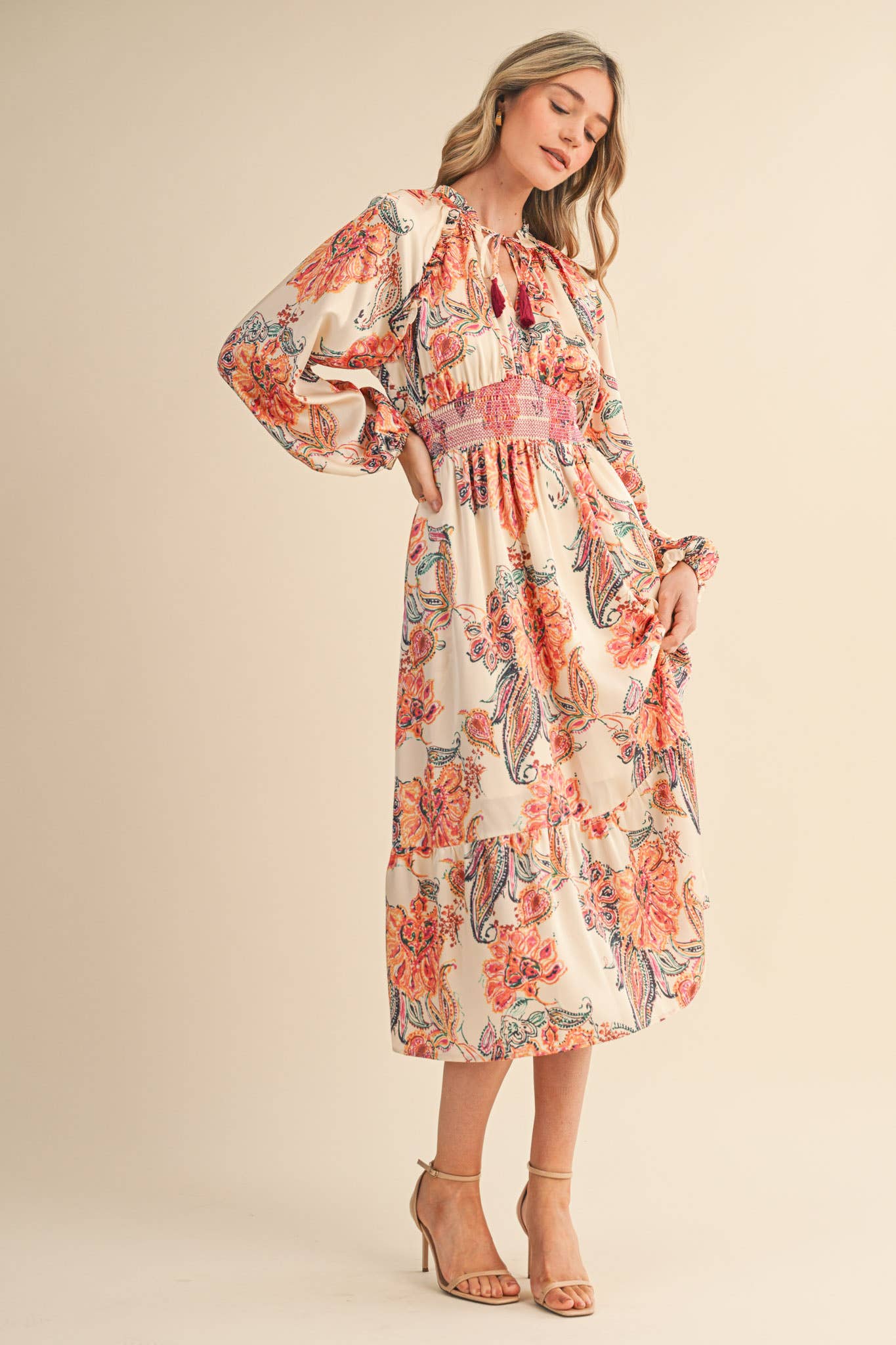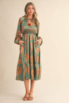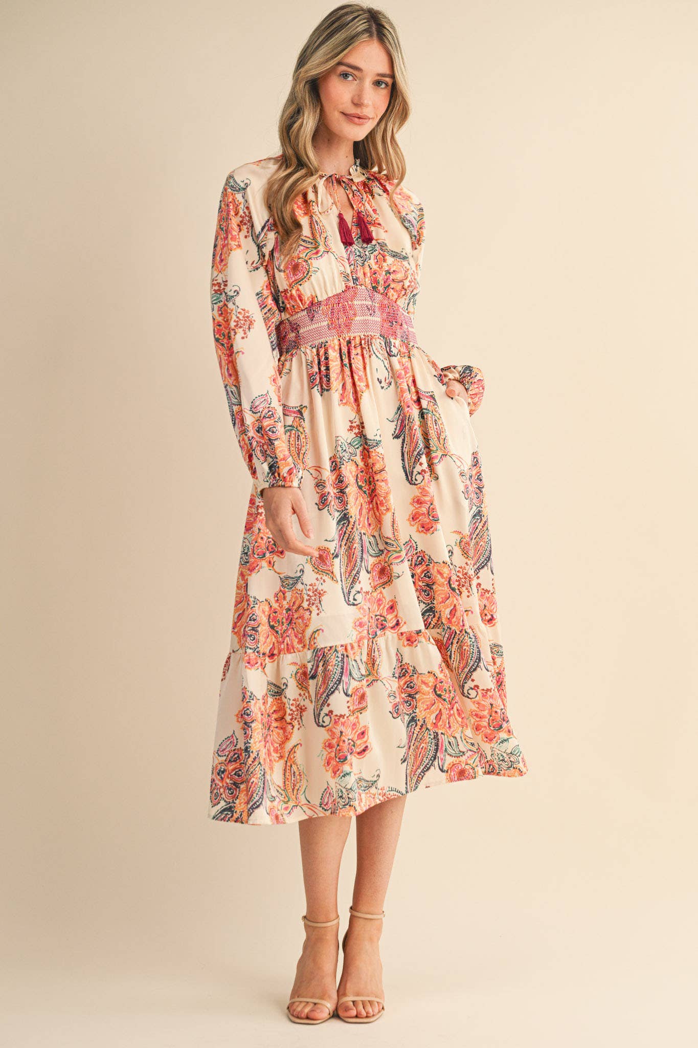 &merci - PAISLEY PRINT SMOCKED MIDI DRESS: EMERALD MULTI PAISLE