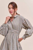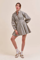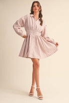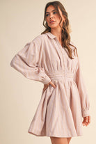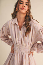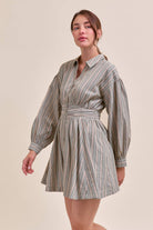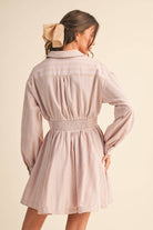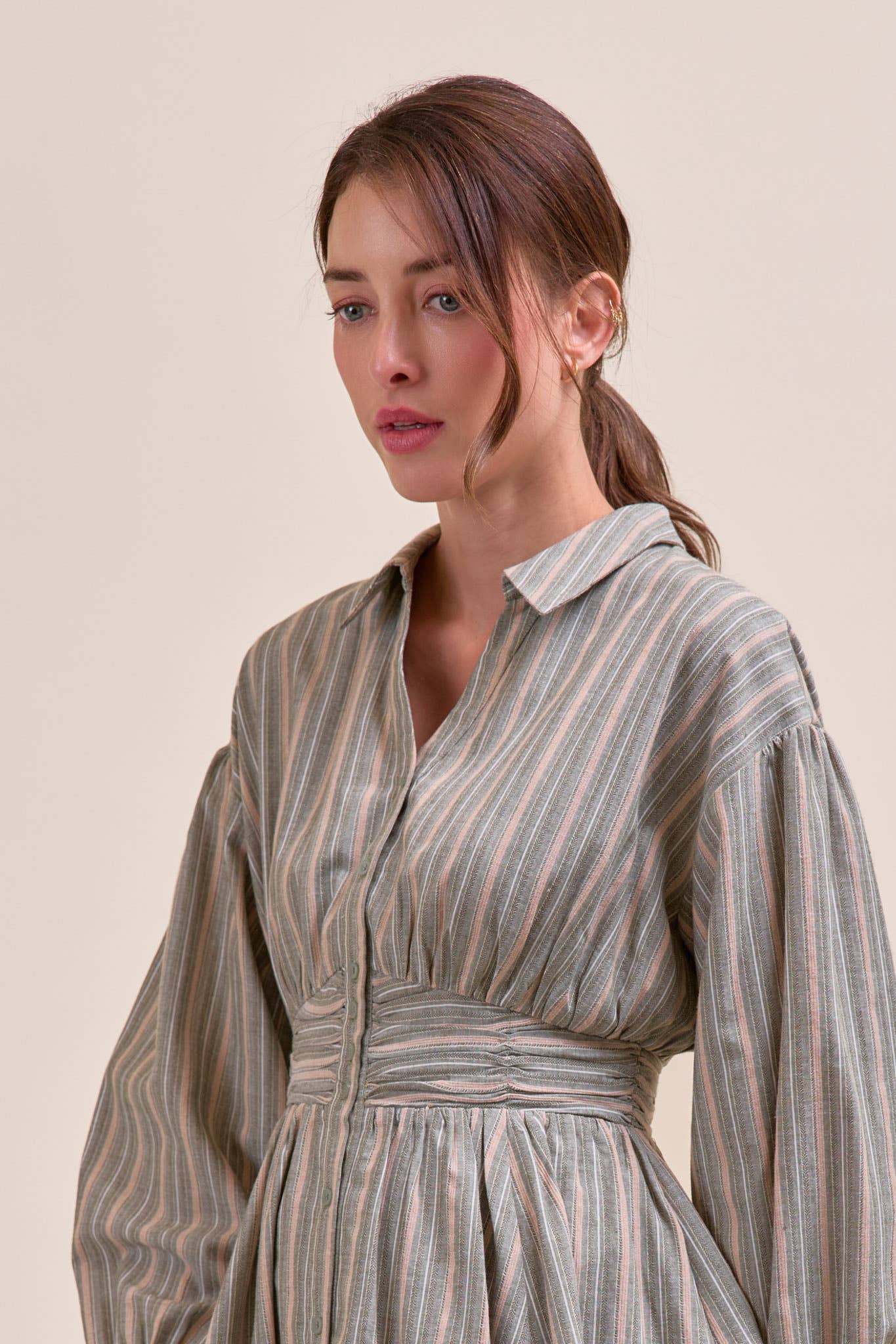 &MERCI - STRIPED BUTTON DOWN RUCHED WAIST MINI DRESS: Blush Multi Stripe