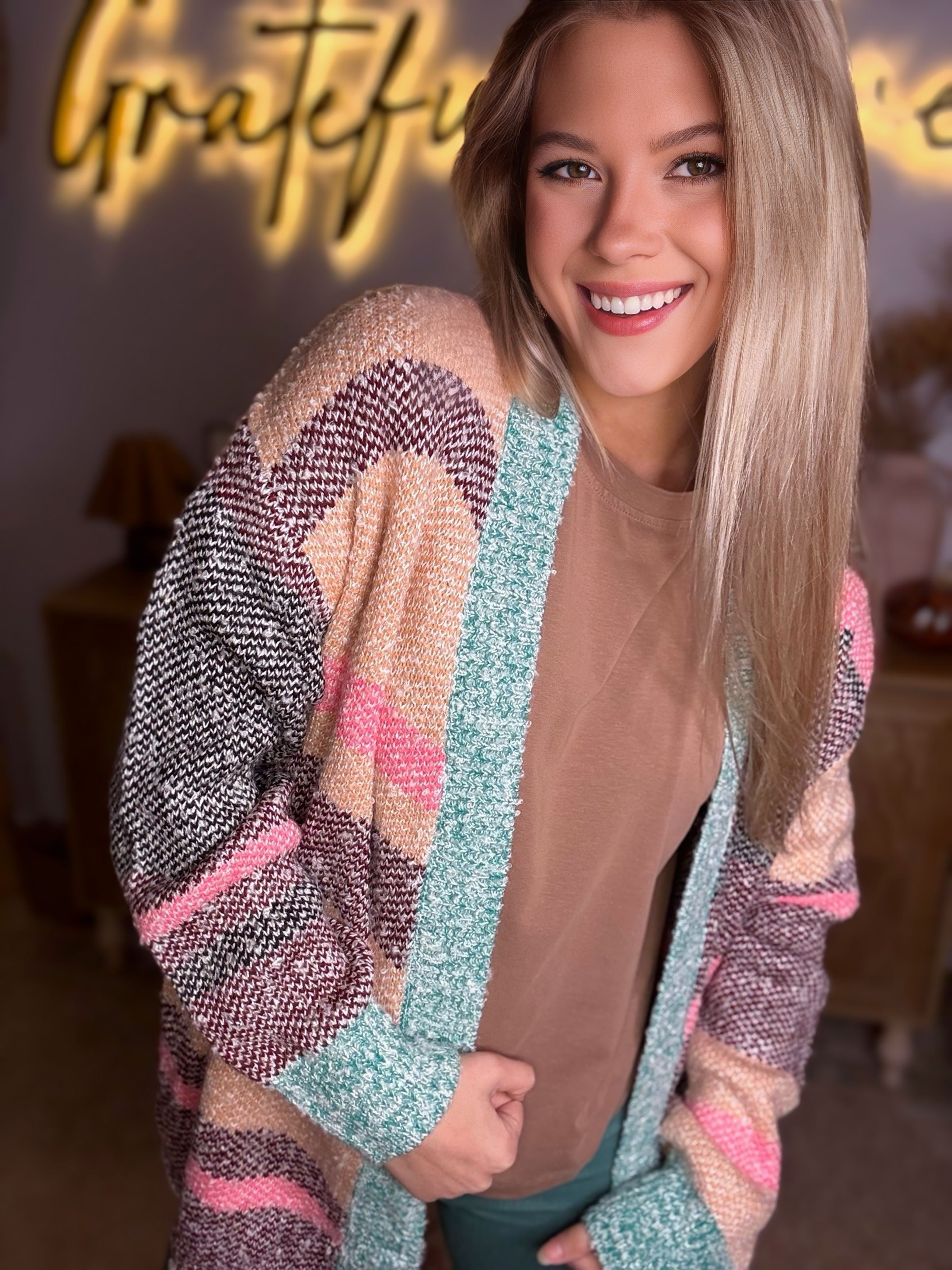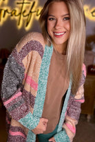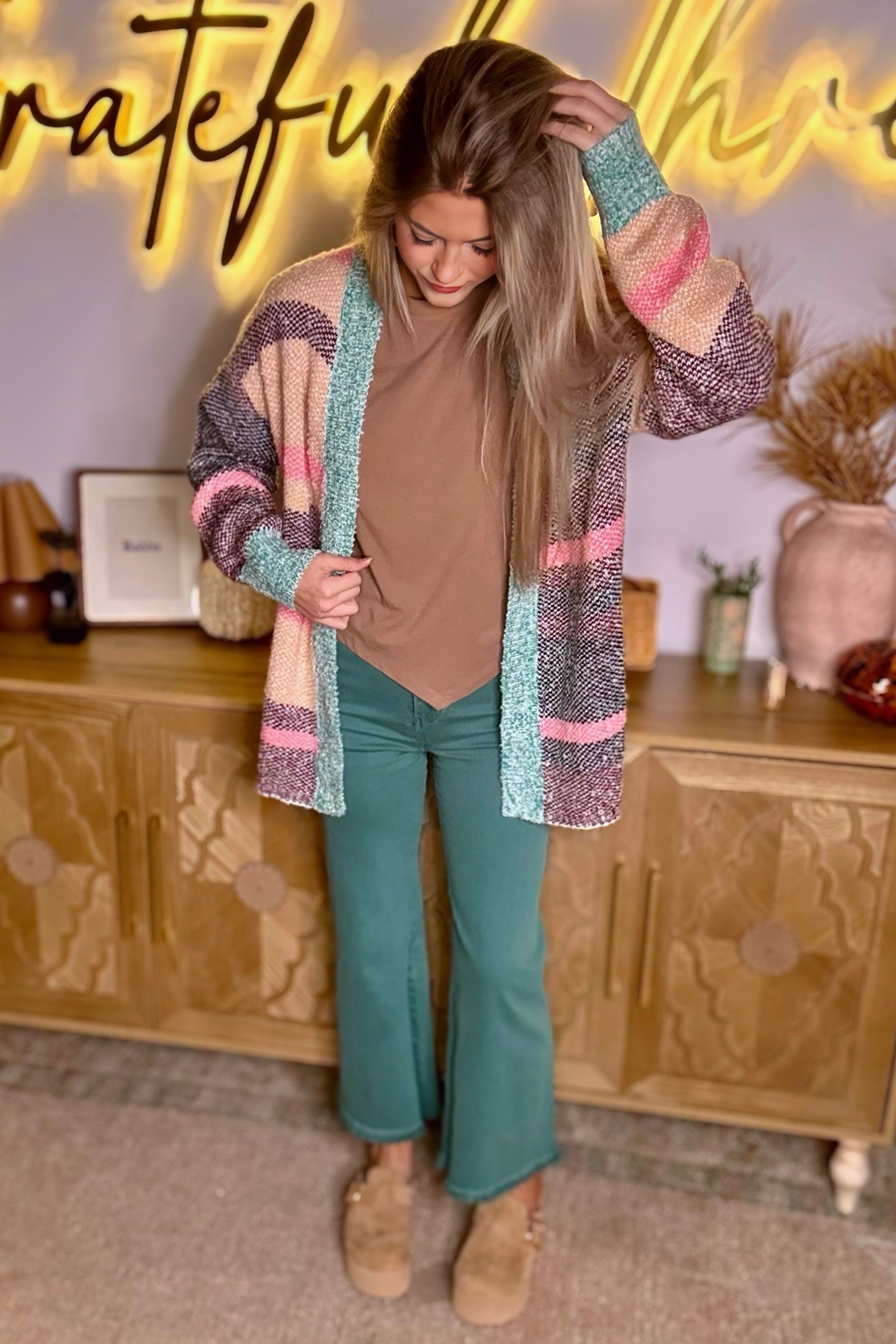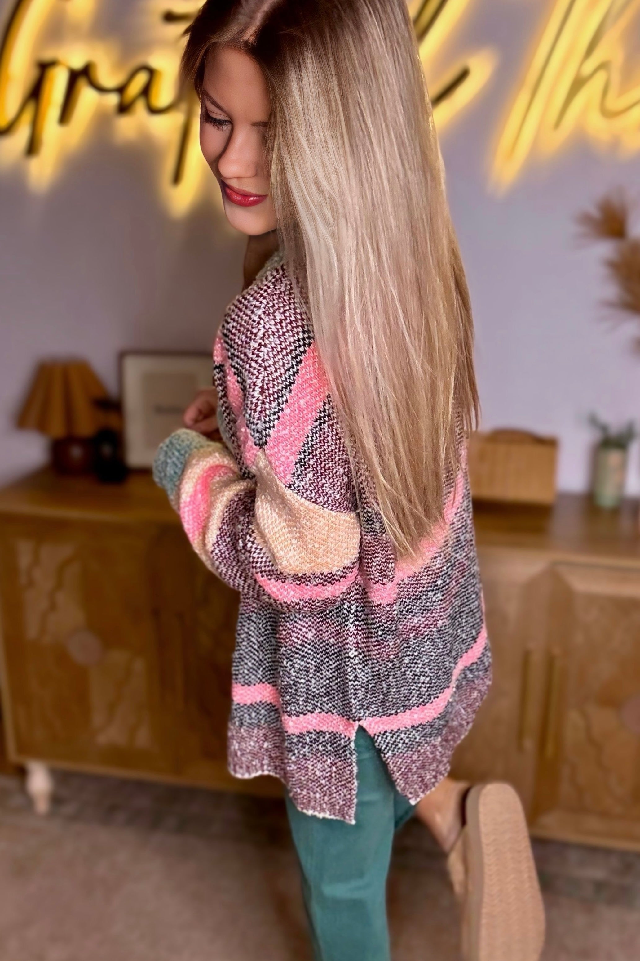 Multicolor Color Block Striped Side Slit Open Front Cardigan