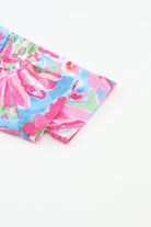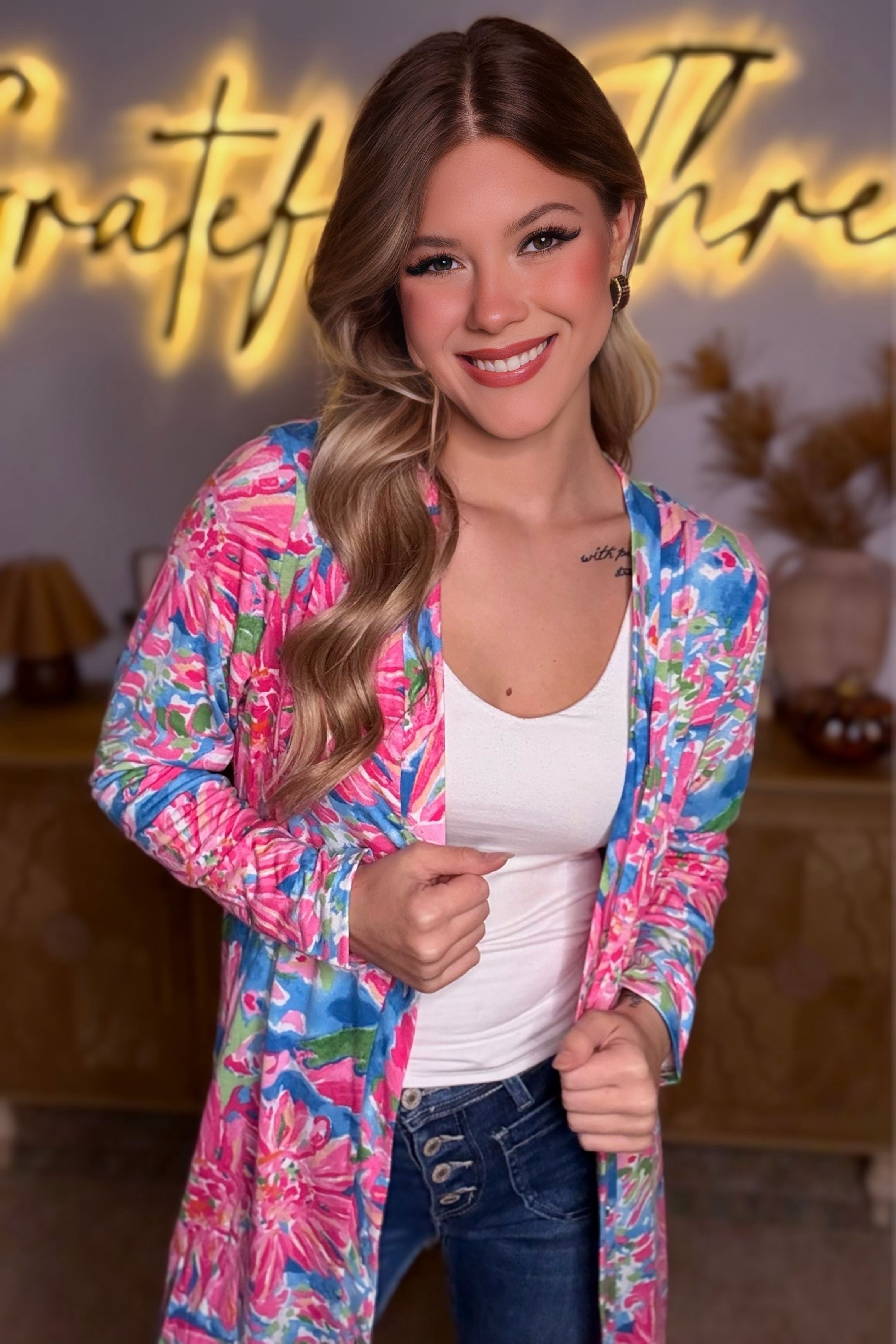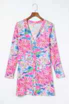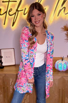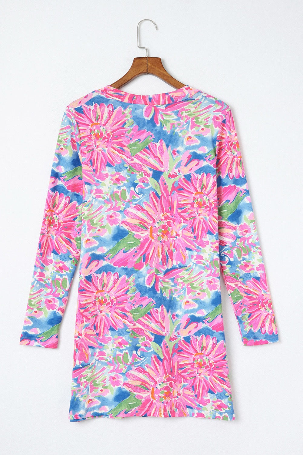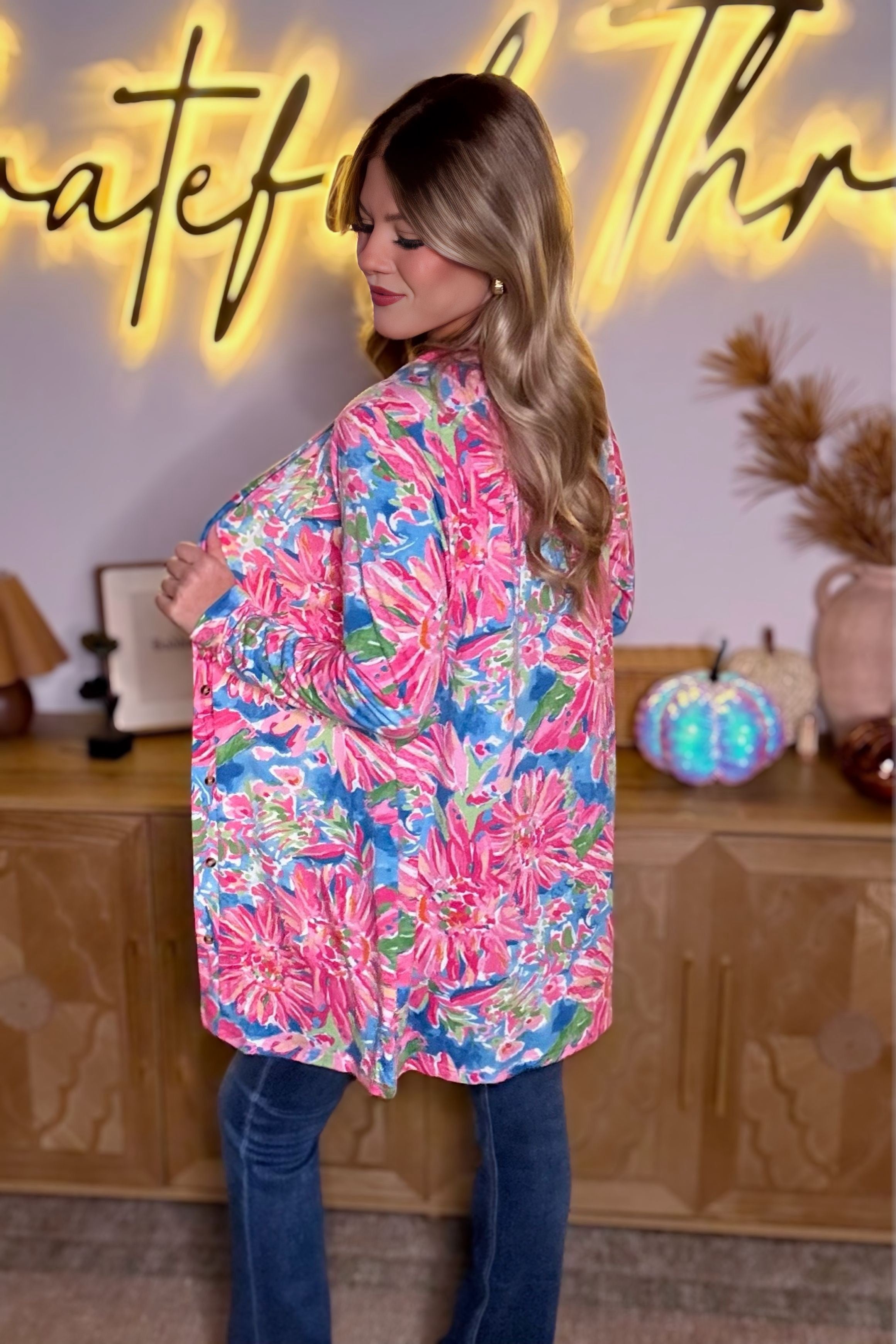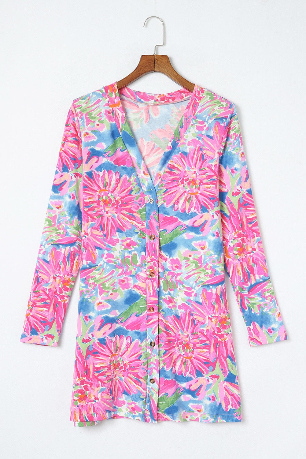 Pink Flower Print Long Sleeve Button Up Cardigan